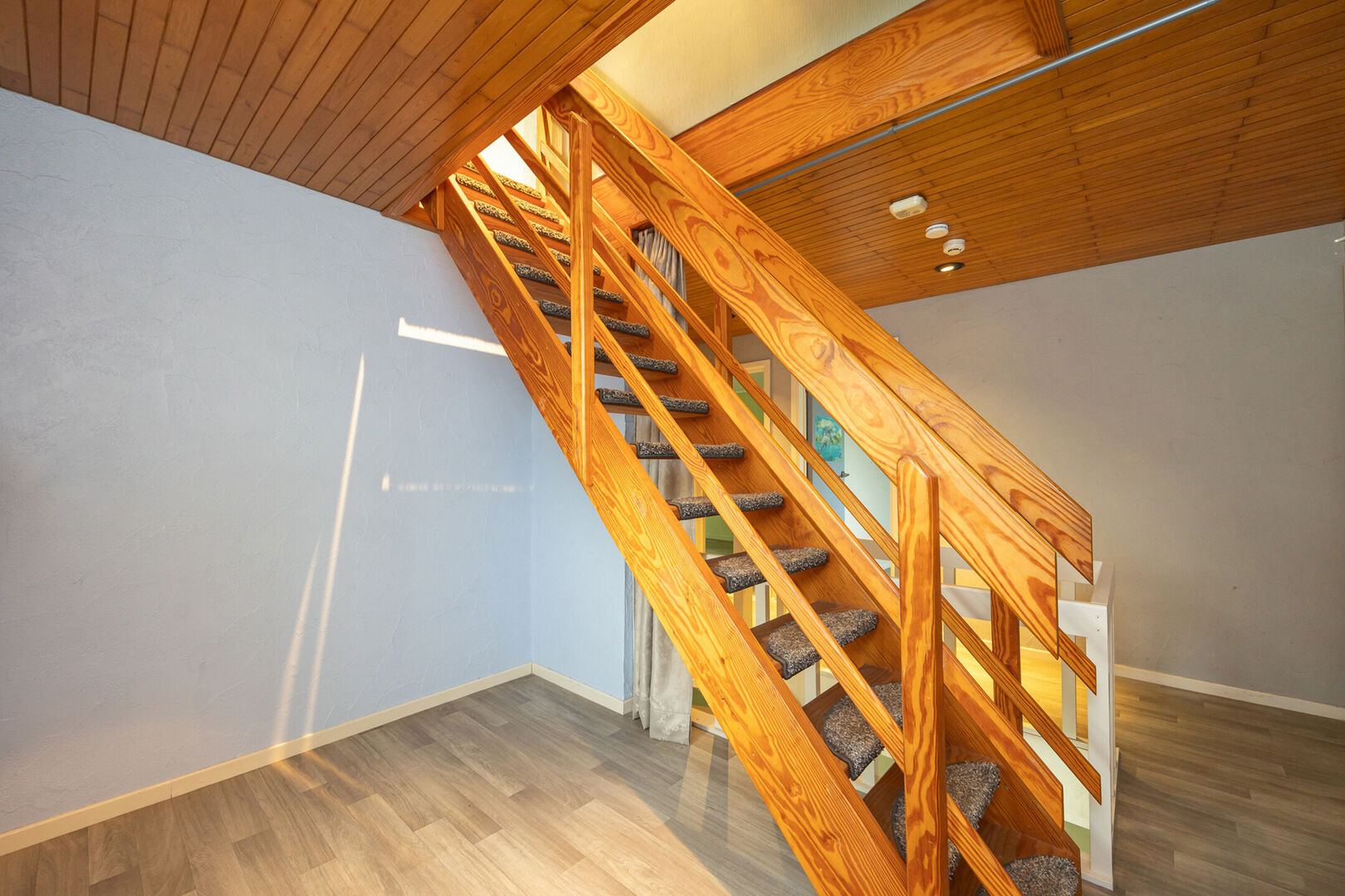 Via een vaste houten trap bereiken we de tweede verdieping, ingericht met een zeer ruime slaapkamer en een extra toilet.