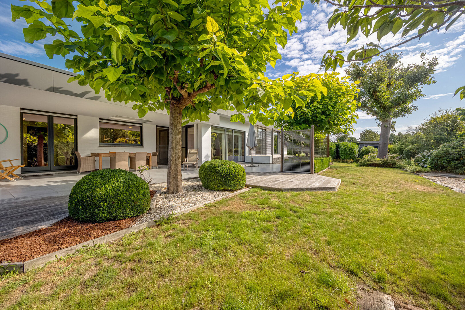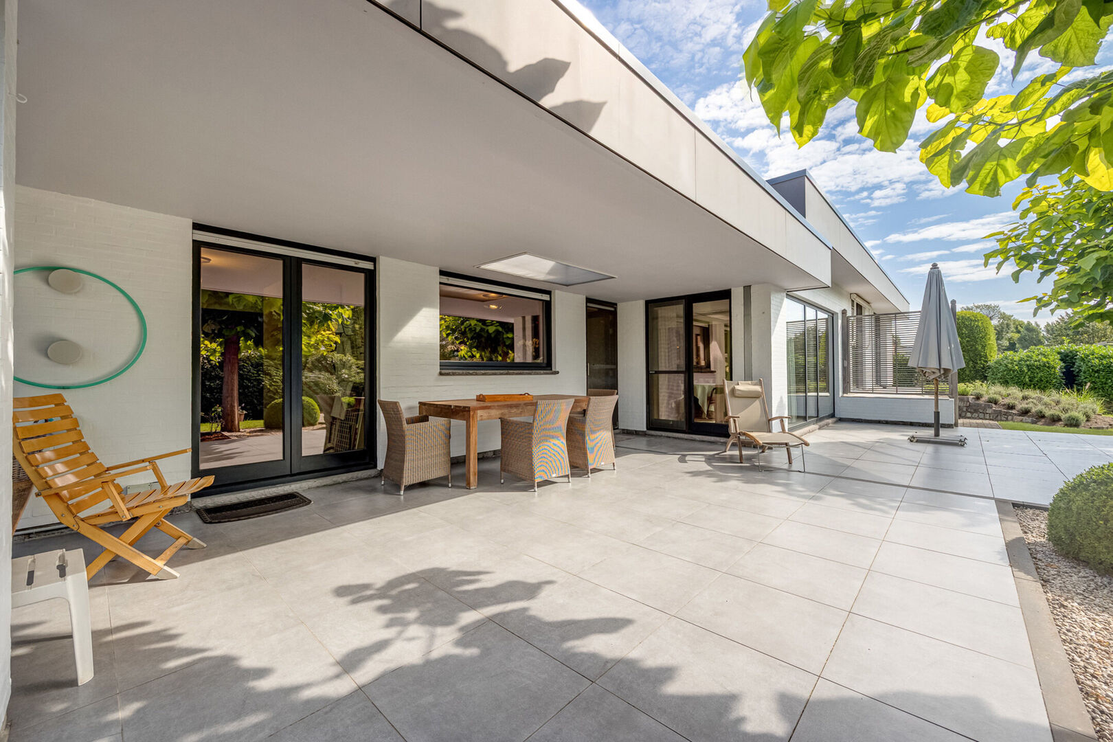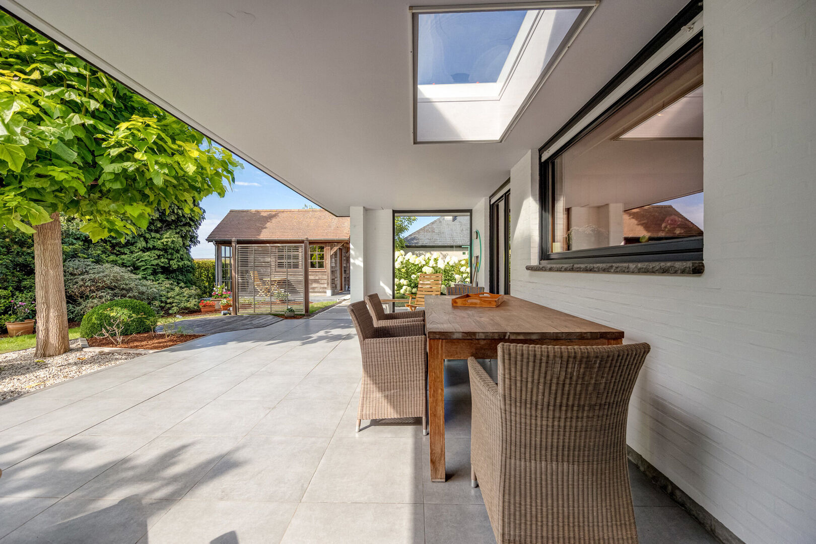 Het gedeeltelijk overdekt terras maakt buiten genieten mogelijk in elk seizoen.