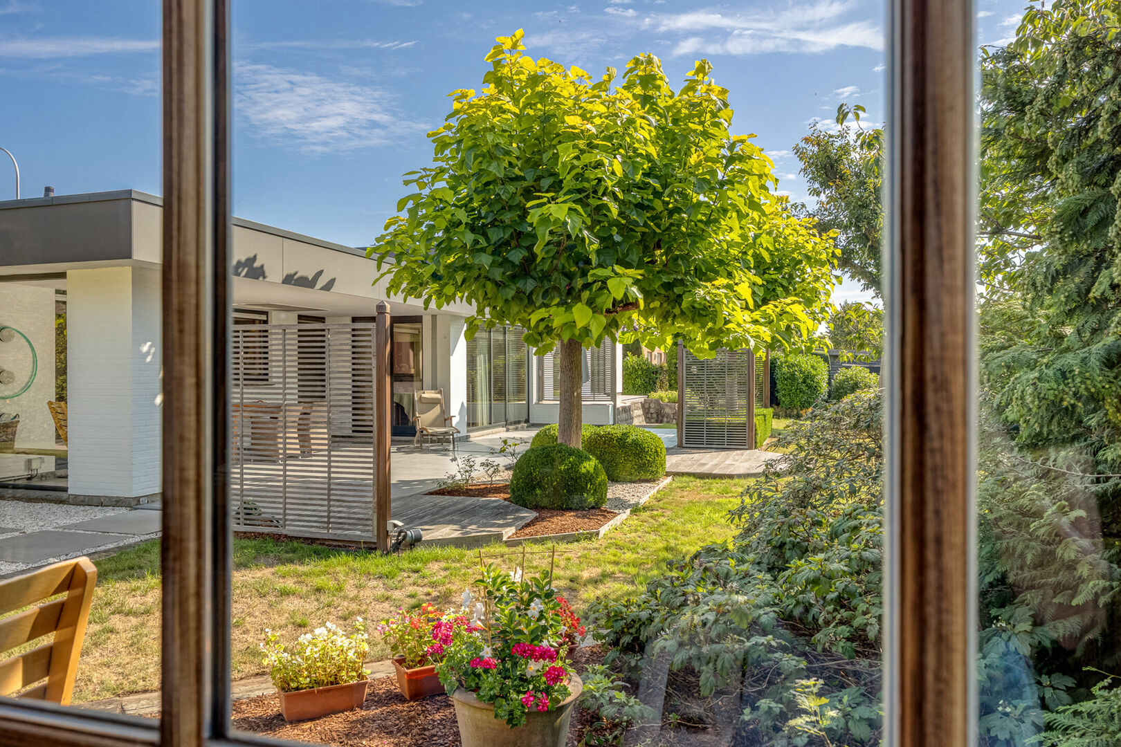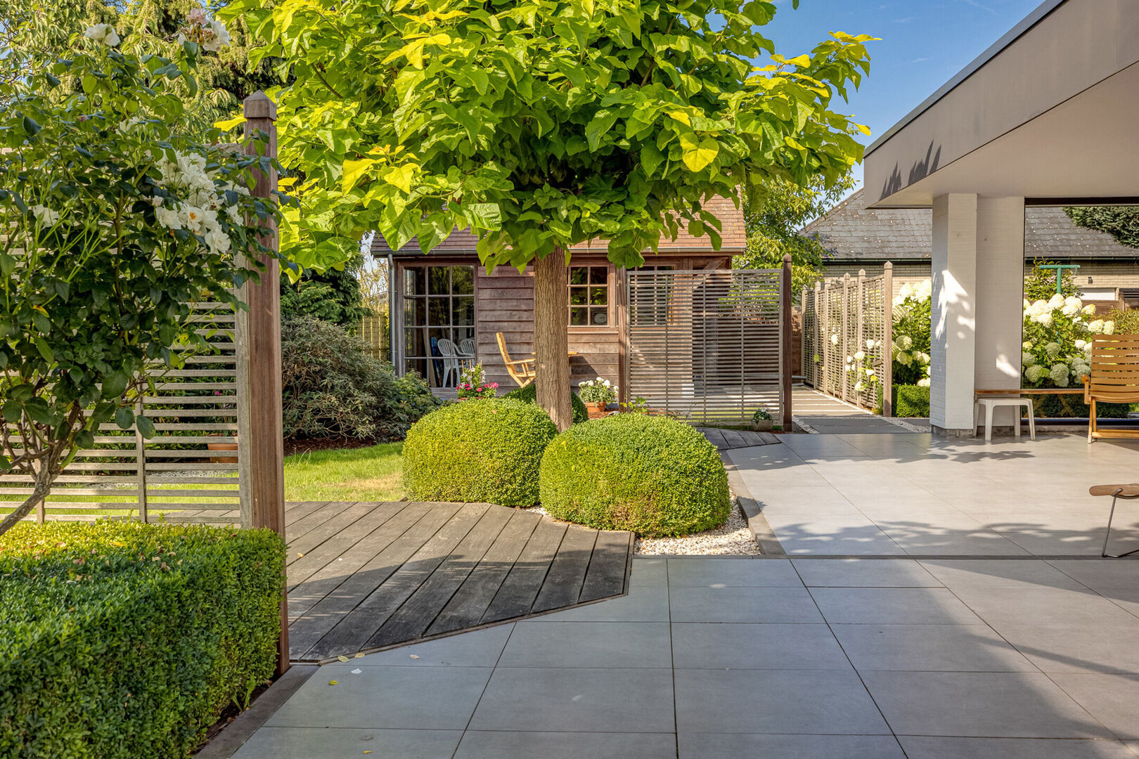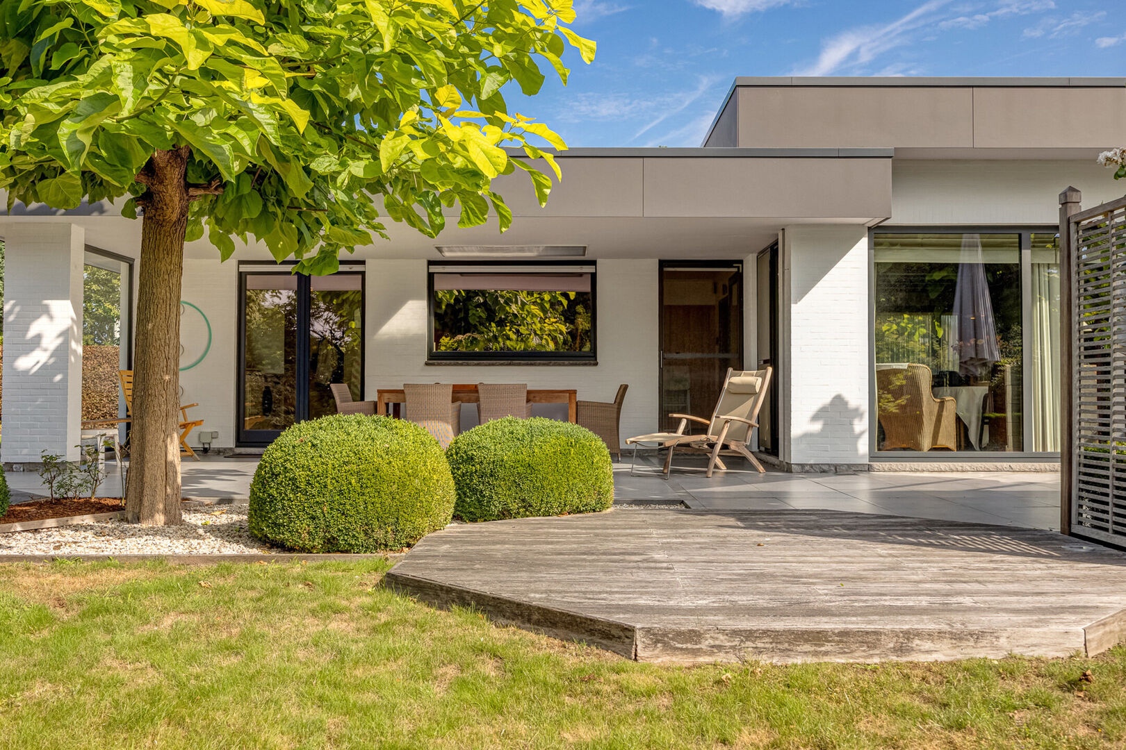 Het gedeeltelijk overdekt terras maakt buiten genieten mogelijk in elk seizoen.