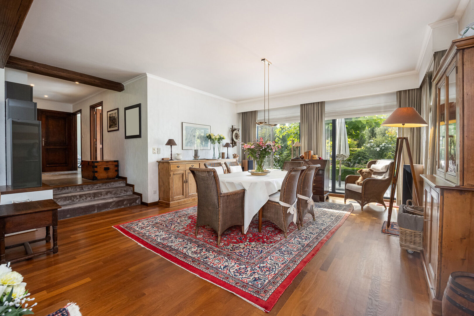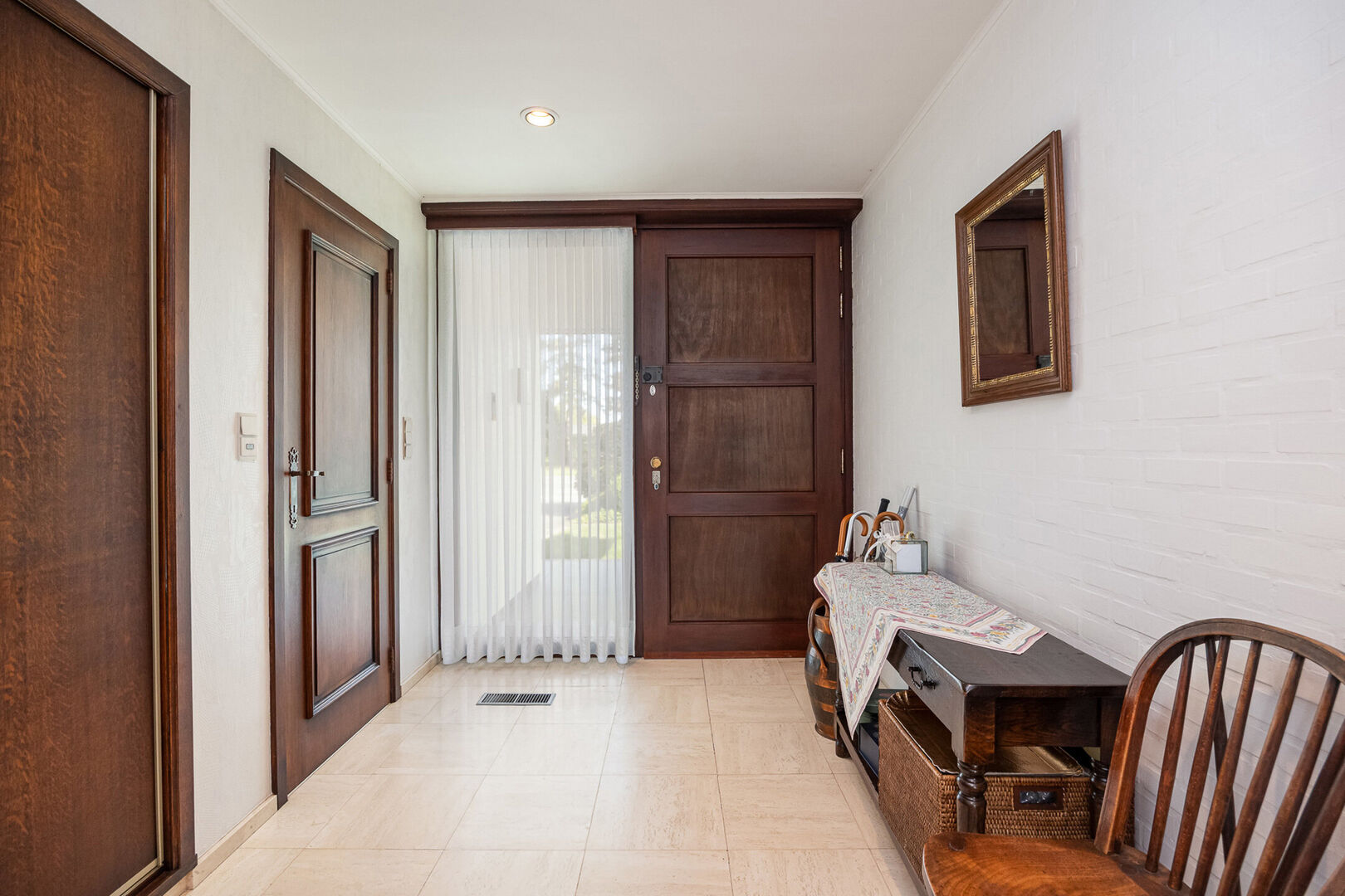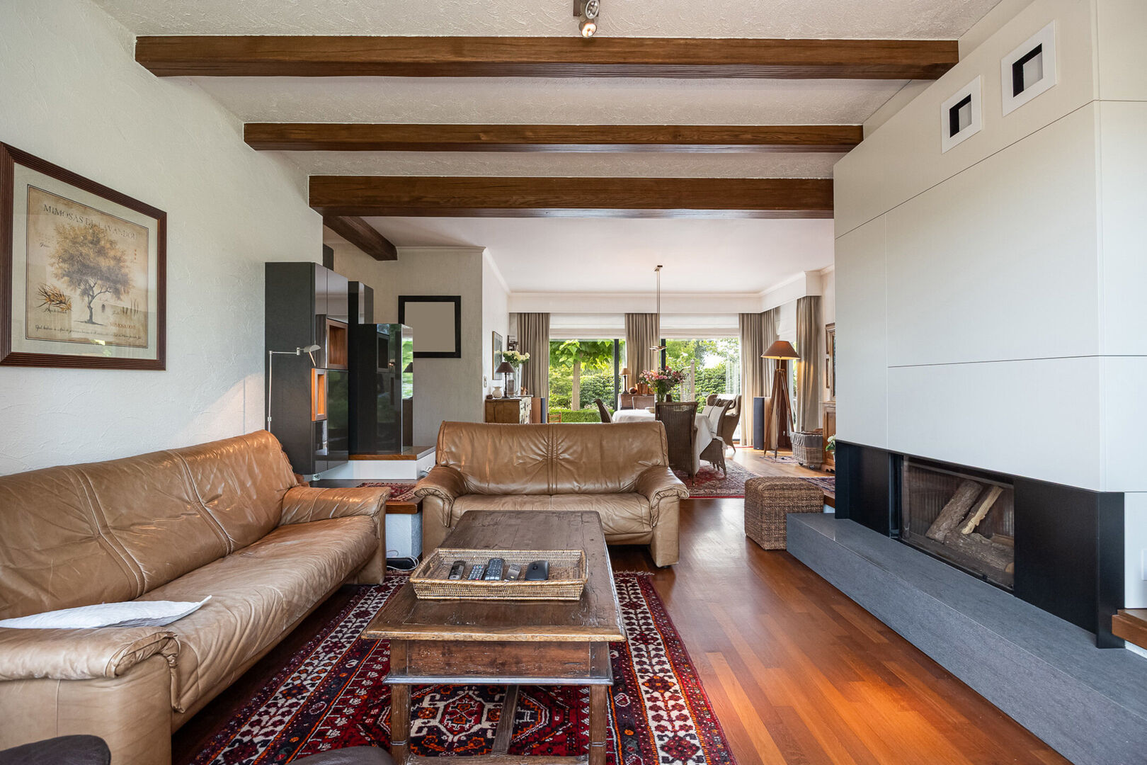 Ontdek deze lichtrijke, charmante gelijkvloerse villa, gelegen op de Nieuwe Baan in Belsele, een centrale en vlot bereikbare verbindingsas met een uitstekende bereikbaarheid naar omliggende gemeenten en voorzieningen.Bij binnenkomst wordt u verwelkomd door een ruime inkomhal met gastentoilet, waarna u doorloopt naar de sfeervolle leefruimte. De combinatie van een zit-eetgedeelte met hoogwaardige parketvloer nodigt uit tot gezellige avonden bij de open haard, terwijl de grote ramen een prachtig panoramisch uitzicht bieden op het omliggende groen.