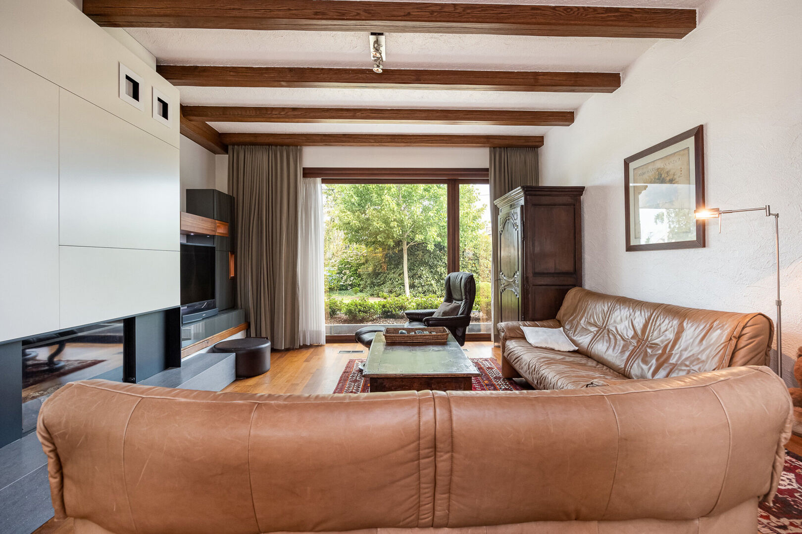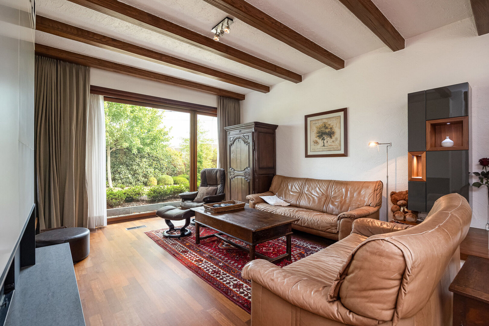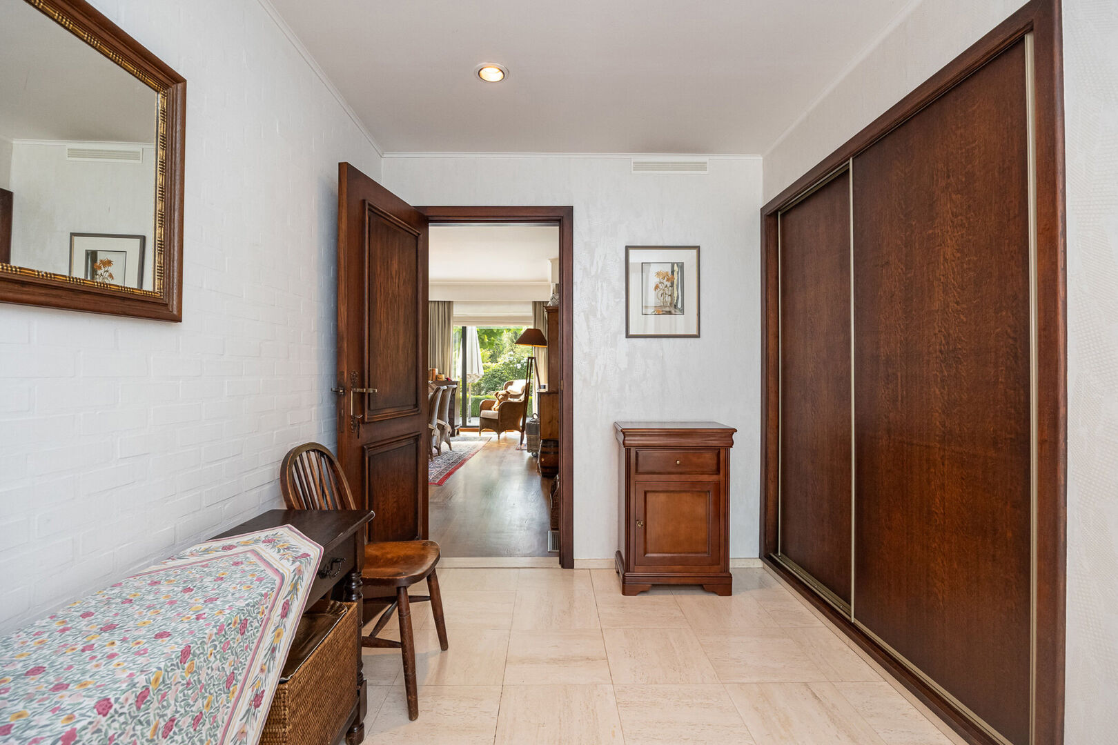 Ontdek deze lichtrijke, charmante gelijkvloerse villa, gelegen op de Nieuwe Baan in Belsele, een centrale en vlot bereikbare verbindingsas met een uitstekende bereikbaarheid naar omliggende gemeenten en voorzieningen.Bij binnenkomst wordt u verwelkomd door een ruime inkomhal met gastentoilet, waarna u doorloopt naar de sfeervolle leefruimte. De combinatie van een zit-eetgedeelte met hoogwaardige parketvloer nodigt uit tot gezellige avonden bij de open haard, terwijl de grote ramen een prachtig panoramisch uitzicht bieden op het omliggende groen.