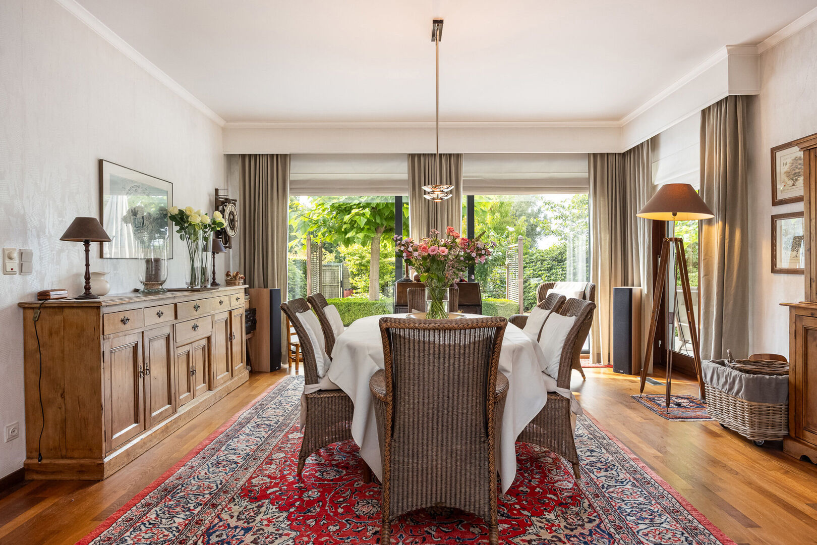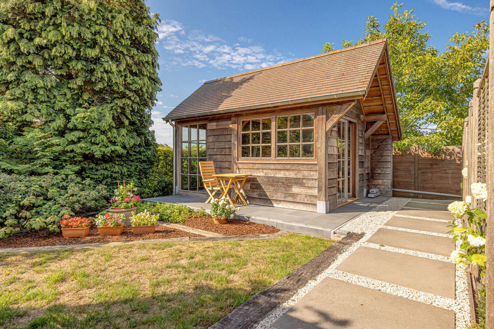 De tuin is prachtig aangelegd en voorzien van een groot eiken bijgebouw dat tal van mogelijkheden biedt.