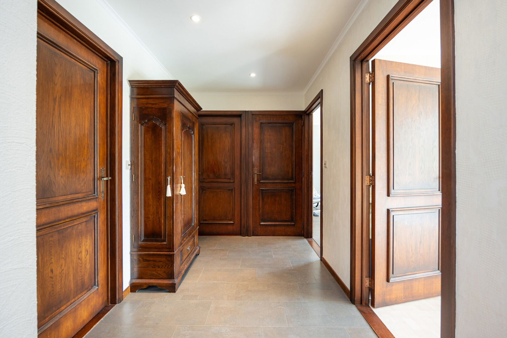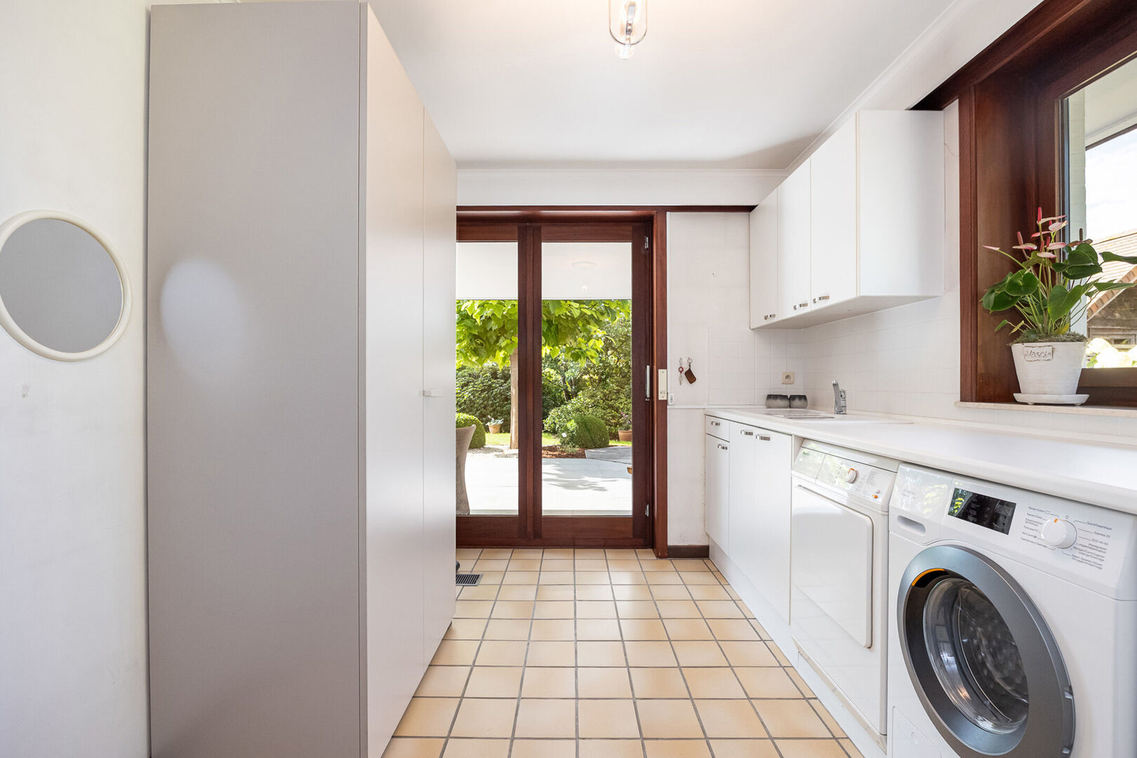 Aansluitend bevindt zich de keuken die rechtstreeks toegang geeft tot zowel de praktische bijkeuken als de dubbele inpandige garage.