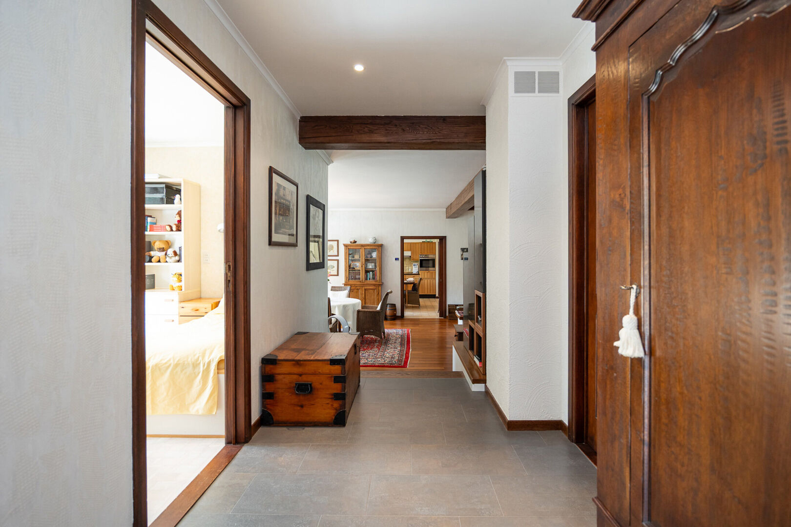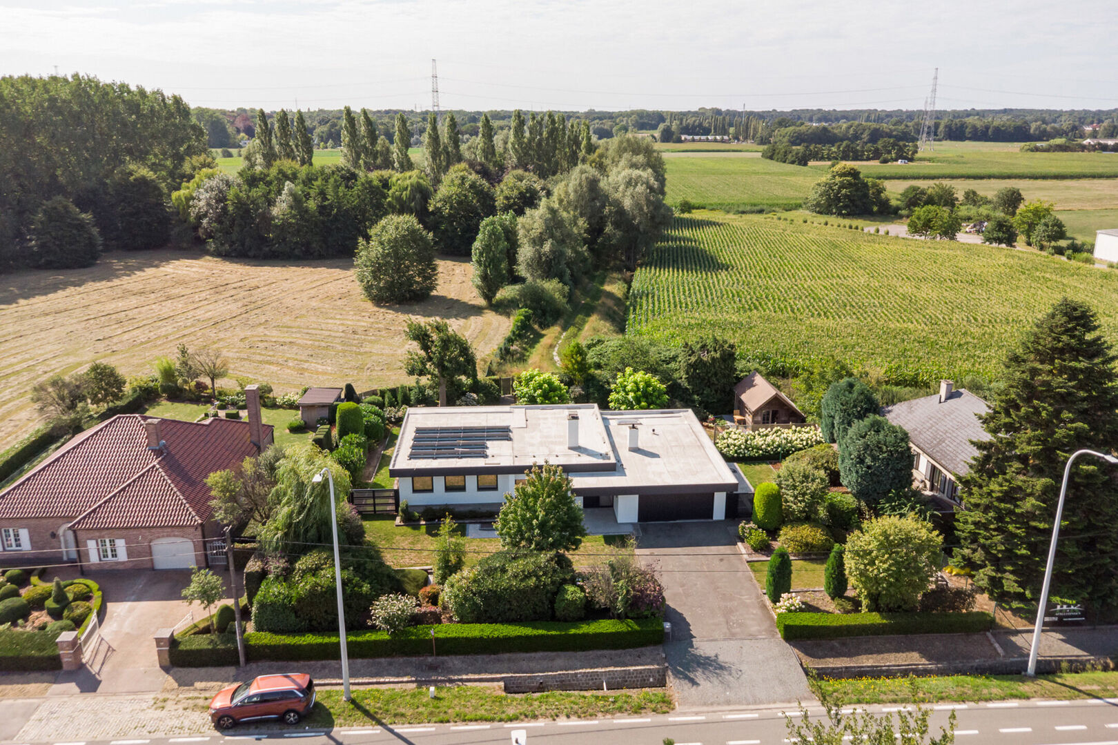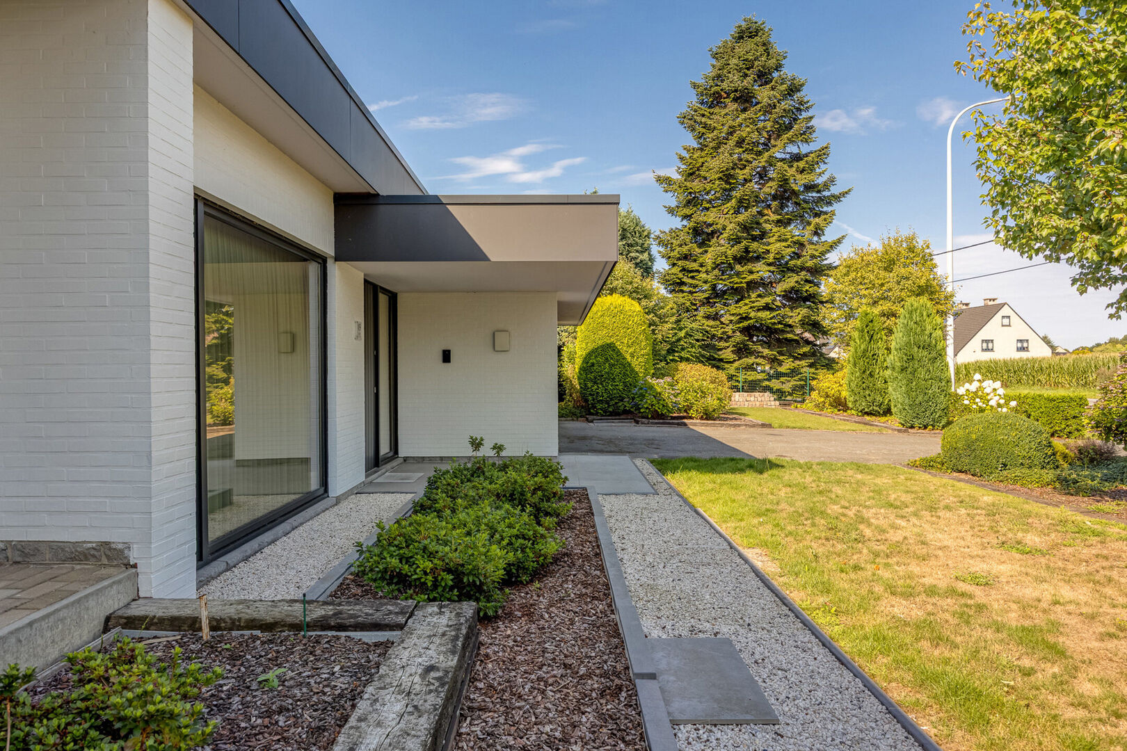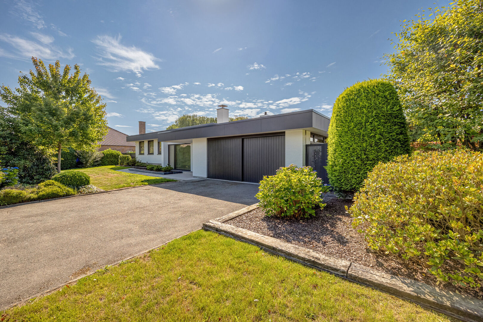 Vanuit de leefruimte bereikt u via enkele treden het slaapgedeelte. De bungalow is gebouwd volgens een uniek concept waarbij het hoogteverschil tussen het woongedeelte en de slaapkamers zorgt voor een uitzonderlijk gevoel van ruimte en privacy. De master bedroom geeft rechtstreeks toegang tot de ruime badkamer met ligbad, dubbele lavabo en toilet. Daarnaast zijn er nog twee mooie slaapkamers, elk met uitzicht op tuin en velden.
