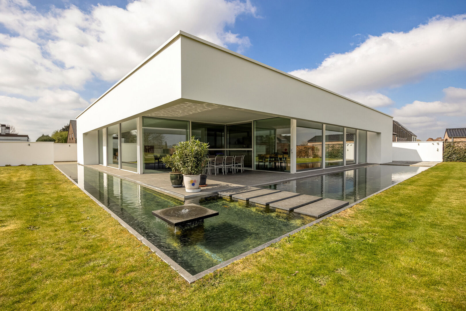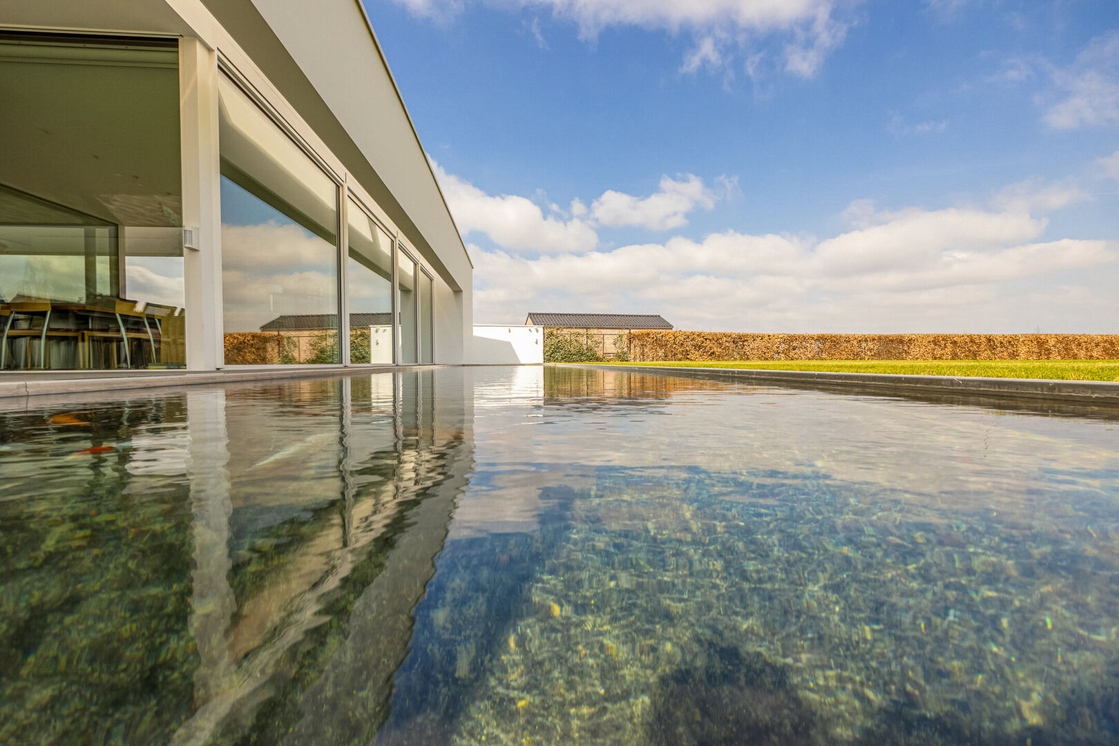 Deze luxueuze laagbouwvilla is een unieke kans voor wie op zoek is naar een oase van rust. Gelegen op een uitgestrekt perceel biedt deze woning niet alleen een uitzonderlijke woonkwaliteit, maar ook een unieke verbinding met de tuin en het water eromheen.