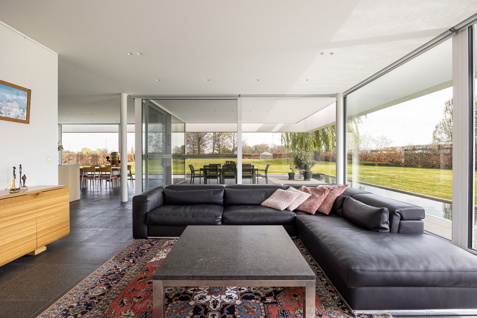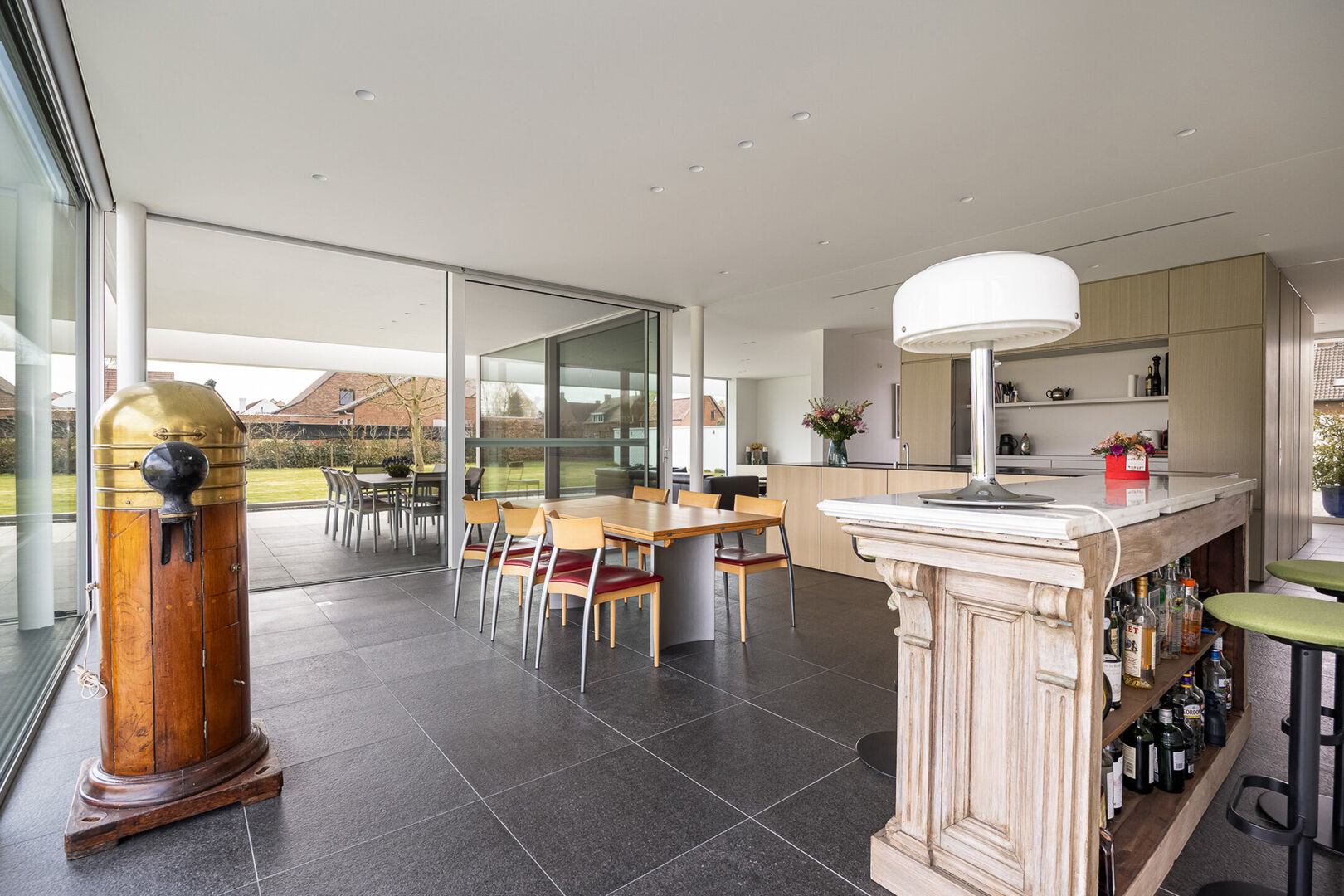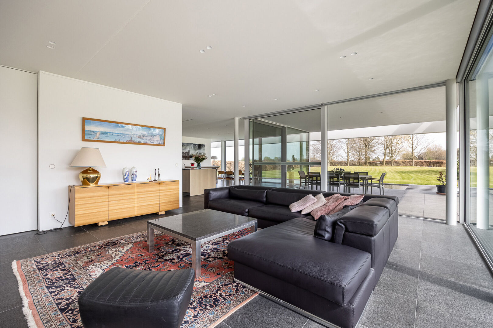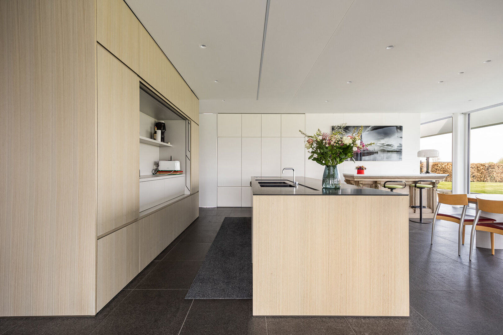 In keuken en zithoek kunnen de gigantische raampartijen worden geopend en kan men genieten van het terras, op hetzelfde vloerniveau als binnen. De vloeren zijn basalt zowel in de leefruimte als op het schitterende terras.