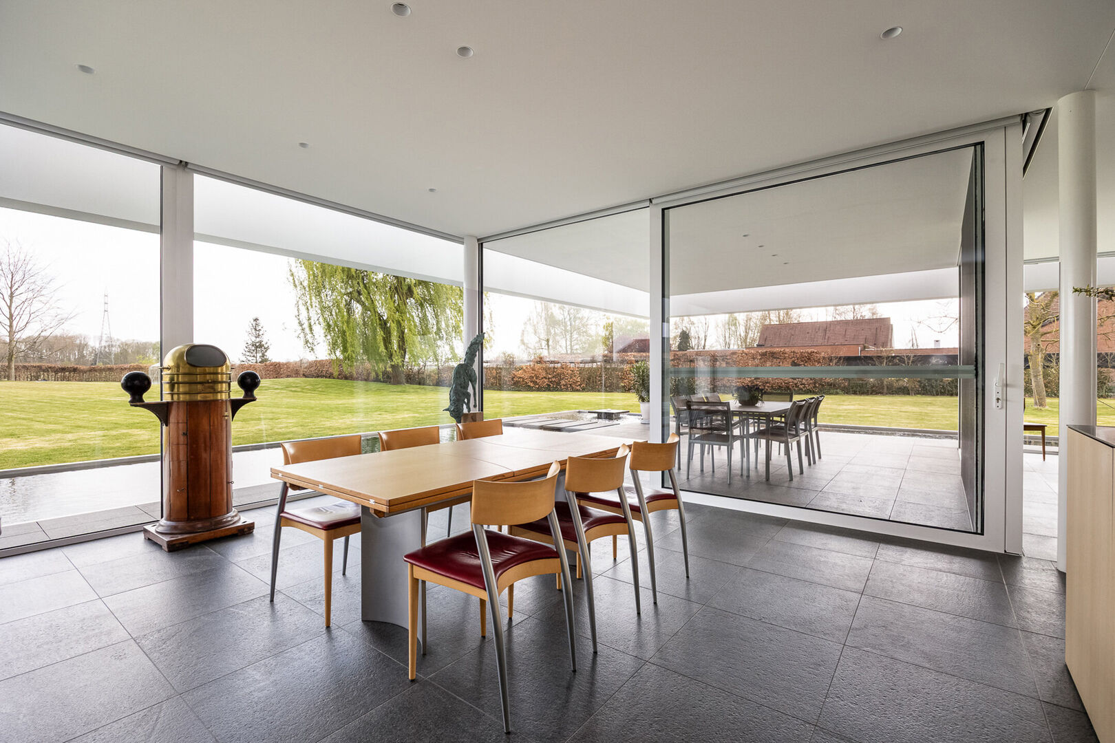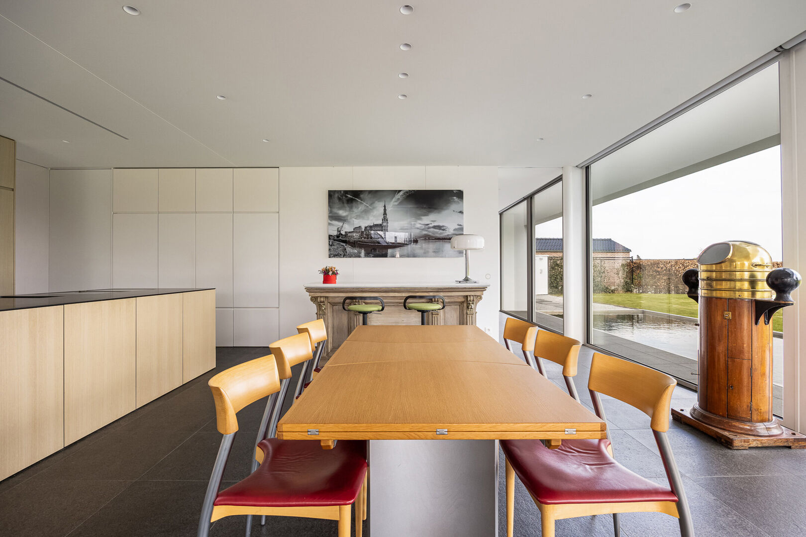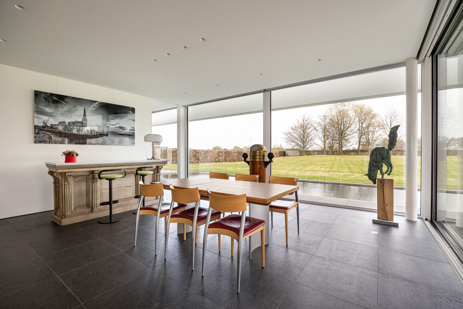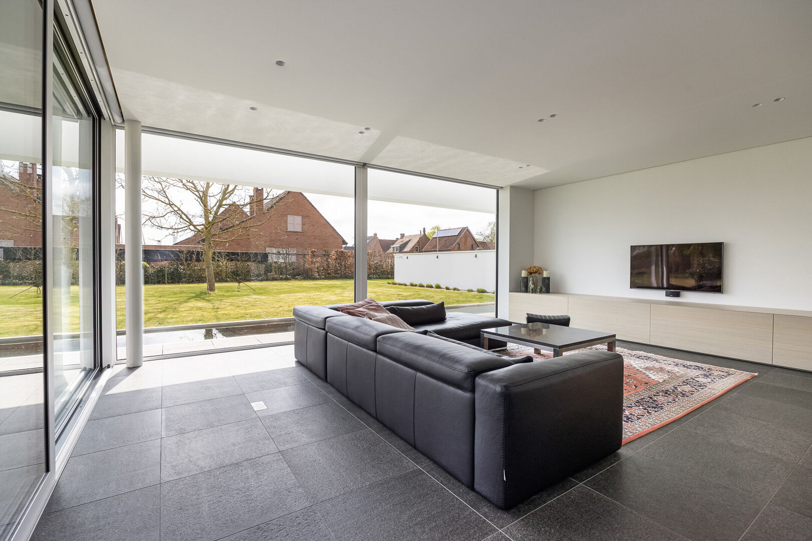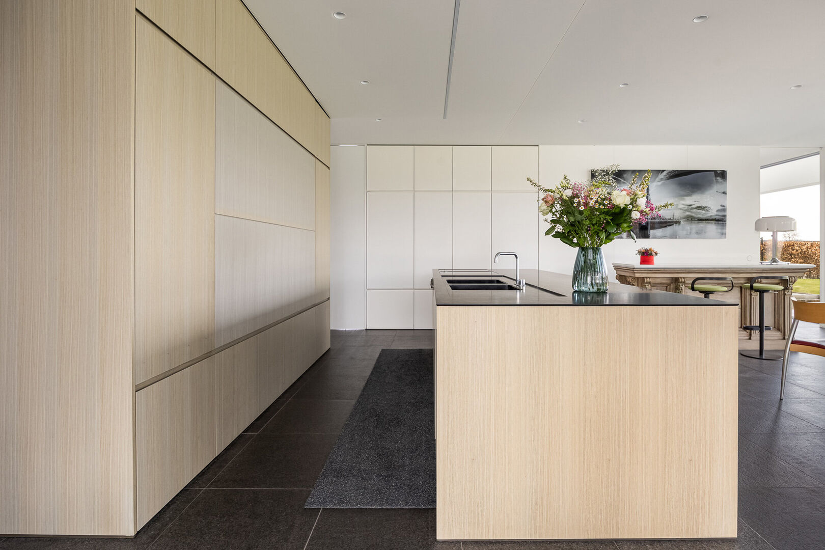 In keuken en zithoek kunnen de gigantische raampartijen worden geopend en kan men genieten van het terras, op hetzelfde vloerniveau als binnen. De vloeren zijn basalt zowel in de leefruimte als op het schitterende terras.