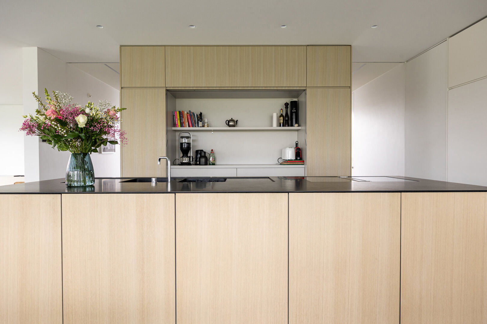 De leefkeuken is een droom voor elke hobbykok met zijn hoogwaardige toestellen, veel opbergruimte en een stijlvol kookeiland. Ook in de keuken is het mogelijk een rustige sfeer te creëren aangezien zowat alle toestellen aan het zicht kunnen worden onttrokken.