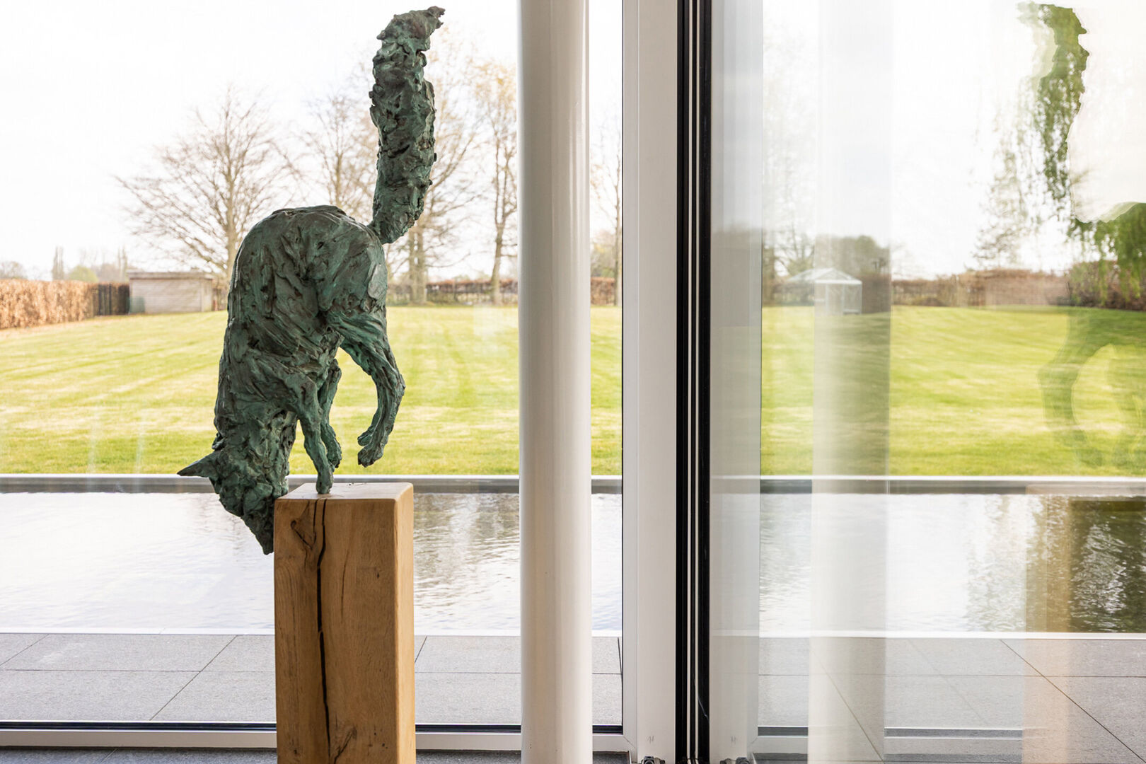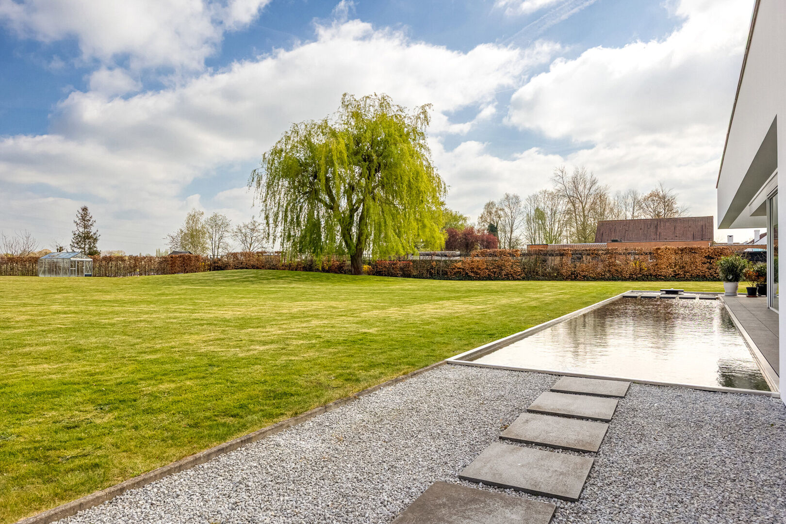 Men kan zowel linksom als rechtsom en bereikt op die manier de leefruimte met grote raampartijen, waardoor het daglicht rijkelijk kan binnenstromen en men een adembenemend zicht heeft op de tuin met zwemvijver en achterliggende velden.