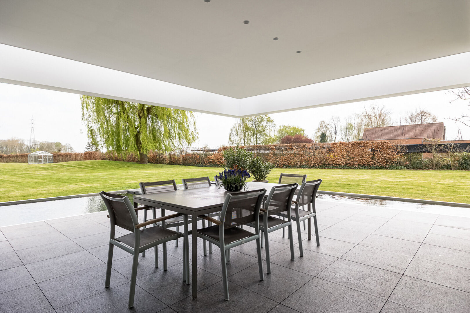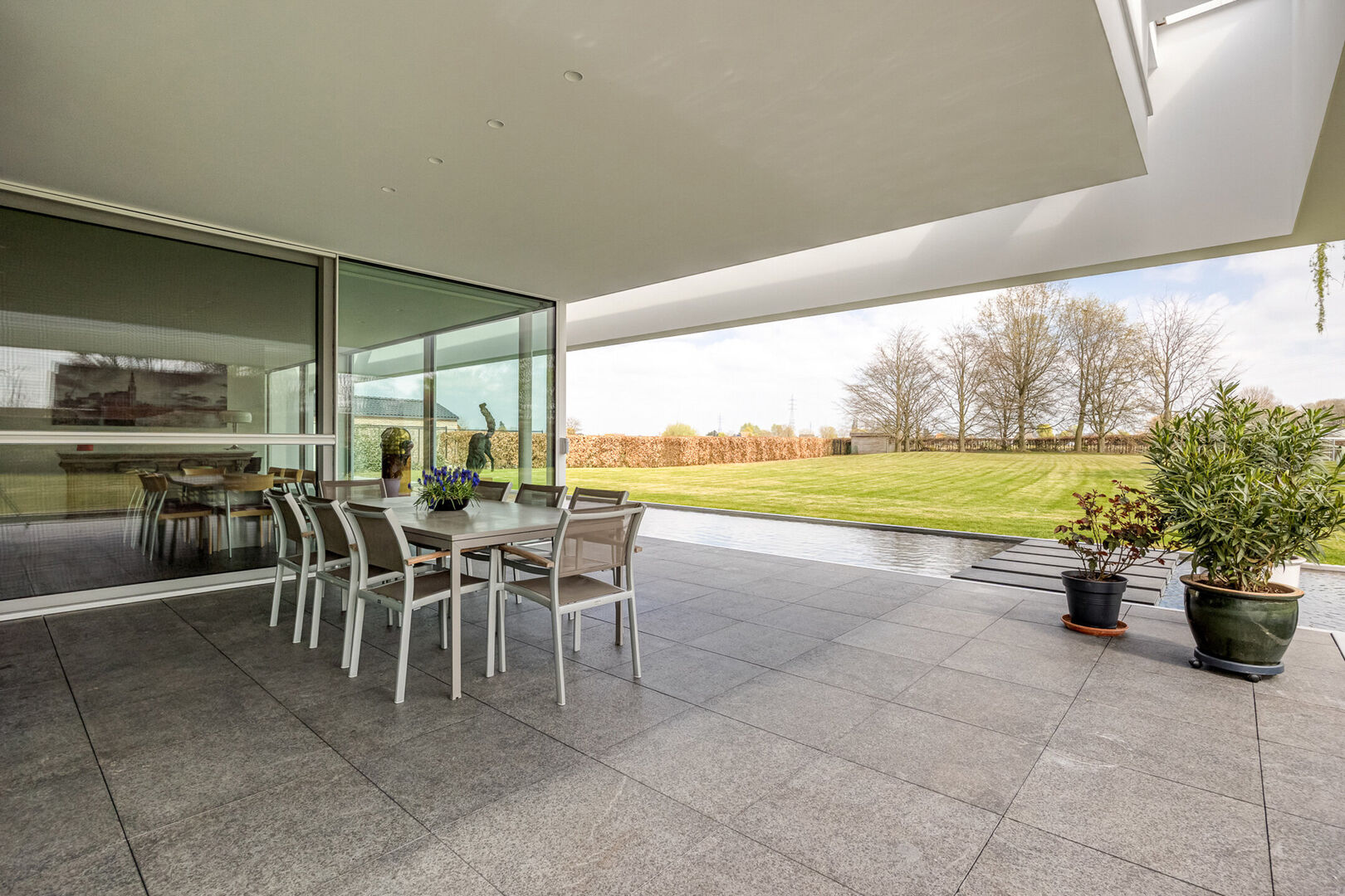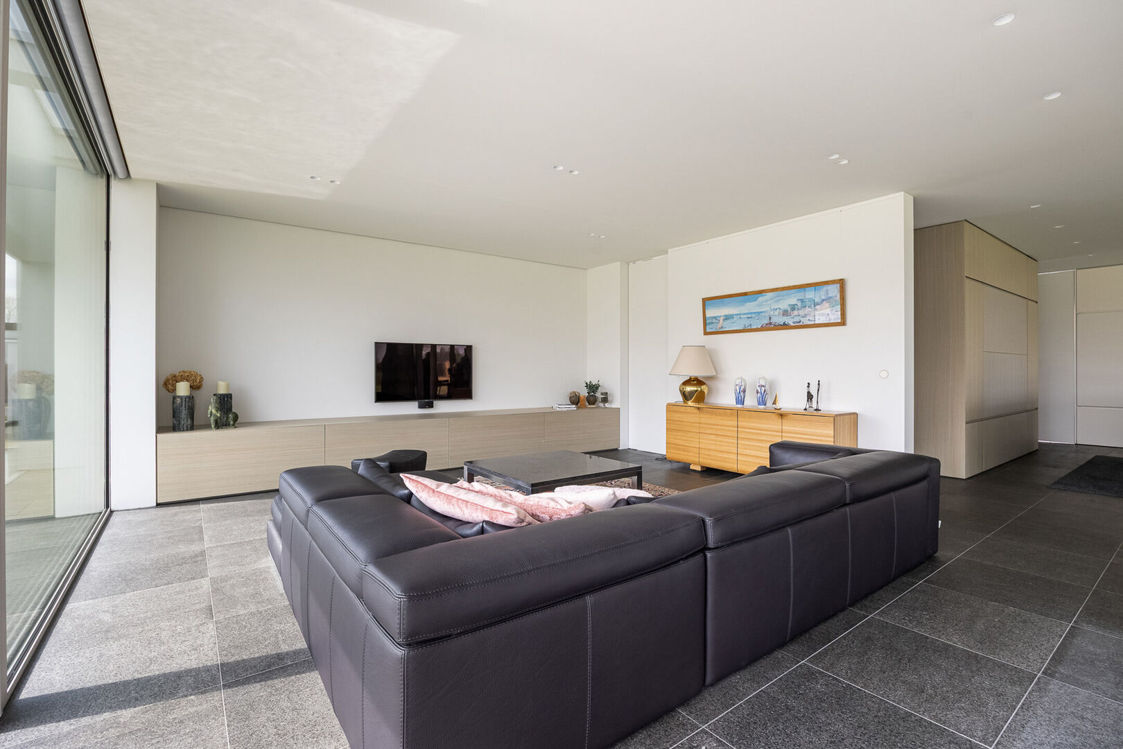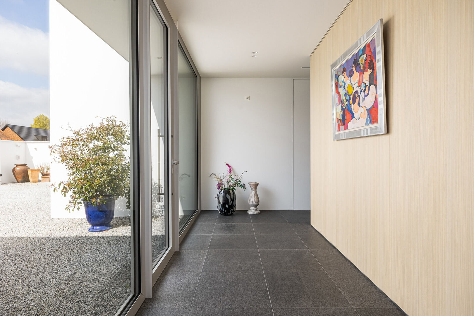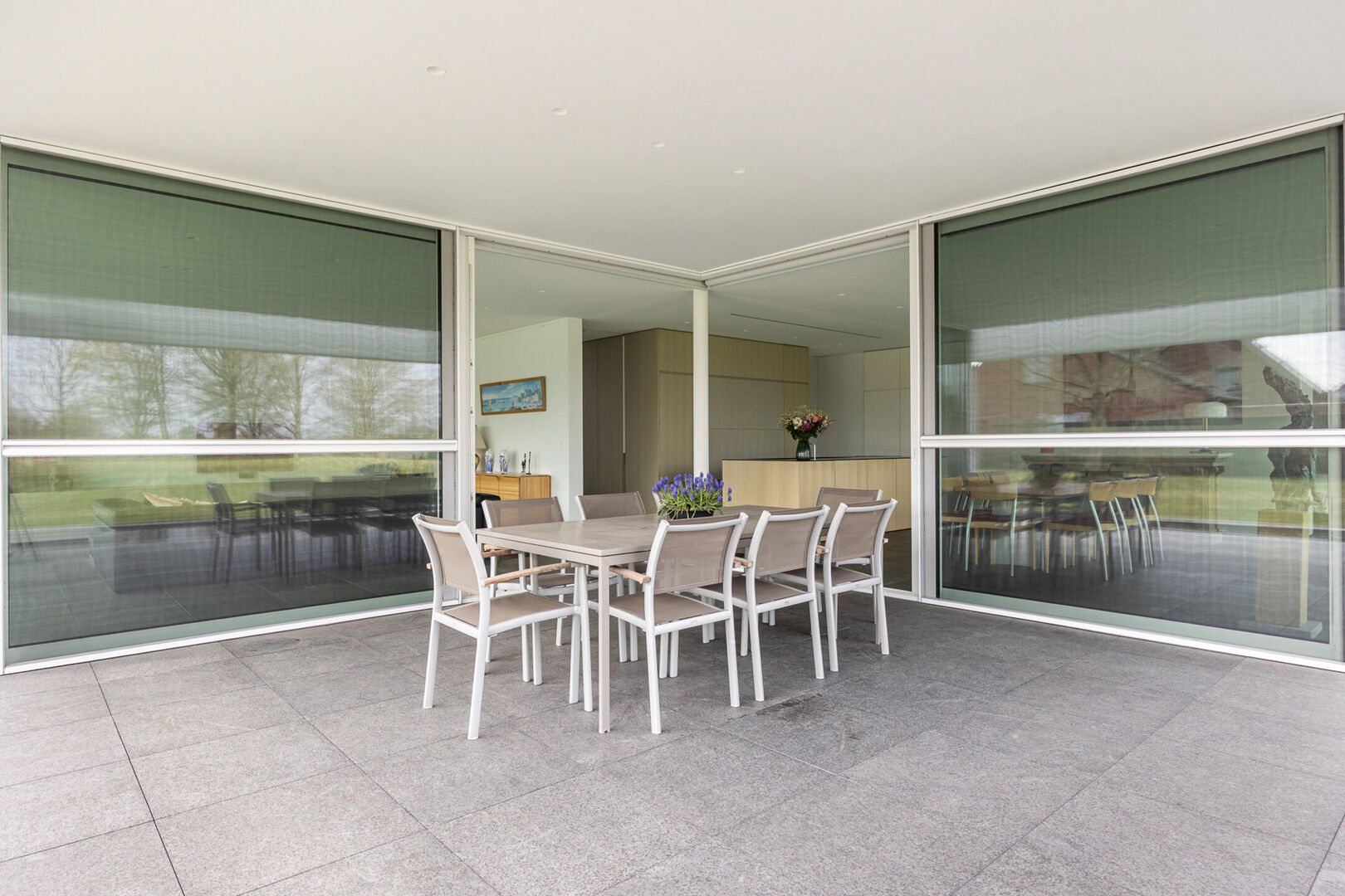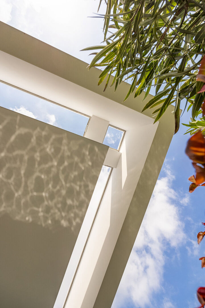 De woning is tot in de puntjes afgewerkt met oog voor detail: doorlopende terrasvloeren creëren een harmonieus lijnenspel van binnen naar buiten, alle ramen aan de zonnige zijde zijn voorzien van zowel binnen- als buitenscreens, en in elke ruimte is een discreet schilderij ophangsysteem geïntegreerd.