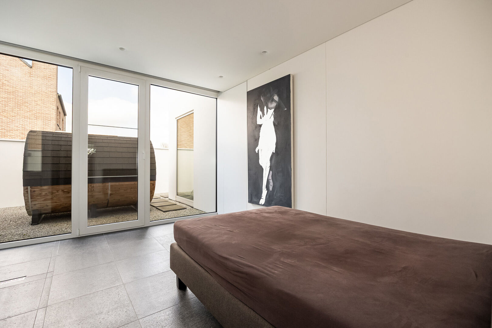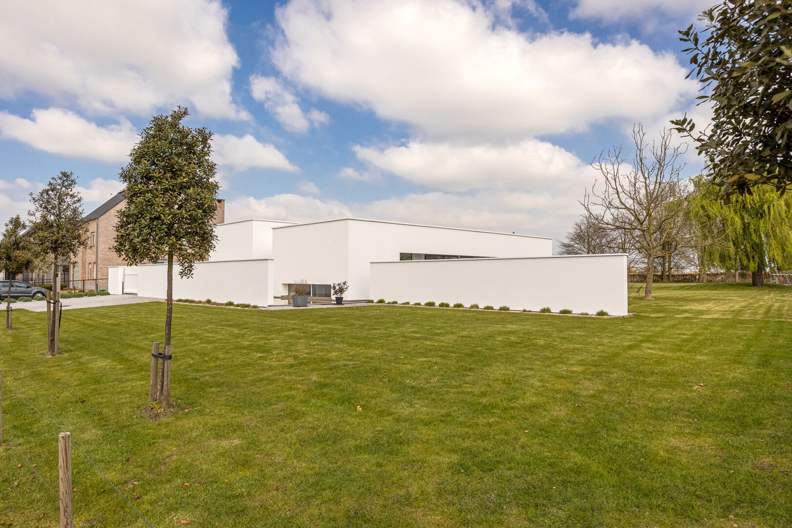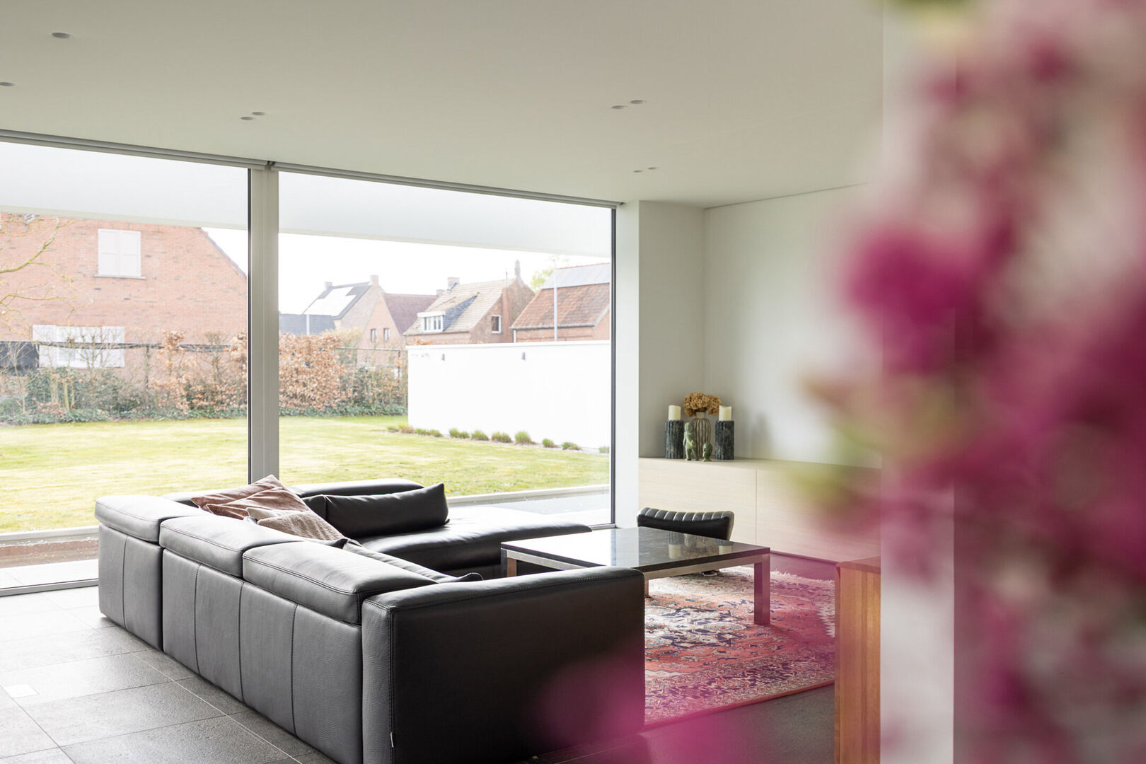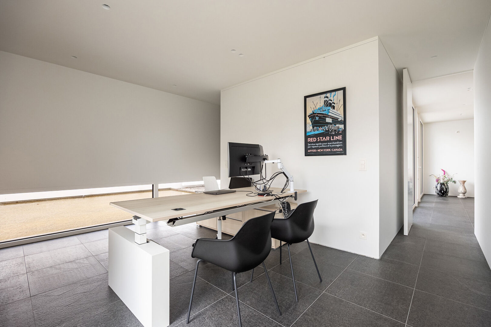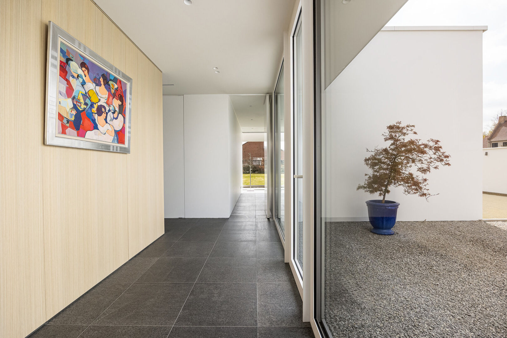 De woning is tot in de puntjes afgewerkt met oog voor detail: doorlopende terrasvloeren creëren een harmonieus lijnenspel van binnen naar buiten, alle ramen aan de zonnige zijde zijn voorzien van zowel binnen- als buitenscreens, en in elke ruimte is een discreet schilderij ophangsysteem geïntegreerd.