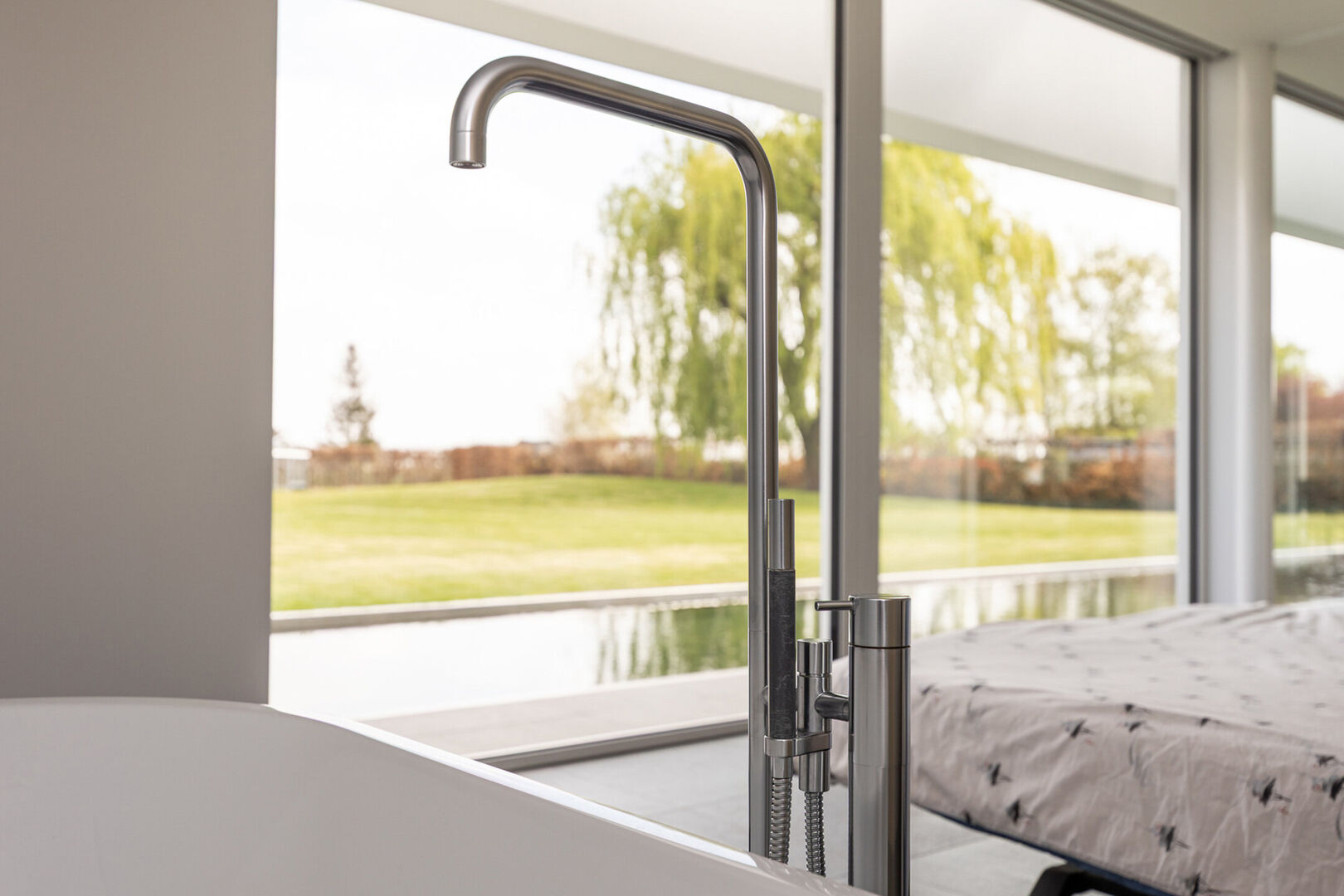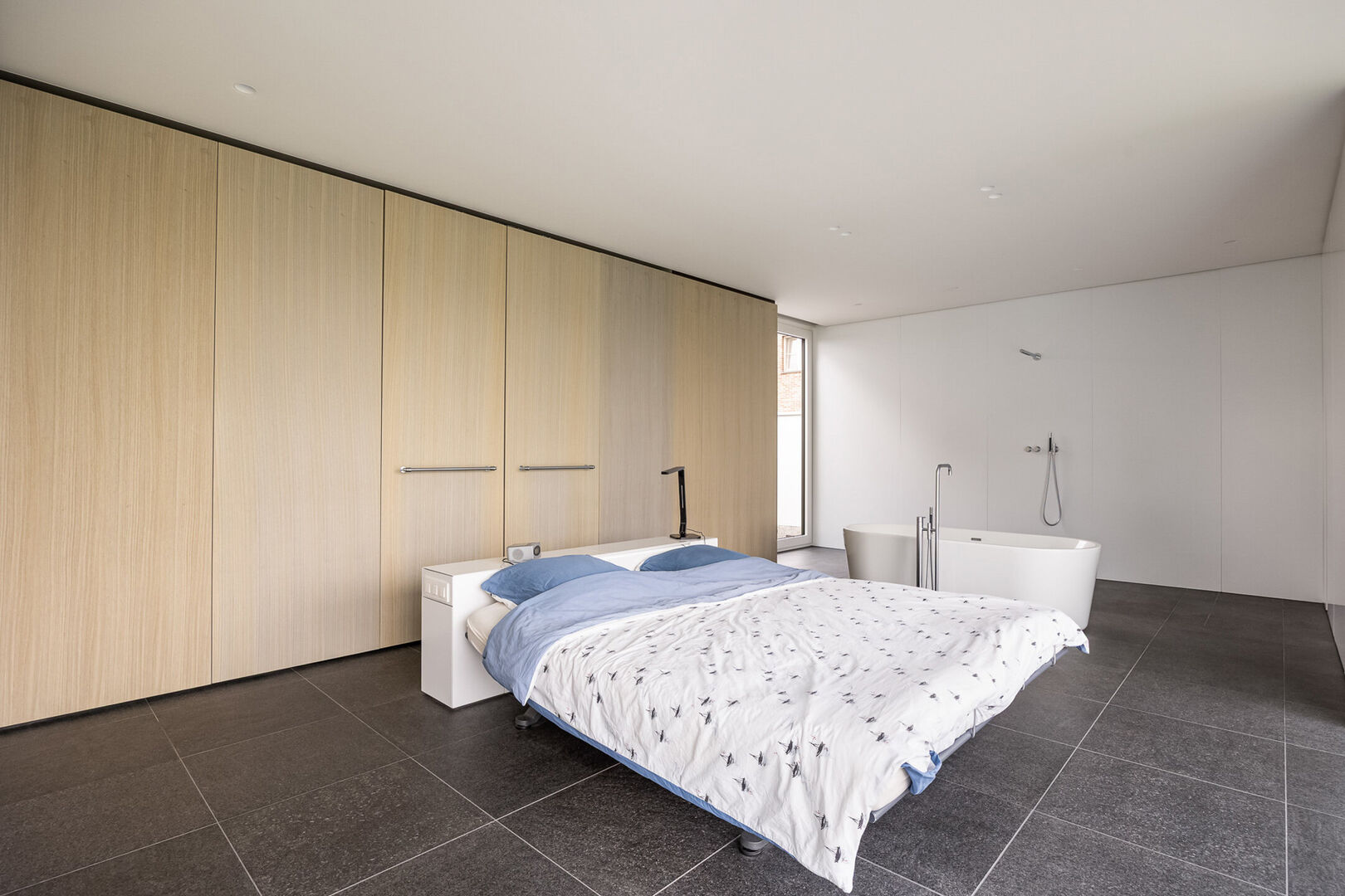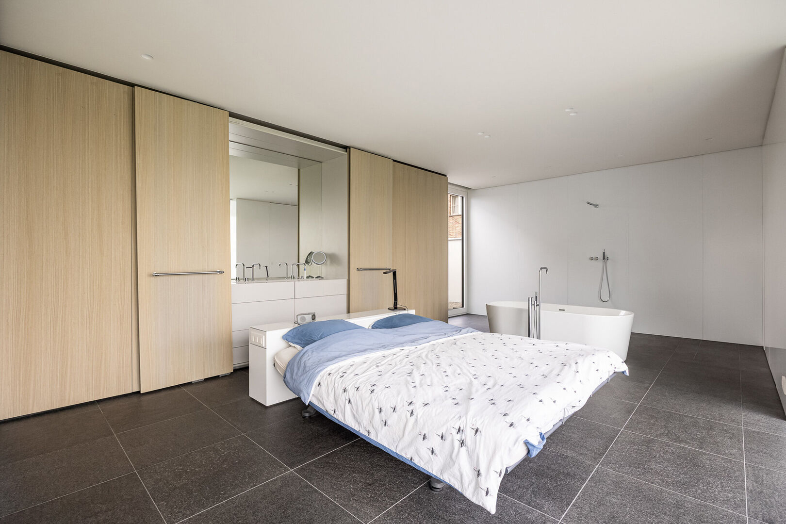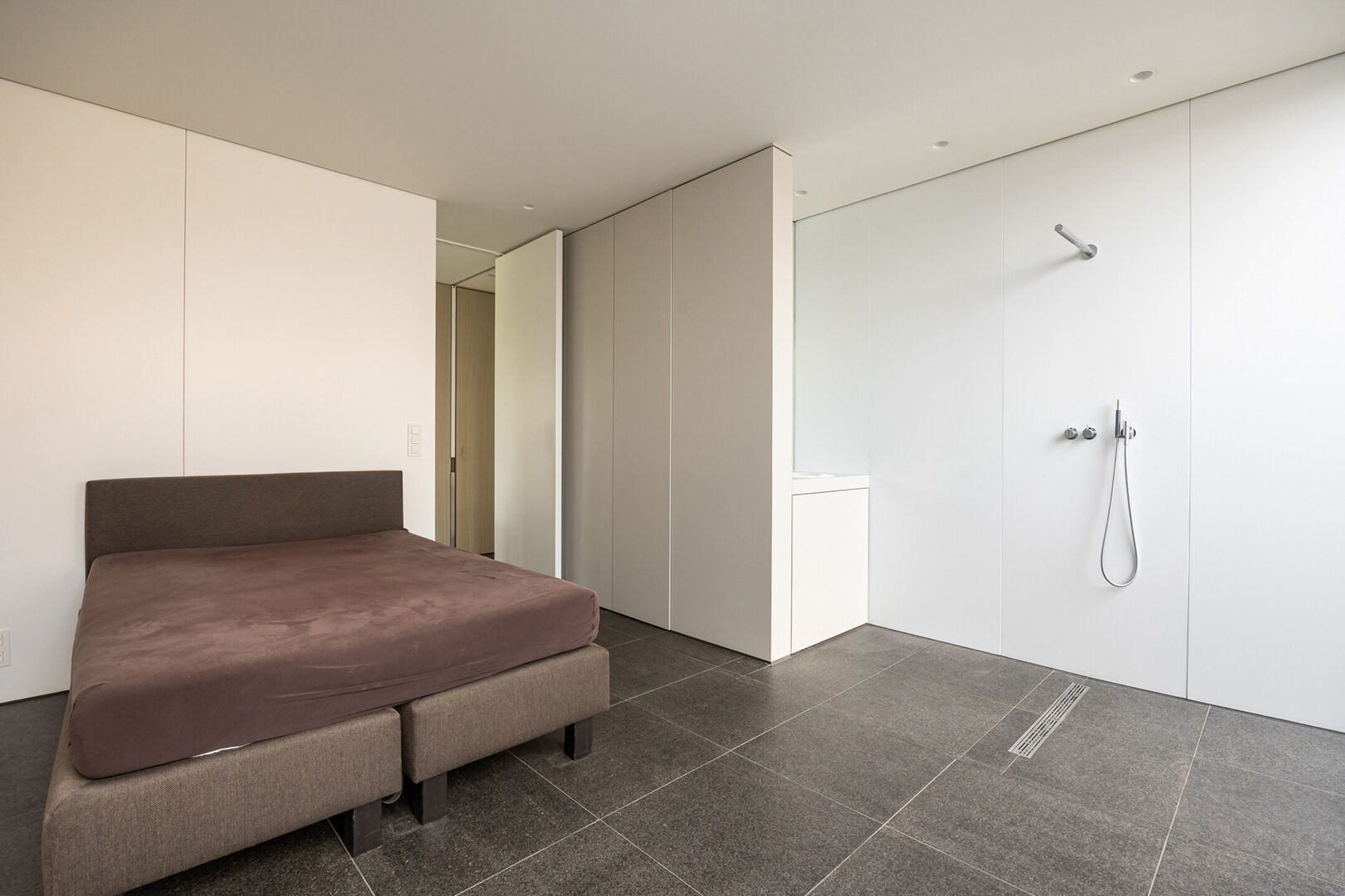 Daarnaast is er een tweede slaapkamer met eigen douche en lavabo. Alle kraanwerk is van Vola.