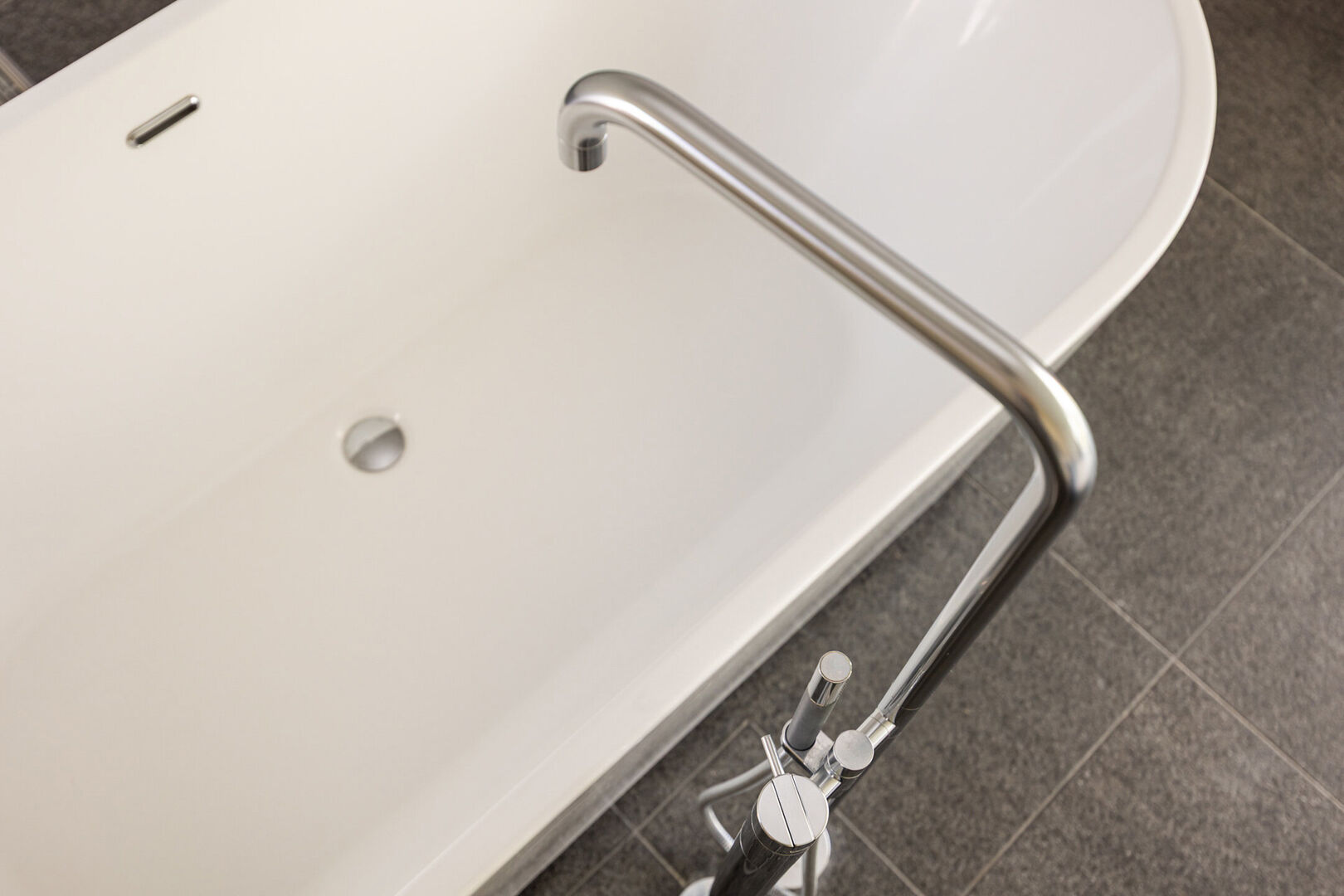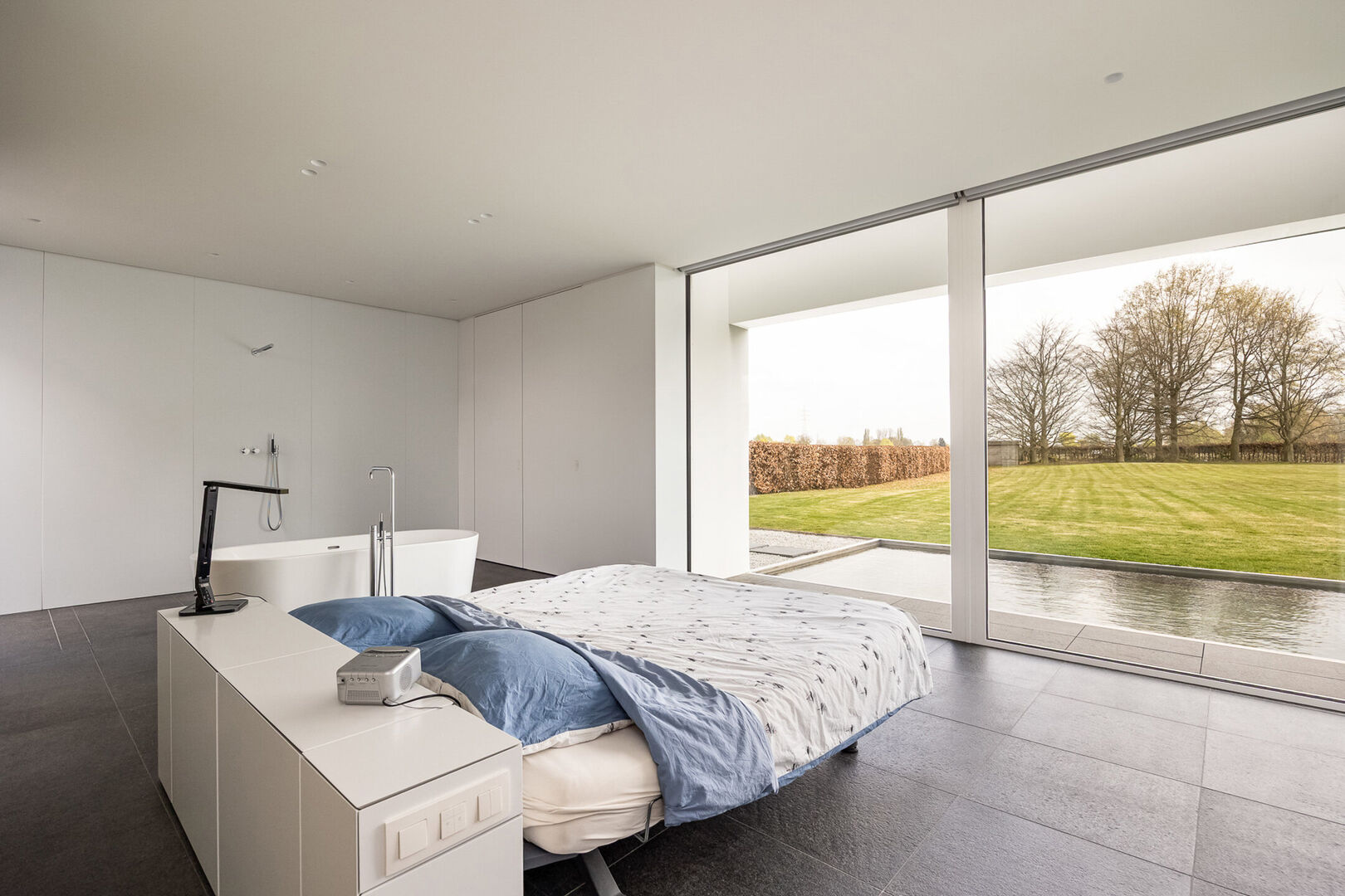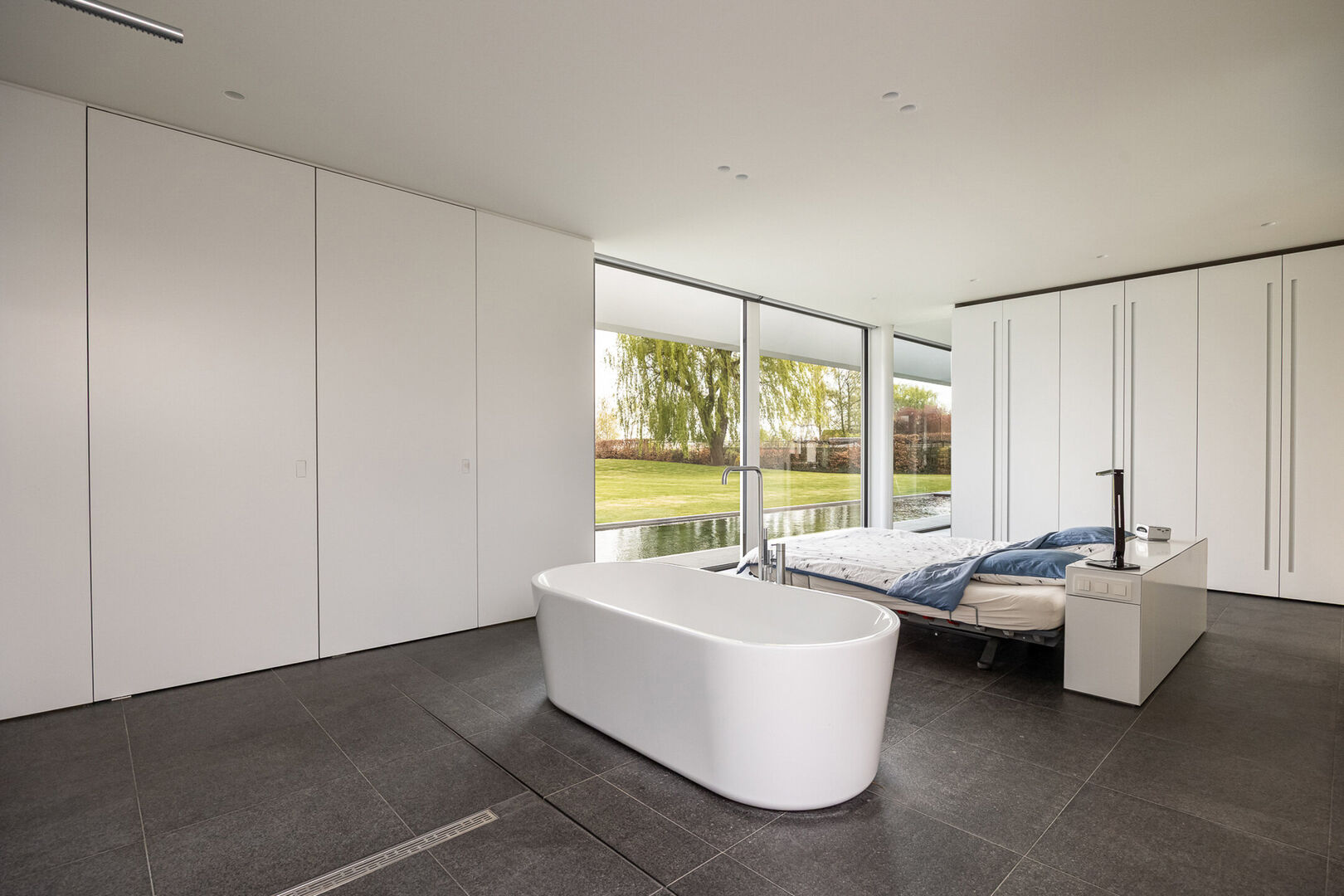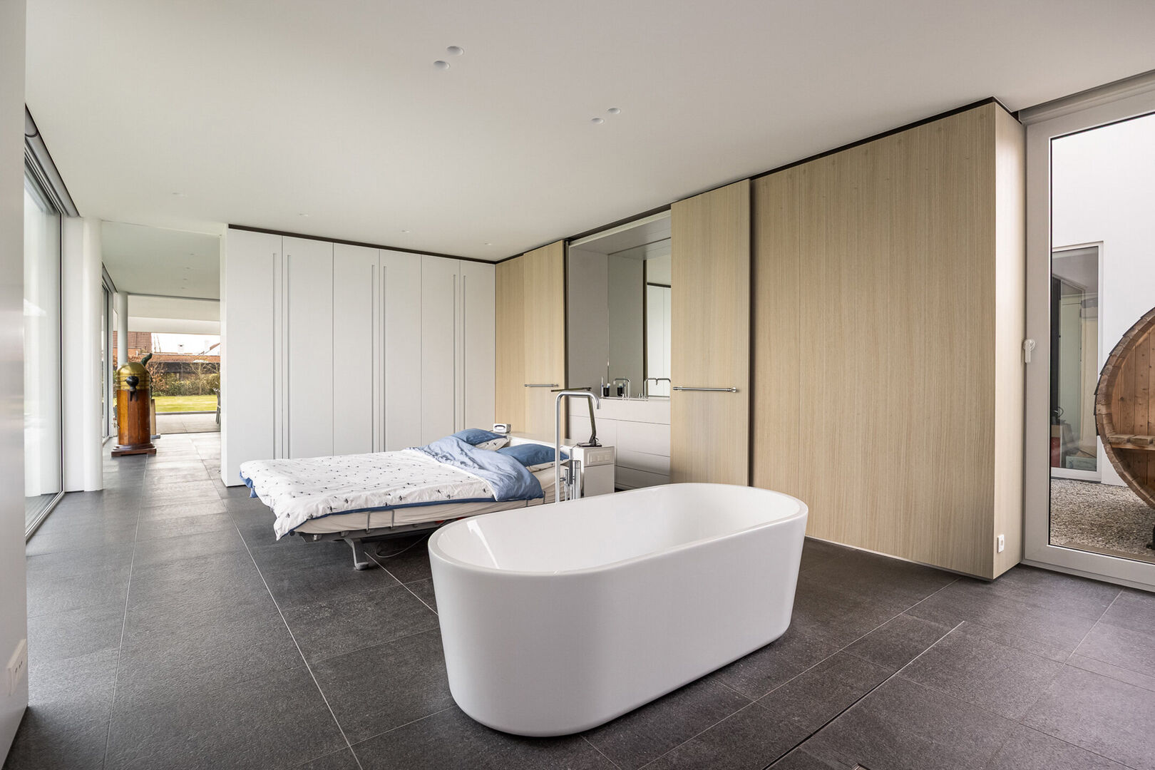 Daarnaast is er een tweede slaapkamer met eigen douche en lavabo. Alle kraanwerk is van Vola.