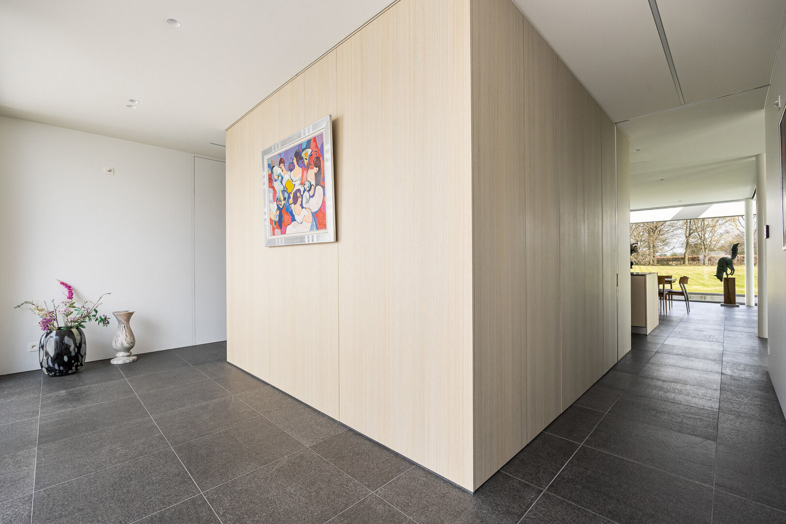 Bij binnenkomst verwelkomt een royale inkomhal u in een serene sfeer. Hier wordt ook de toon gezet voor de rest van de villa, less is more, strakke lijnen, architecturale rust.