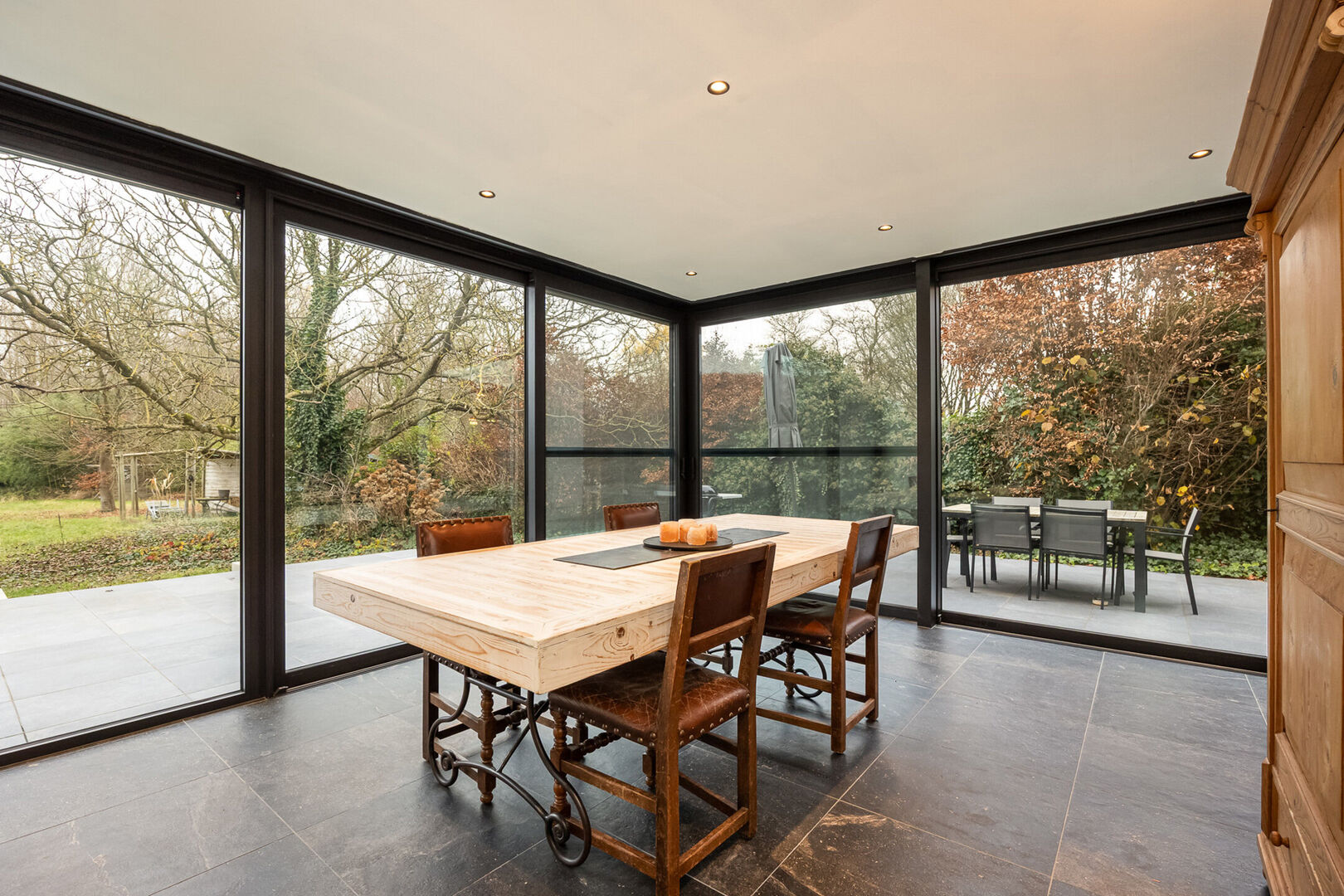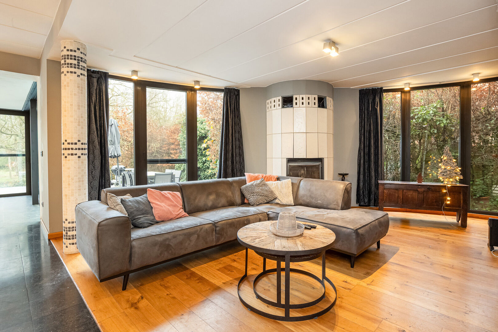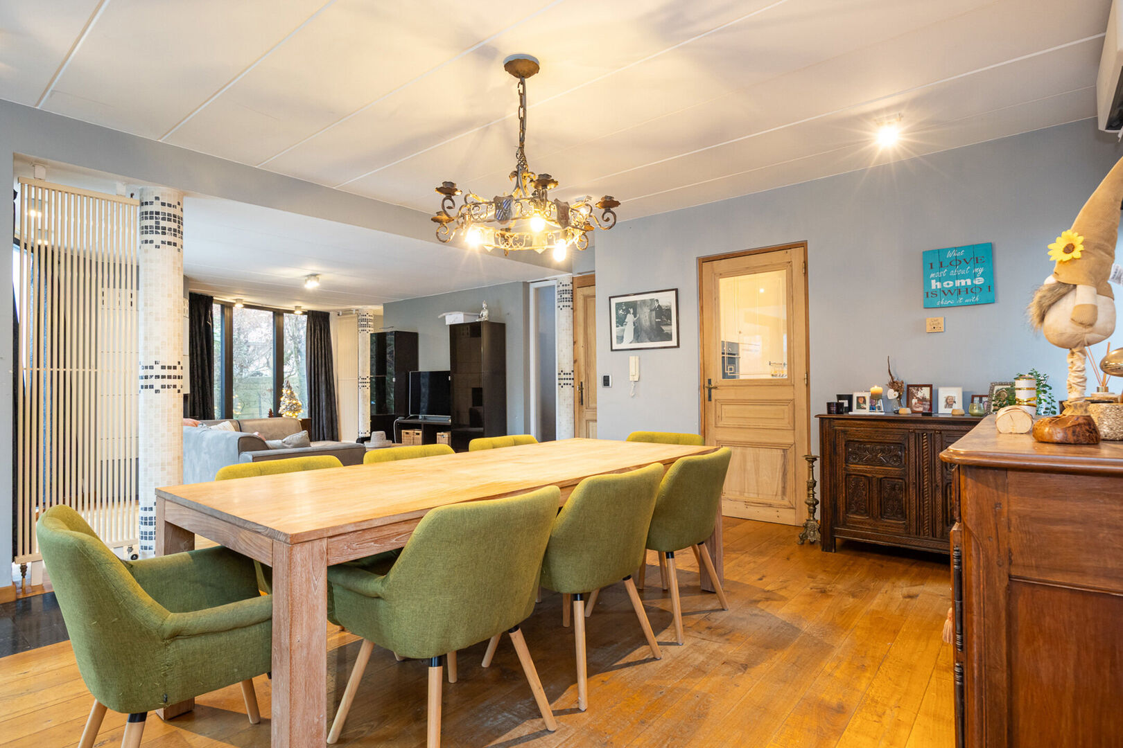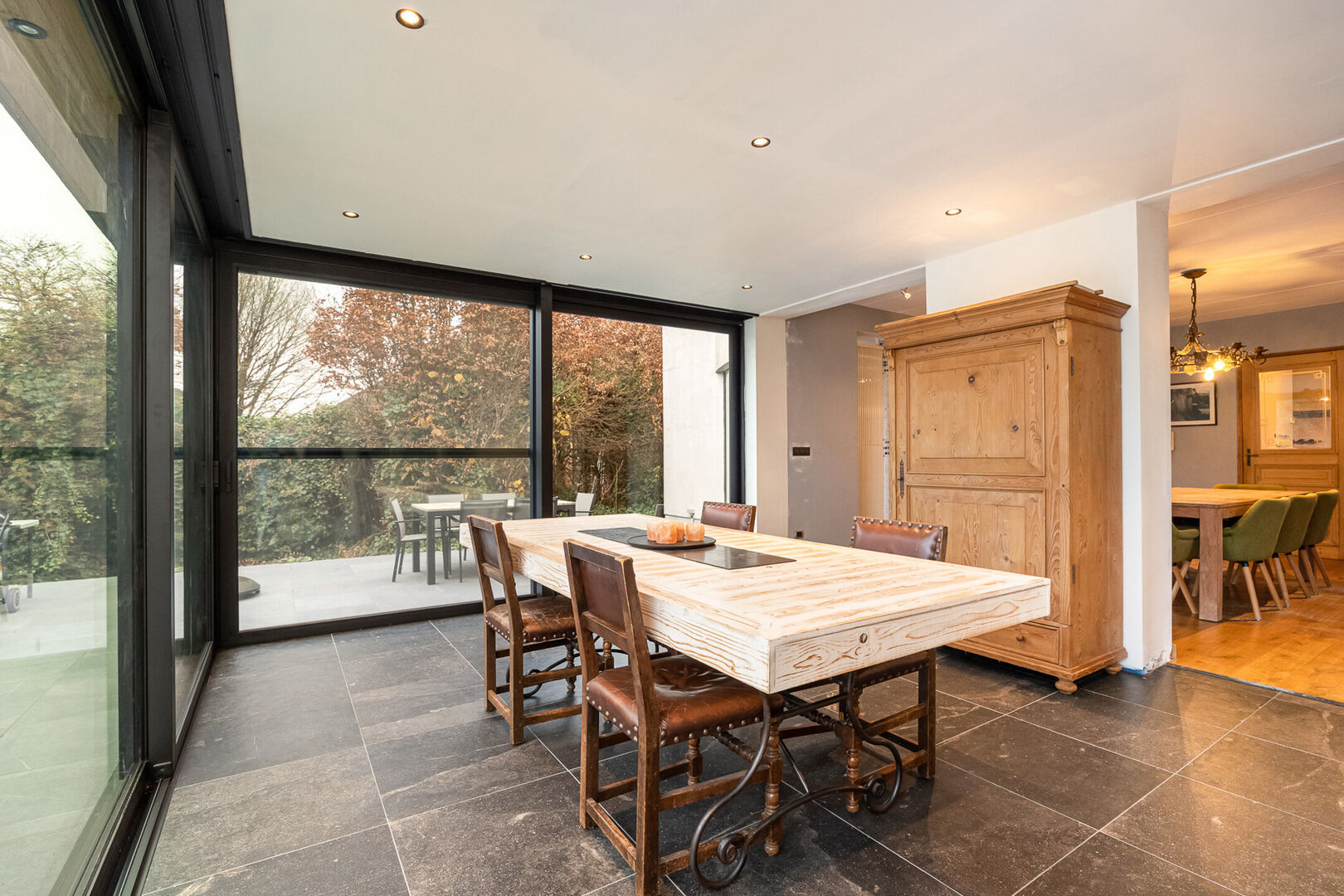 De gang leidt u verder naar de lichtrijke en grote leefruimte, waar grote raampartijen zorgen voor een aangenaam open gevoel en een mooi zicht op het groen. Hier is voldoende plaats voor zowel eet- als zitgedeelte . Aansluitend werd een grote veranda bijgebouwd.