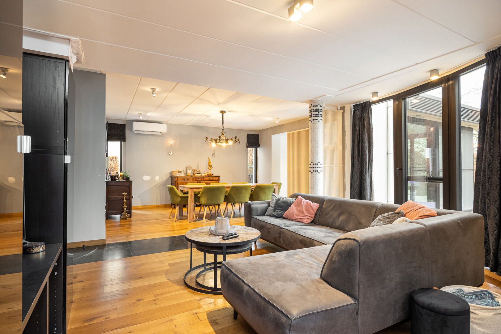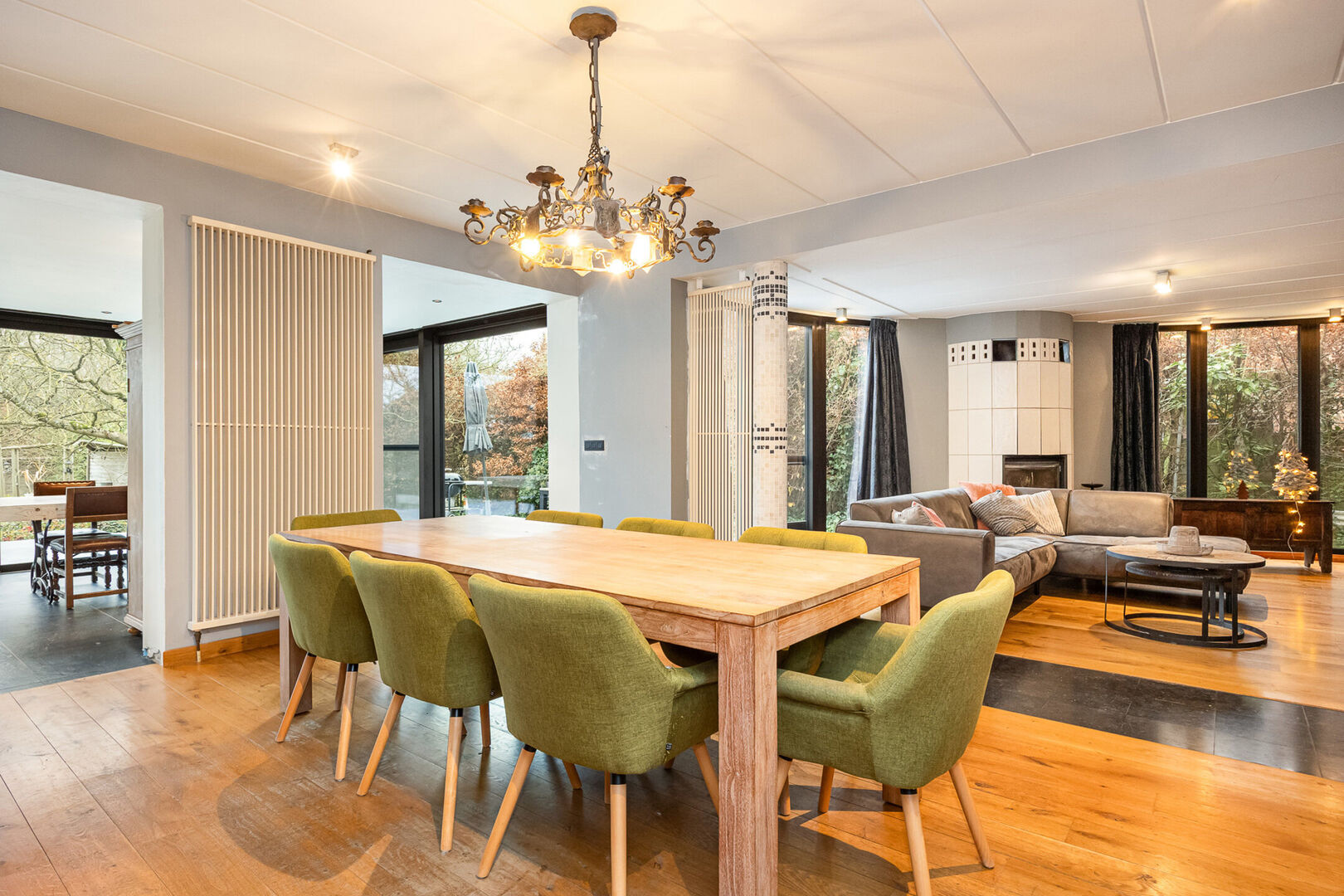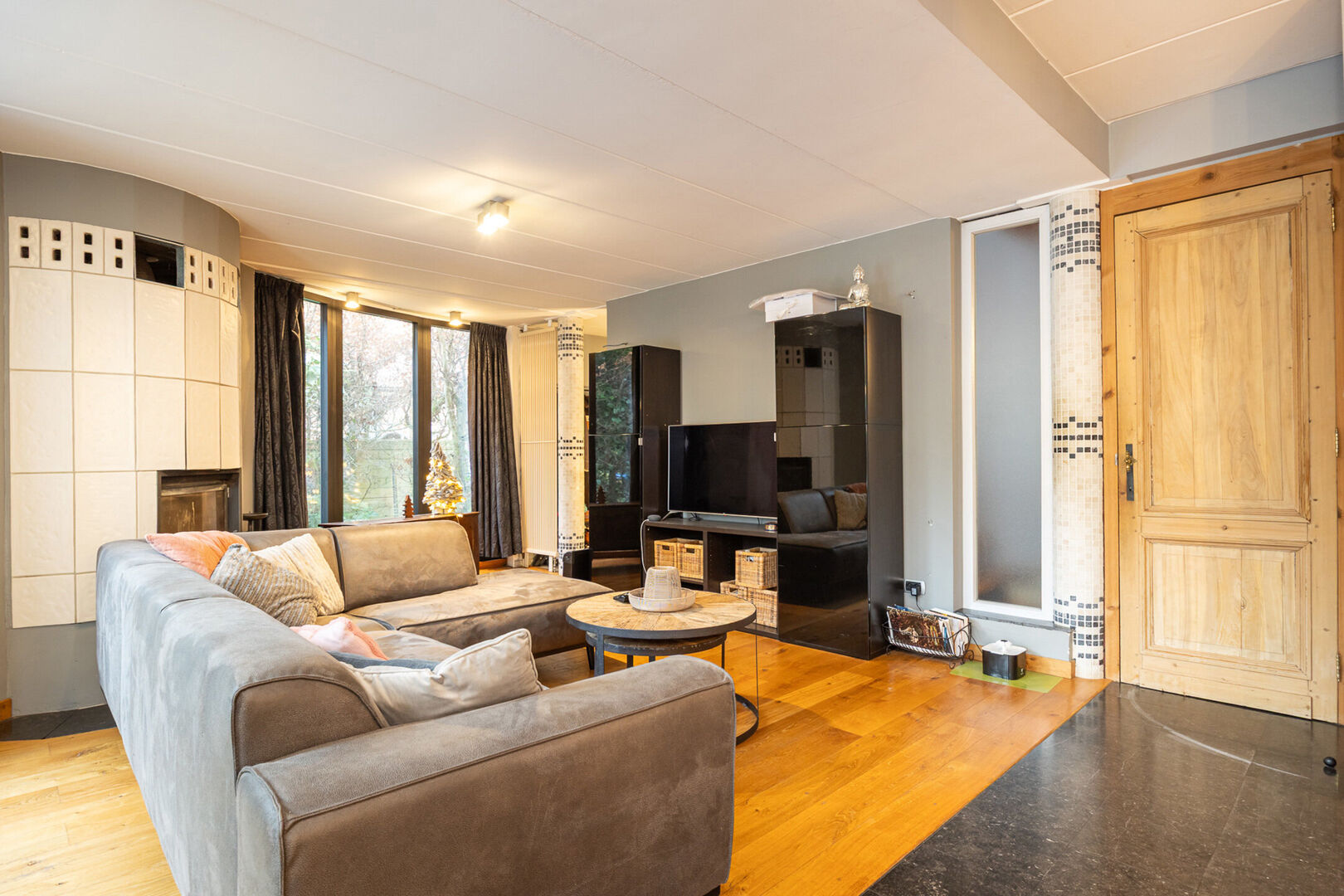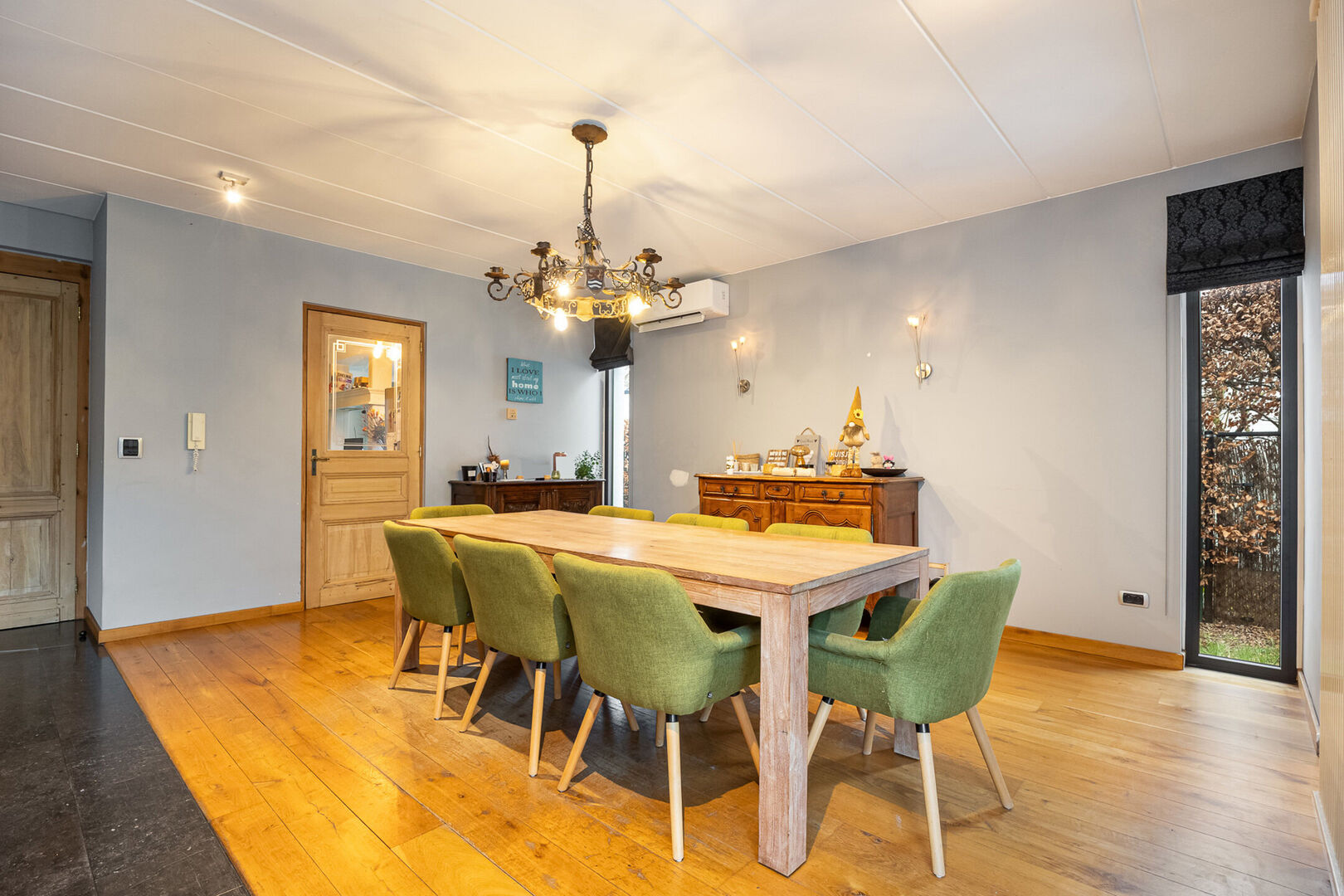 De gang leidt u verder naar de lichtrijke en grote leefruimte, waar grote raampartijen zorgen voor een aangenaam open gevoel en een mooi zicht op het groen. Hier is voldoende plaats voor zowel eet- als zitgedeelte . Aansluitend werd een grote veranda bijgebouwd.