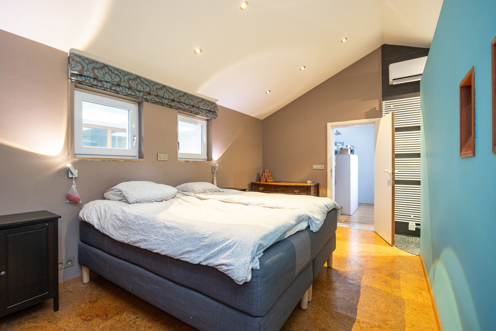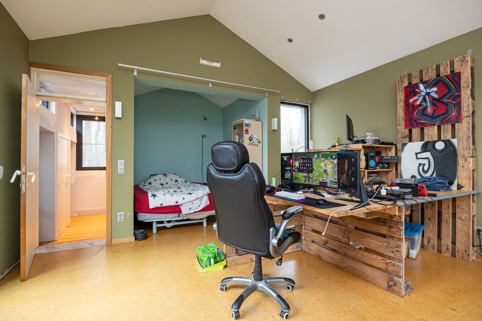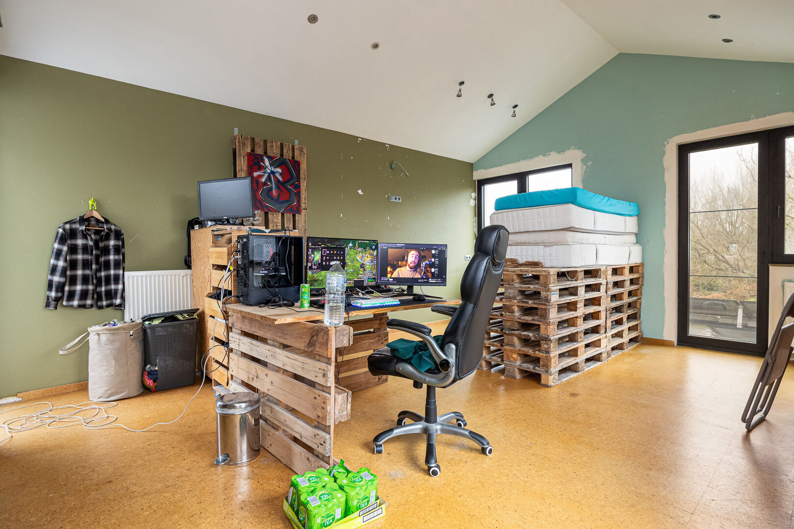 Bij het betreden van de woning komt u binnen in een zeer ruime inkomhal, waar zich meteen de eerste slaapkamer bevindt. Verder in de hal vindt u de trap naar de bovenverdieping, waar momenteel een bureauruimte is ingericht, die ook perfect kan dienen als extra slaapkamer. Deze twee ruimtes zijn afgescheiden van de rest van de woning via een extra deur, waardoor ze uitermate geschikt zijn als praktijkruimte, bureau of wachtzaal. Je kan dus wonen en werken combineren.