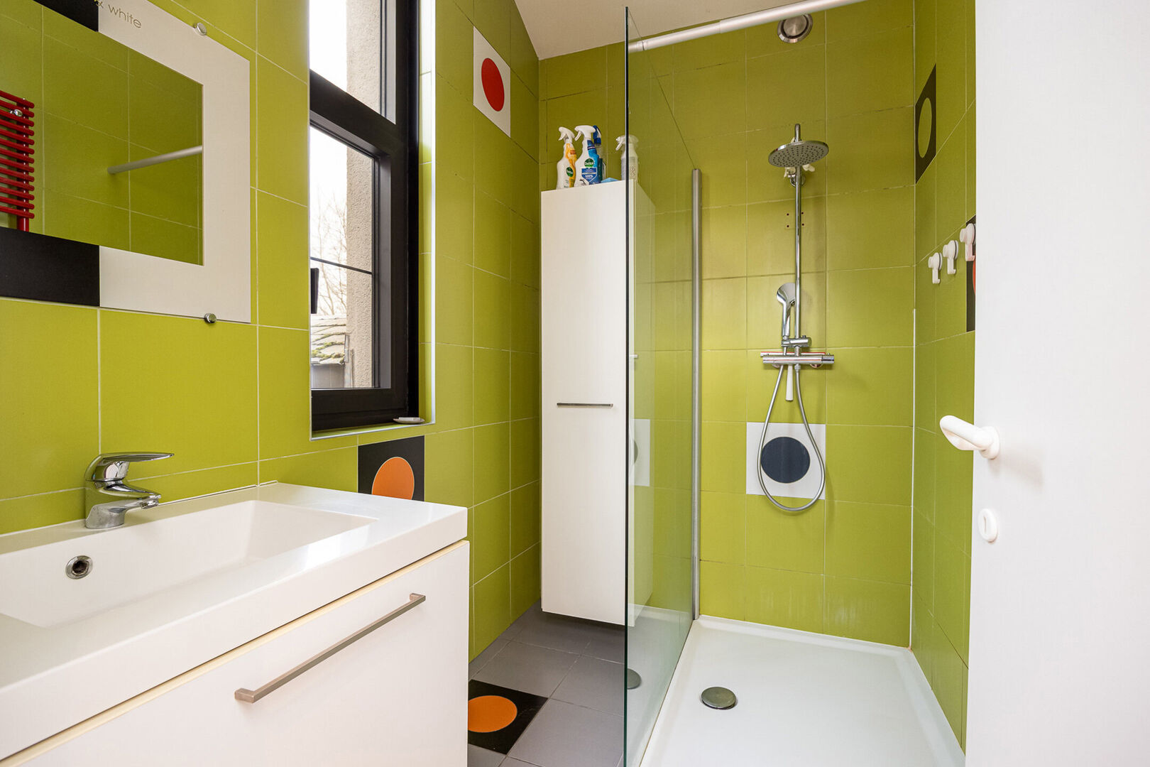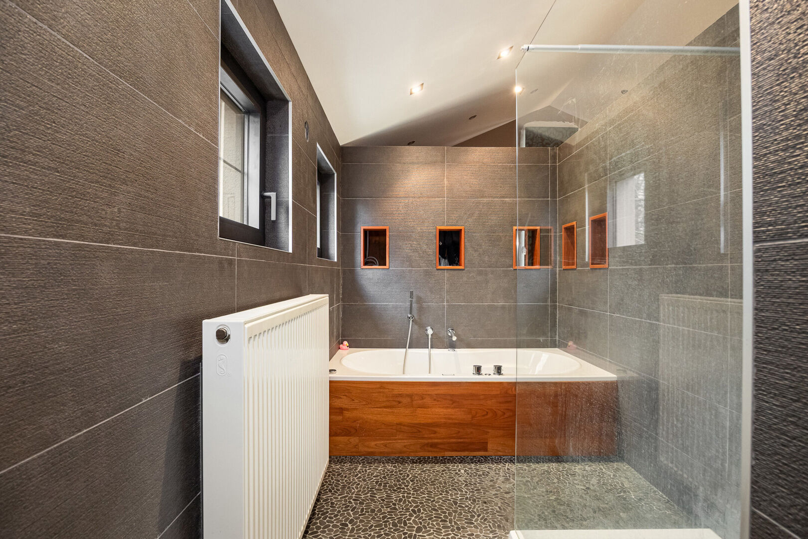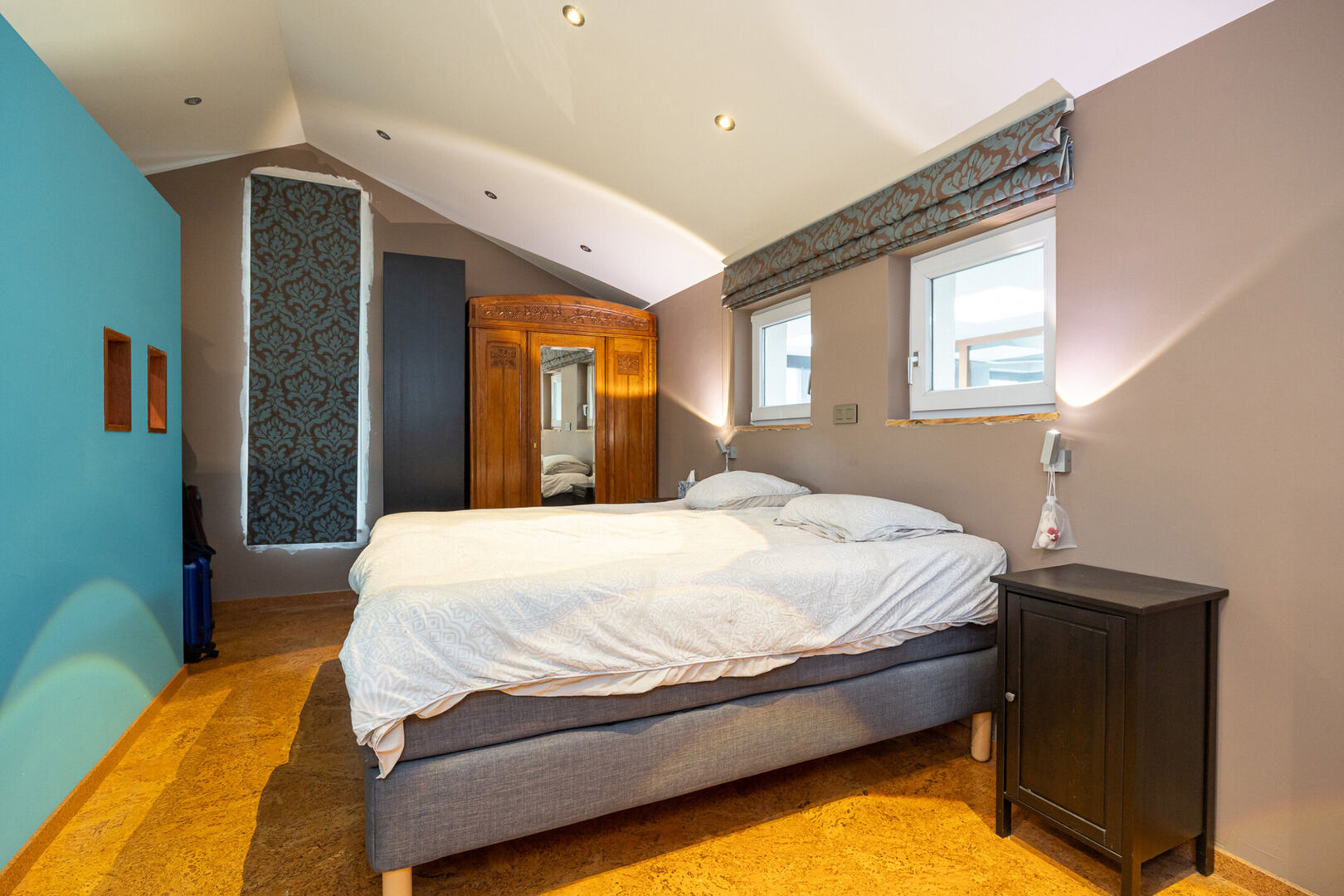 De bovenste verdieping herbergt een tweede badkamer met regendouche en lavabo, evenals een zeer ruime kamer die vroeger werd opgedeeld en vandaag tal van mogelijkheden biedt (extra slaapkamers, studio, hobbyruimte…).