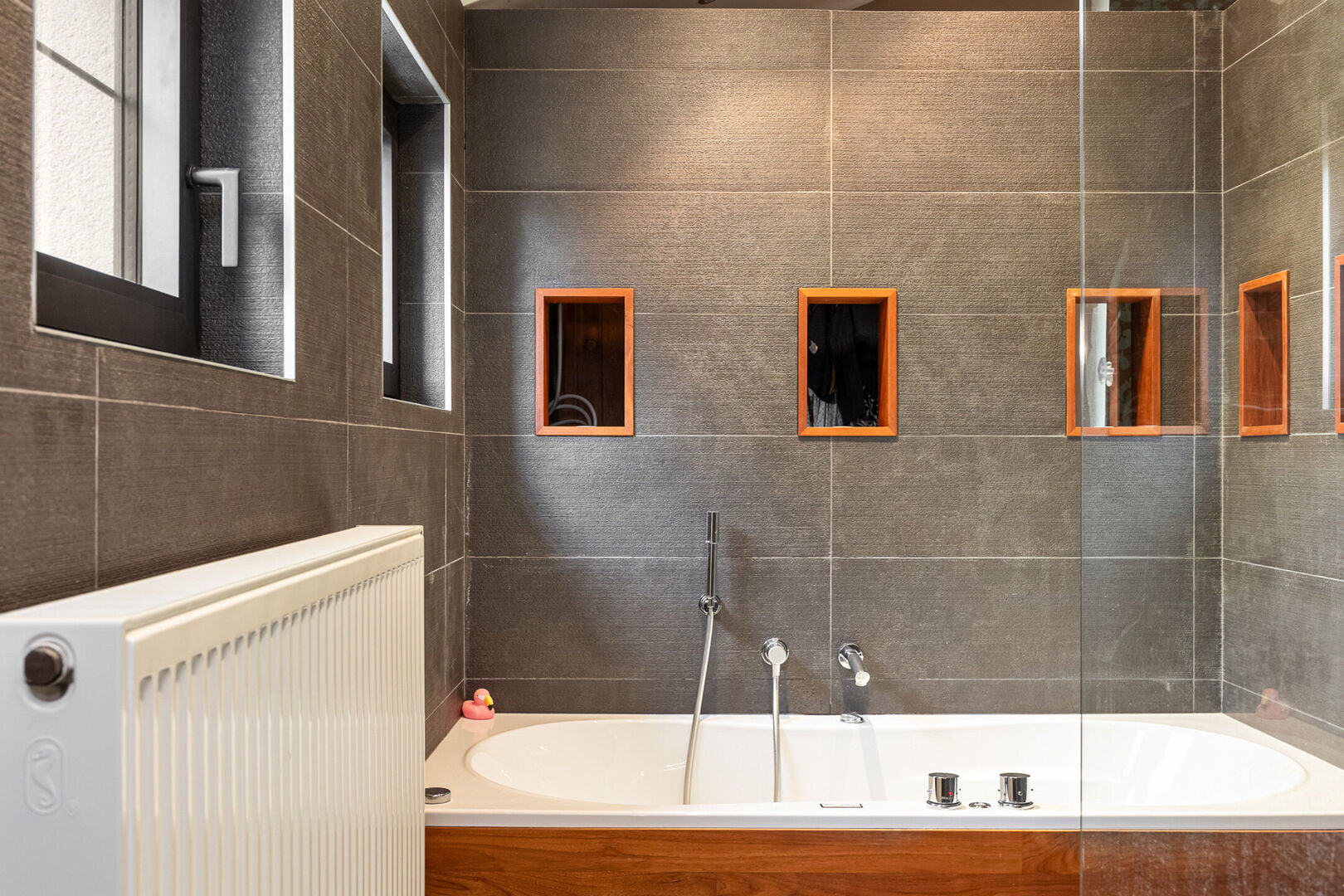 Op technisch vlak is de woning volledig mee met haar tijd: ze wordt verwarmd via warmtepompen, beschikt over zonnepanelen en thuisbatterijen, wat resulteert in een energiezuinig en toekomstgericht geheel.