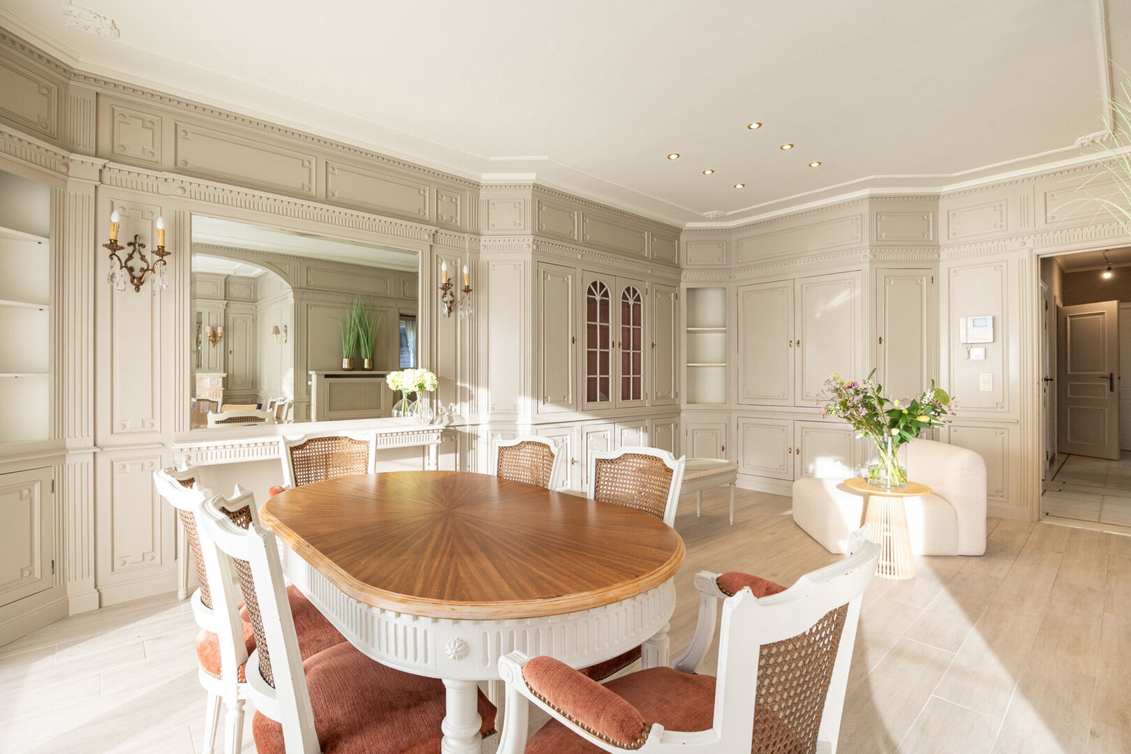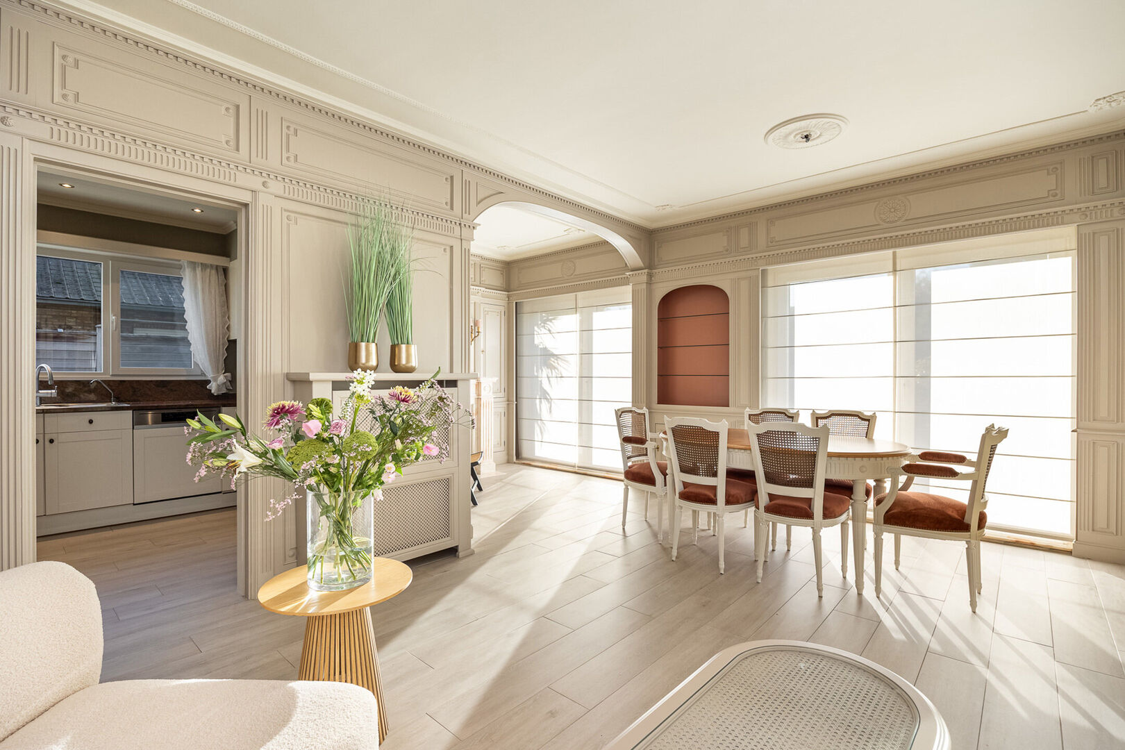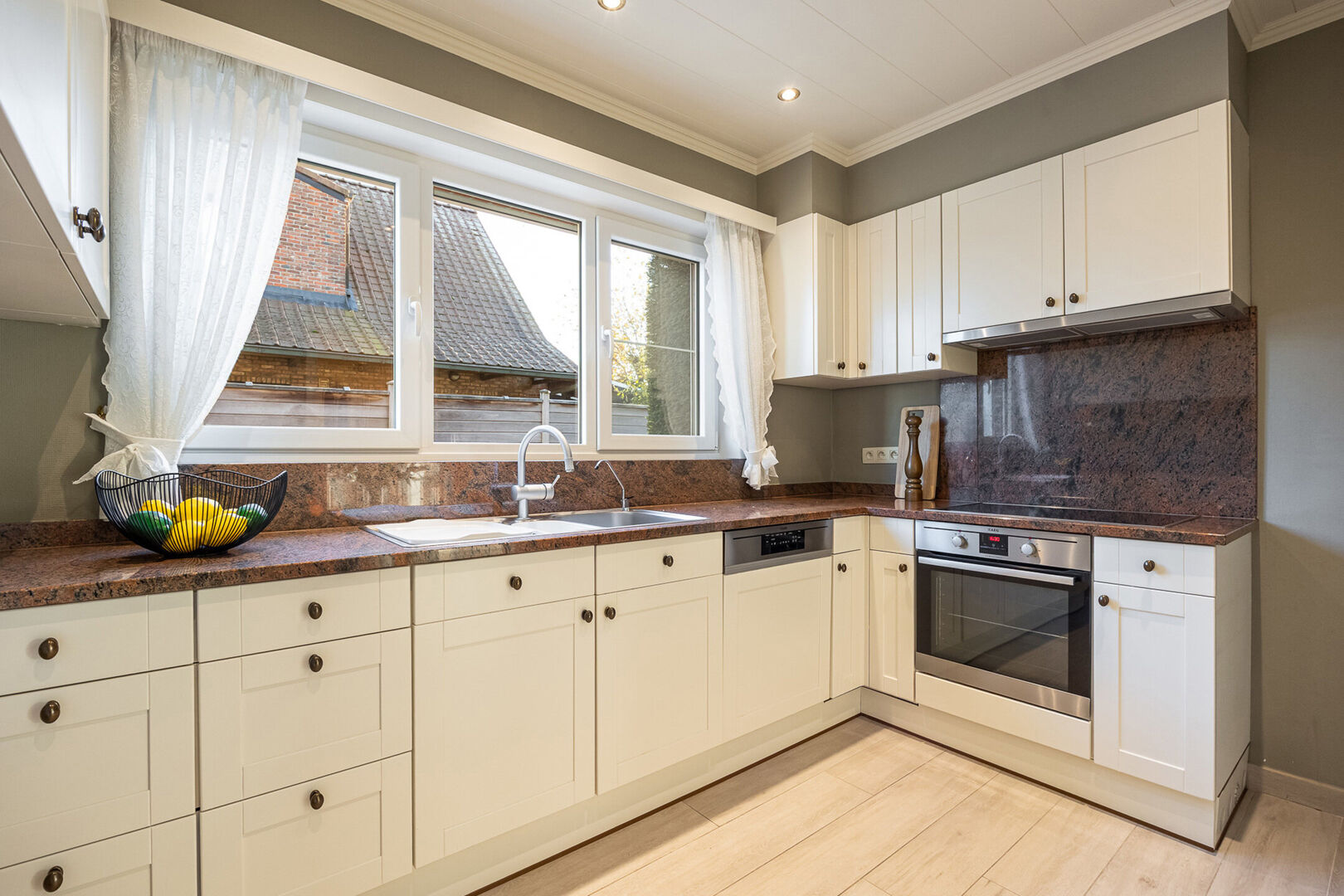 Aansluitend bevindt zich de lichtrijke, volledig uitgeruste keuken, praktisch ingedeeld en voorzien van alle comfort.