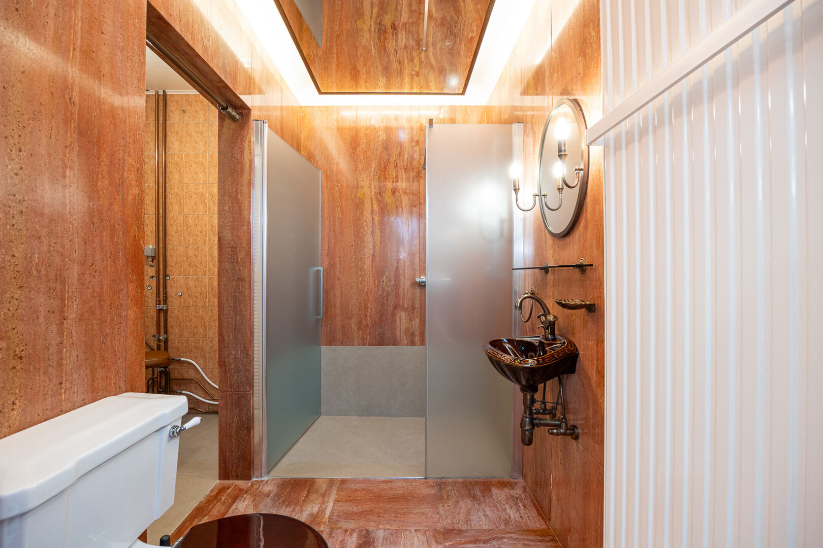 De woning beschikt over een luxueuze badkamer met dubbele lavabo, ruime inloopdouche en toilet. Tevens is er plaats voorzien voor wasmachine en droogkast.