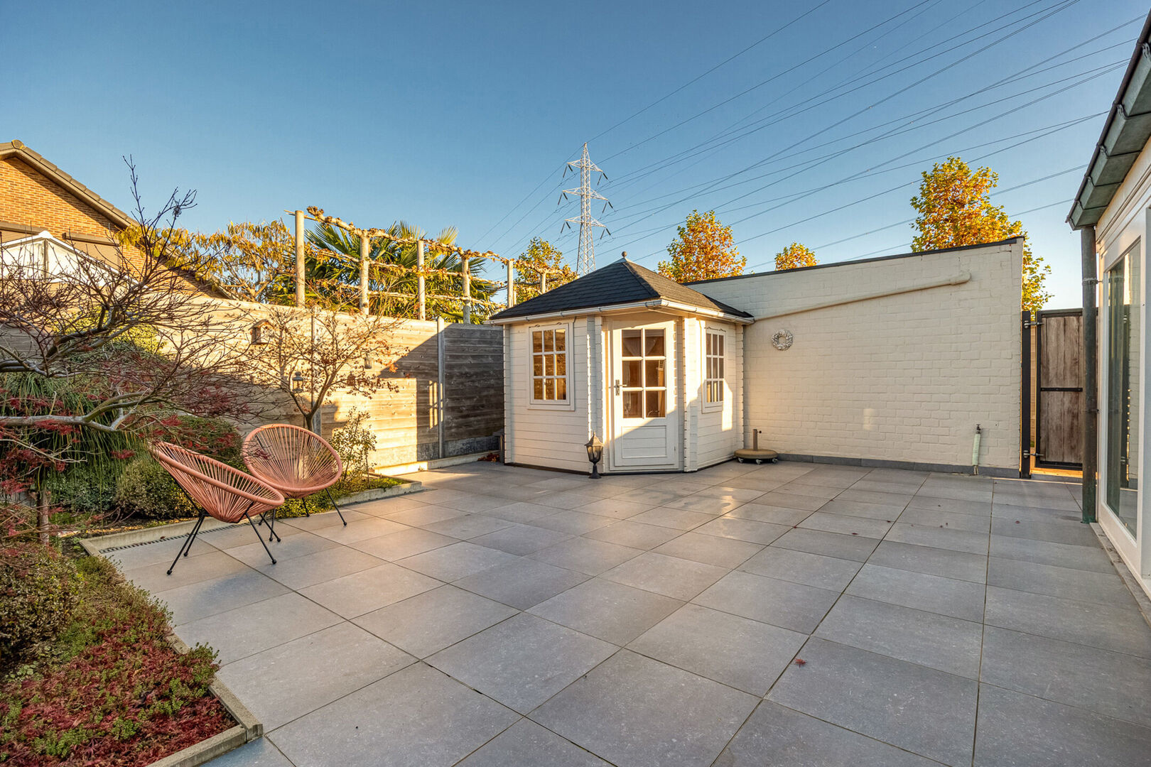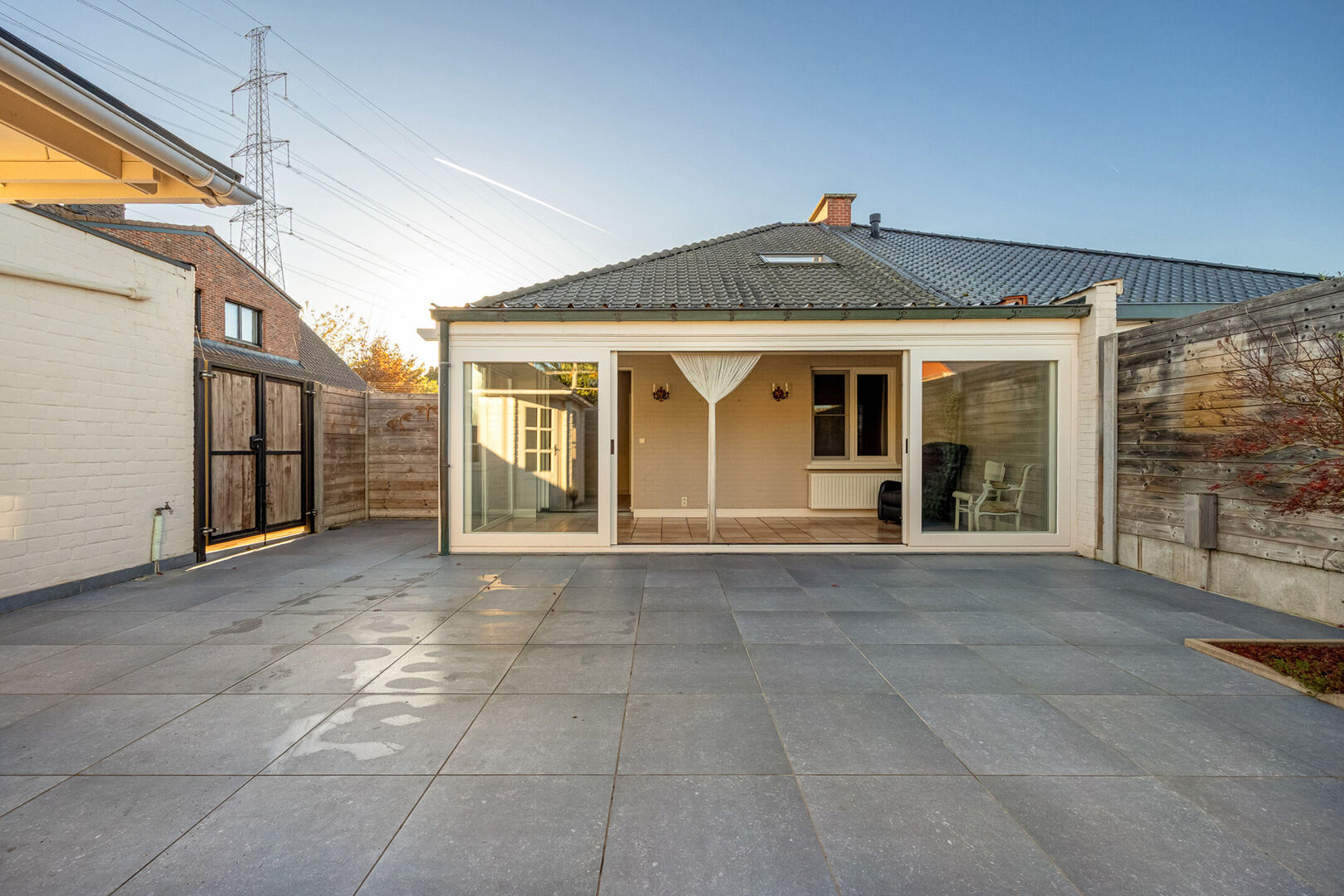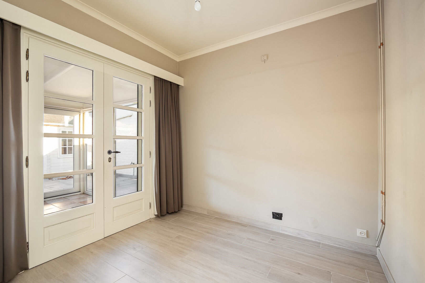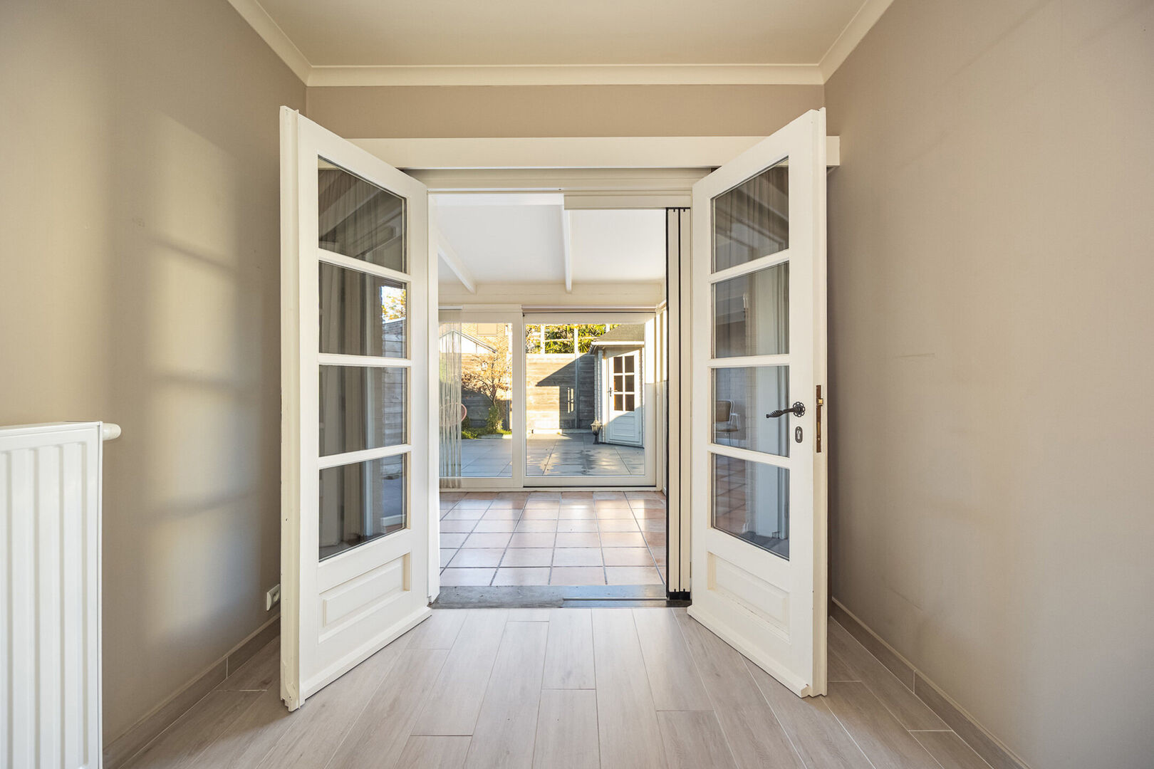 Verder zijn er twee volwaardige slaapkamers en een derde kamer die momenteel ingericht is als bureauruimte. Deze geeft via een dubbele deur uit op de zonnige veranda, waar dankzij twee grote schuiframen binnen en buiten naadloos in elkaar overlopen. Achter de veranda ligt een groot terras met tuinhuis, voor wie meer houdt van groen kan dit onthard worden en ingericht als een gezellig tuintje.
