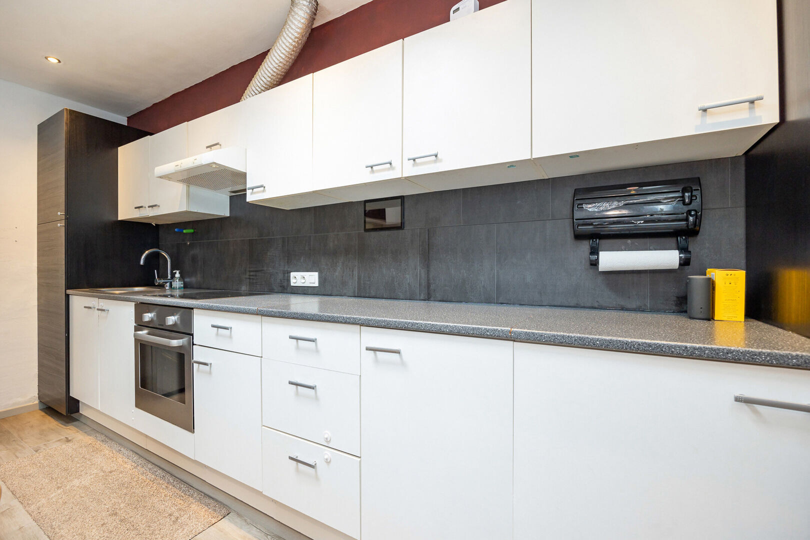 Deze karaktervolle woning verwelkomt je meteen met een charmante inkomhal .Achter de eerste deur bevindt zich een ruime kamer die je naar eigen wens kan inrichten als slaapkamer, bureau of tweede leefruimte. Verder door kom je in de gezellige zithoek die naadloos aansluit op de keuken. Naast de keuken is er een praktische wasplaats/bijkeuken, en achteraan vind je de badkamer.