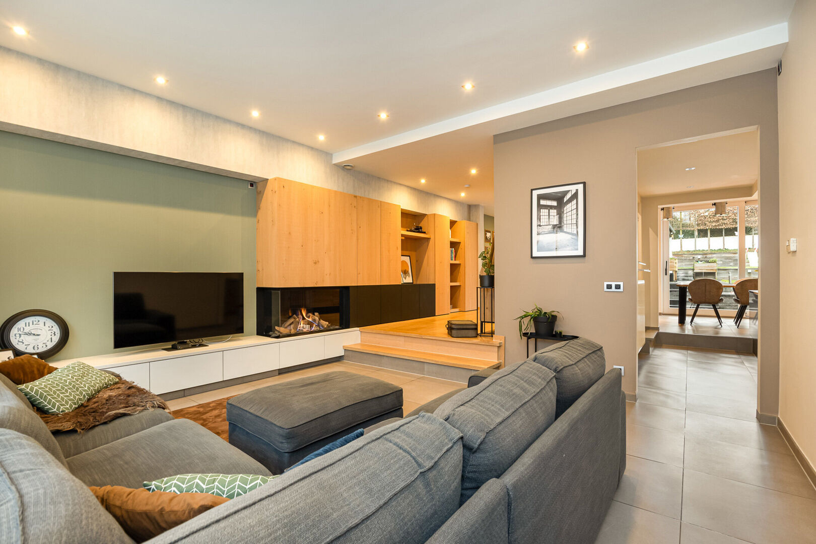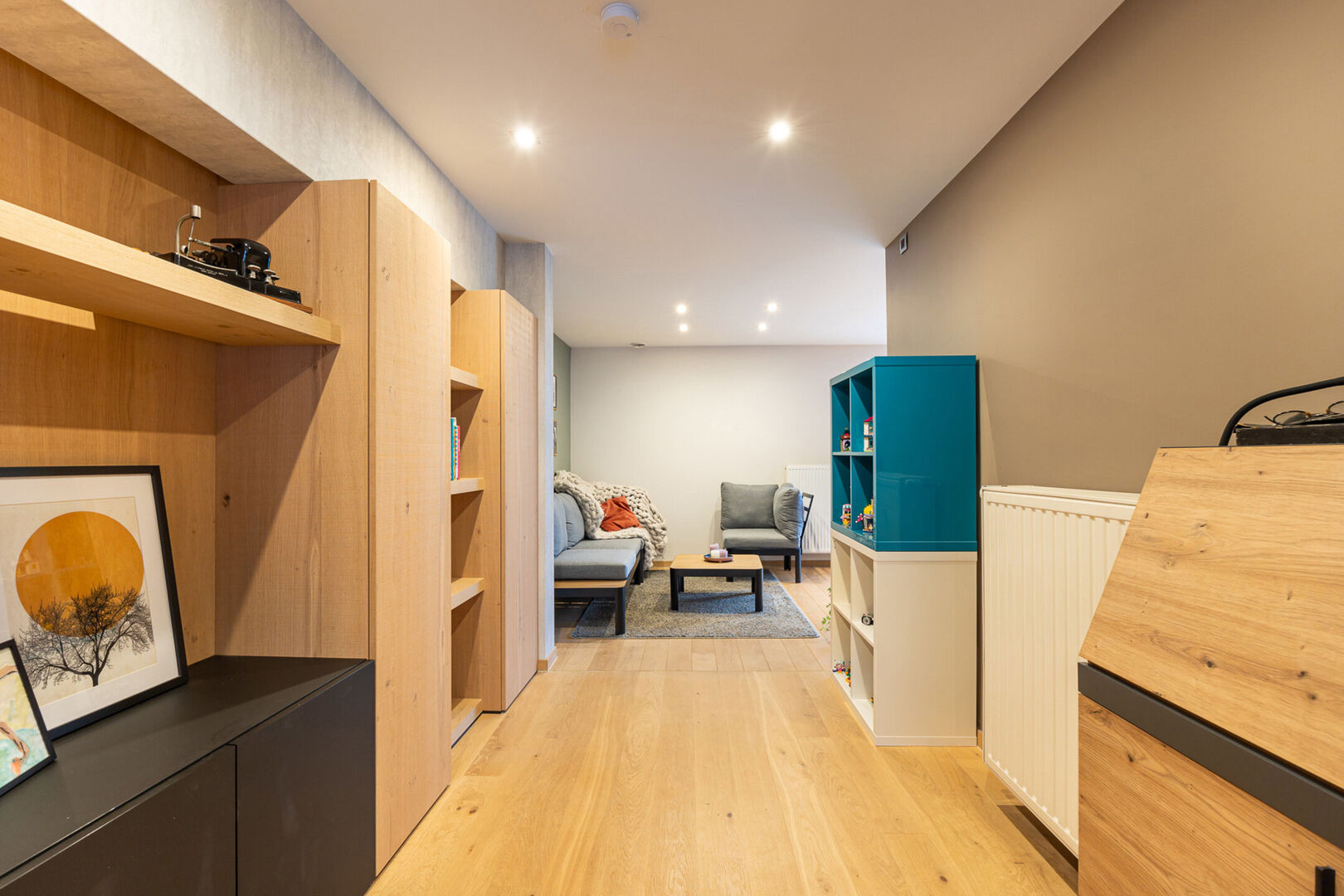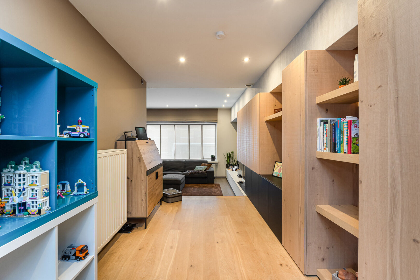 Bij het binnenkomen wordt u verwelkomd in een ruime inkomhal met ingemaakte kasten en een apart gastentoilet. Vanuit de hal bereikt u de open leefruimte. Vooraan bevindt zich de gezellige zithoek met gashaard. Aansluitend vindt u de volledig uitgeruste, open keuken met een ruime eetplaats die naadloos aansluit op het geheel. Daarnaast is er nog extra plaats voor een tweede zithoek, speelhoek of bureauruimte — ideaal voor wie flexibel wil omgaan met de leefruimte. De gelijkvloerse verdieping wordt vervolledigd door een praktische wasruimte/bijkeuken met technische voorzieningen. Dankzij de waskoker vanuit de bovenverdieping behoort het zeulen met wasmanden tot het verleden.