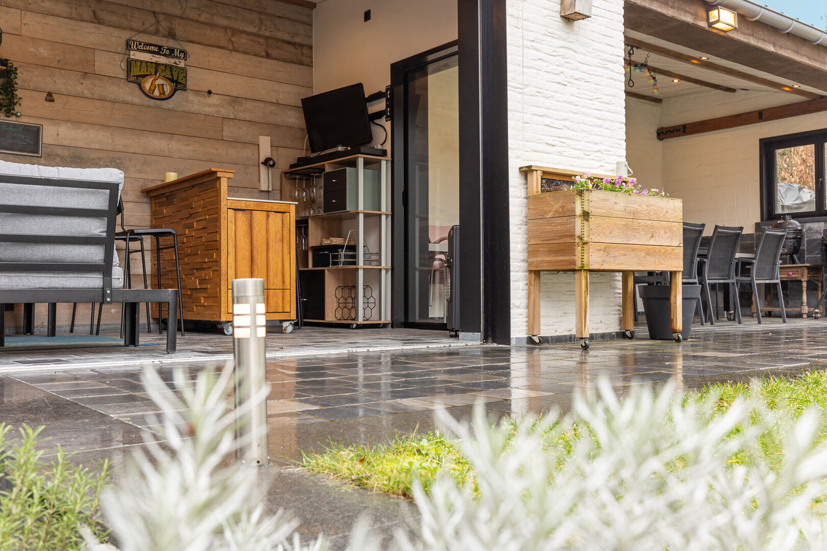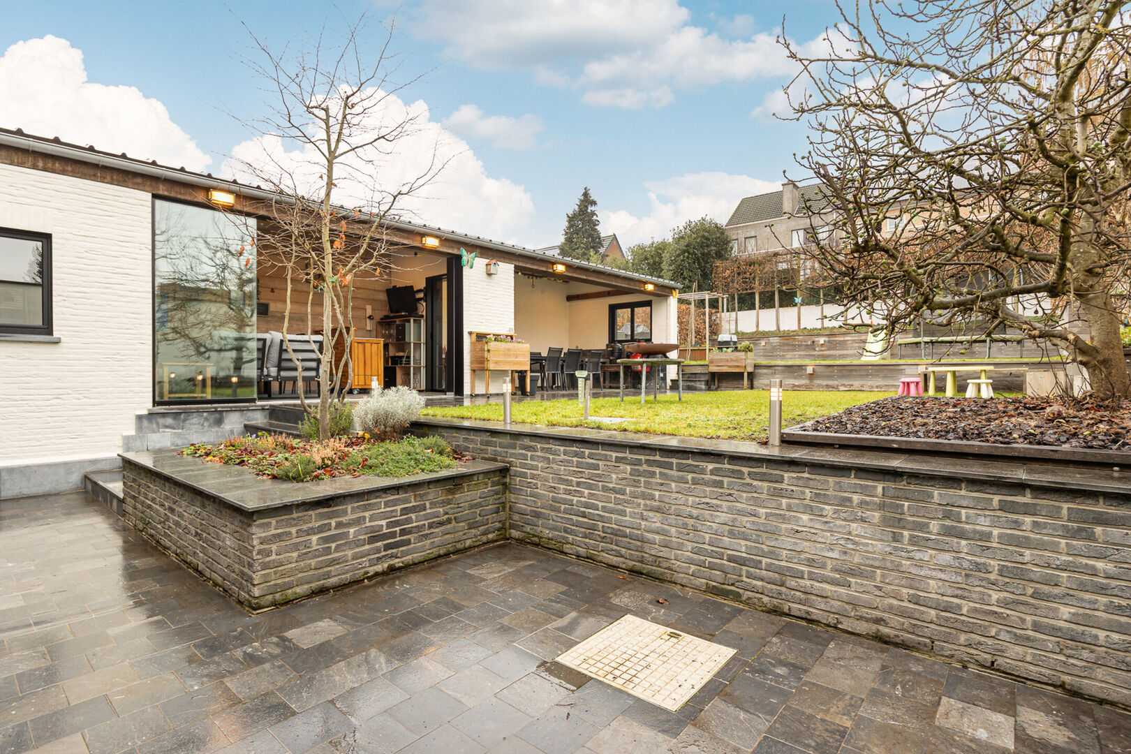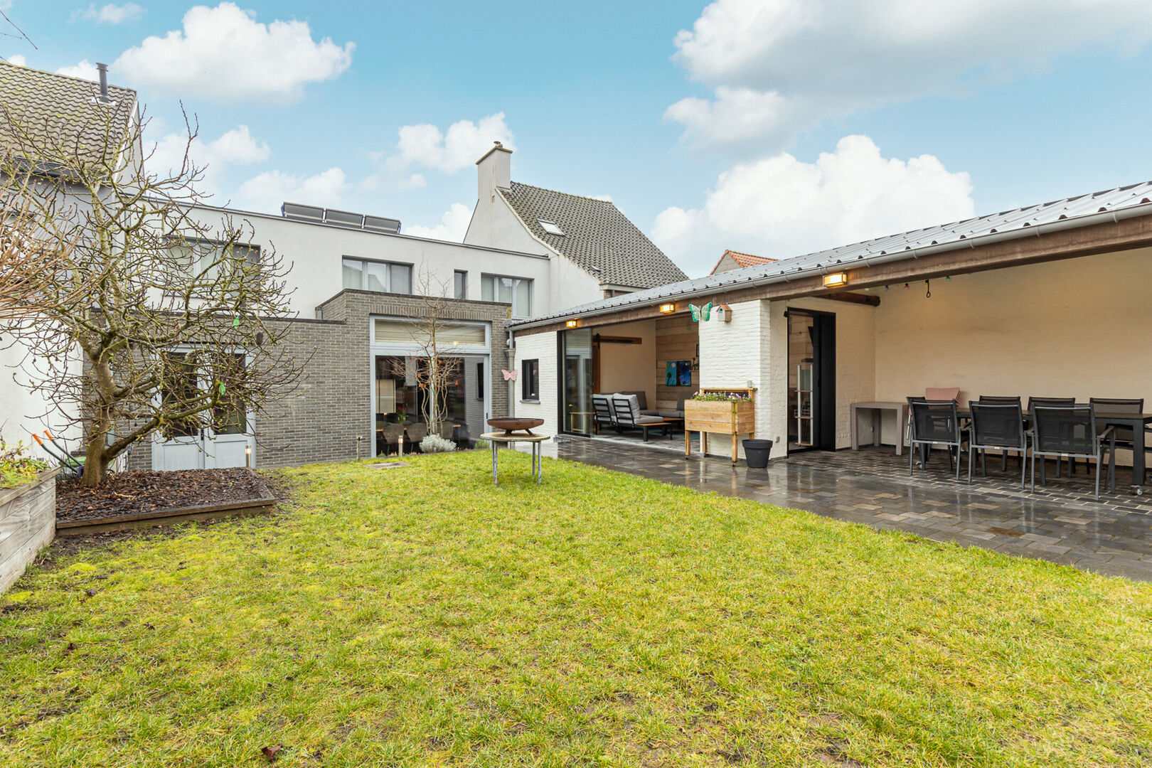 De tuin is volledig aangelegd en vormt een aangename buitenruimte. In het bijgebouw kan je het hele jaar door genieten van het buitenleven, ongeacht de weersomstandigheden.