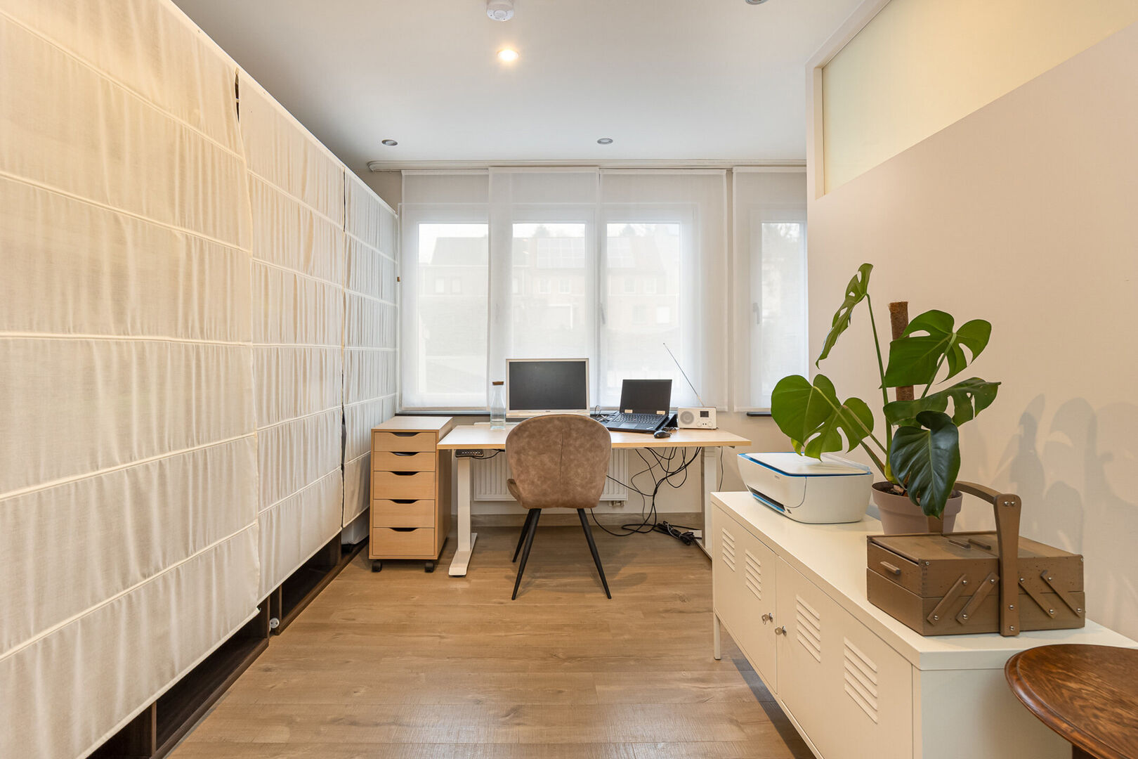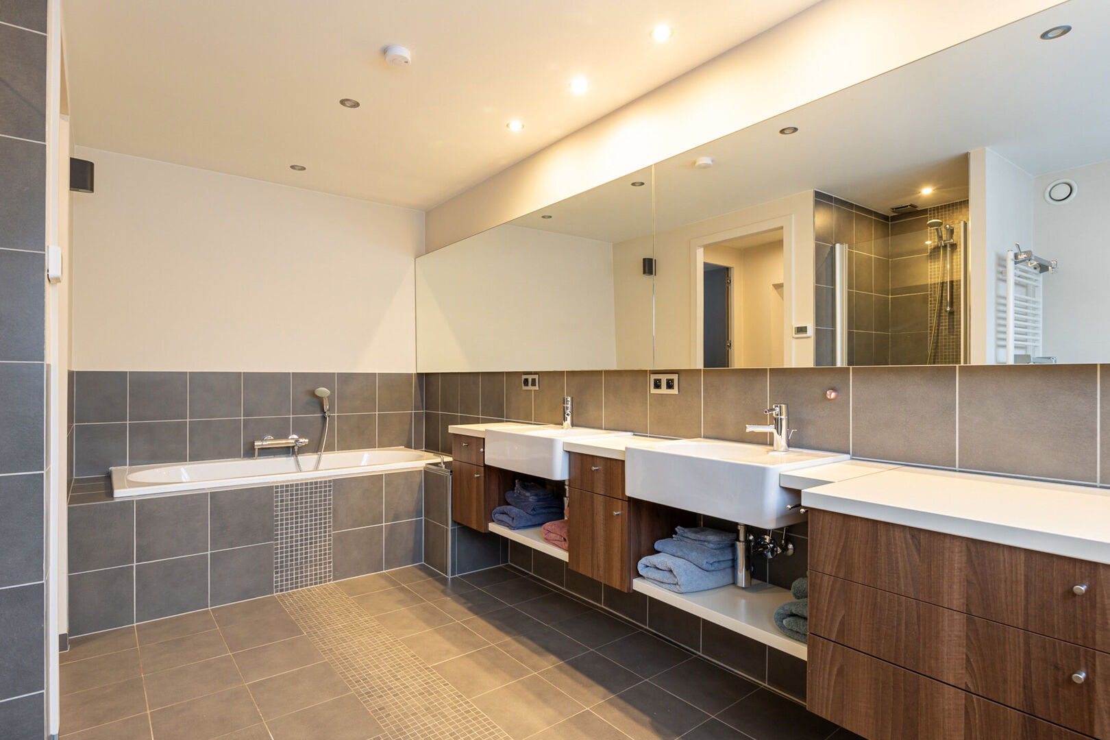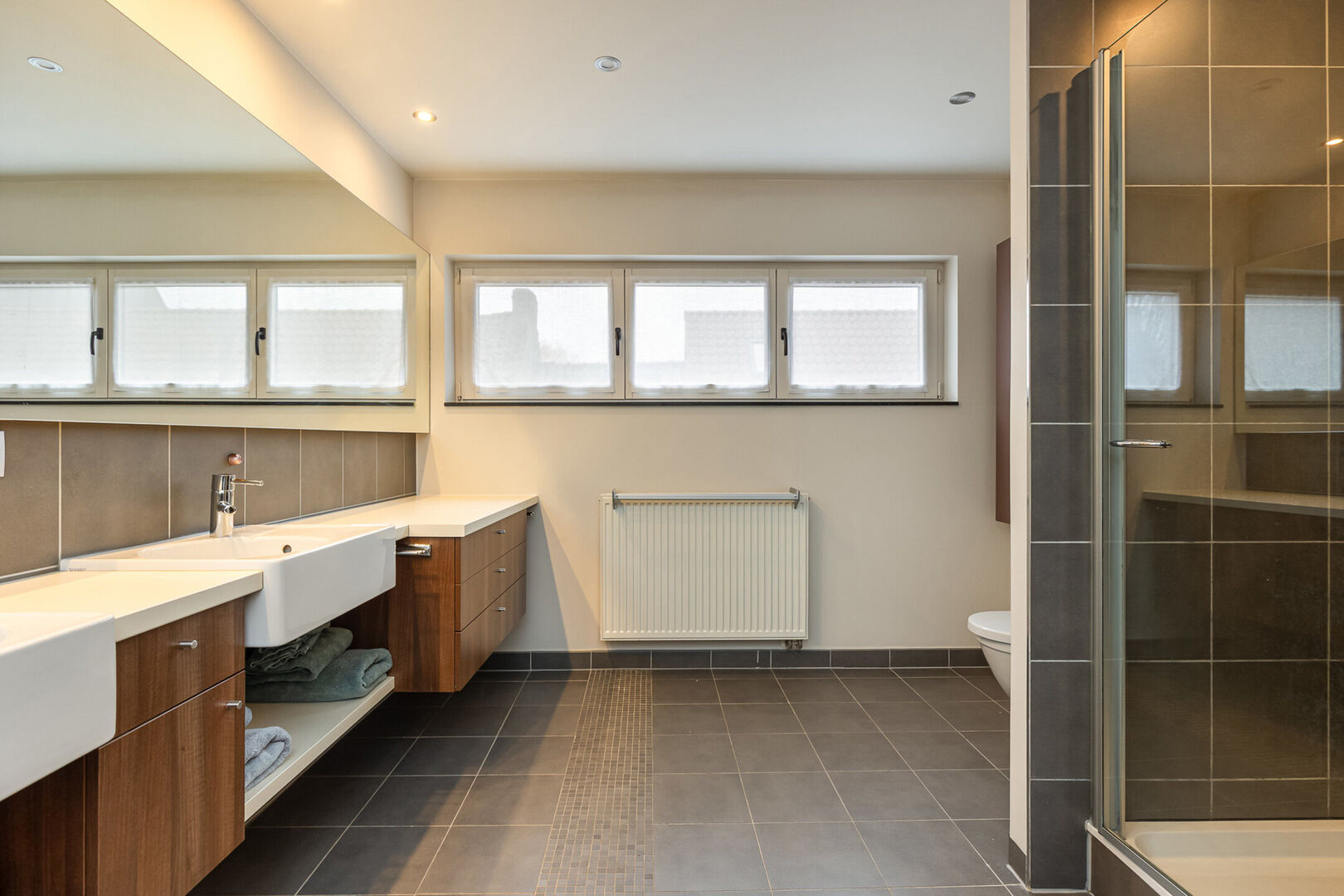 Op de bovenverdieping bevinden zich vier ruime slaapkamers, waarvan één momenteel is ingericht als bureauruimte. De grote badkamer is uitgerust met een dubbele lavabo, douche, ligbad en toilet. Daarnaast is er een aparte, ruime dressing die voor extra opbergruimte zorgt.