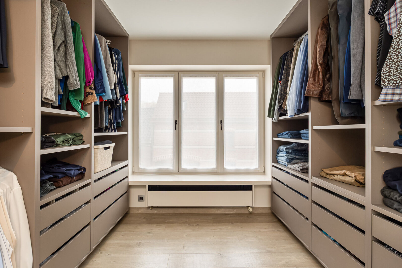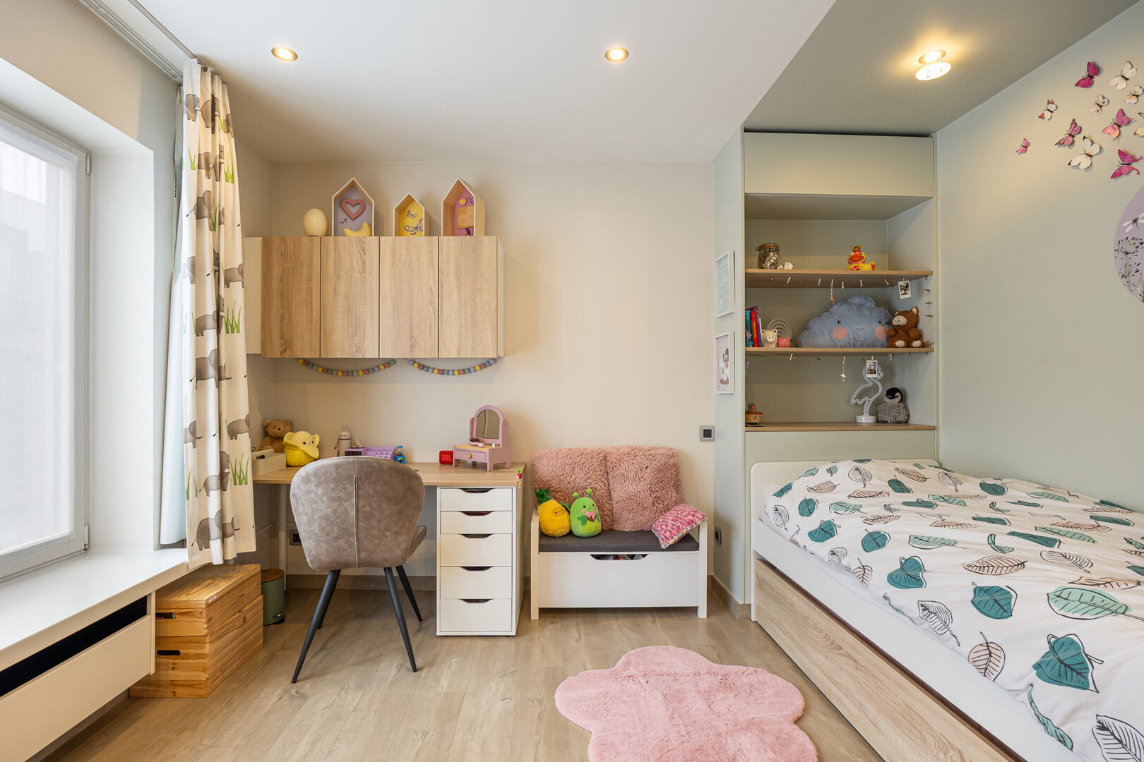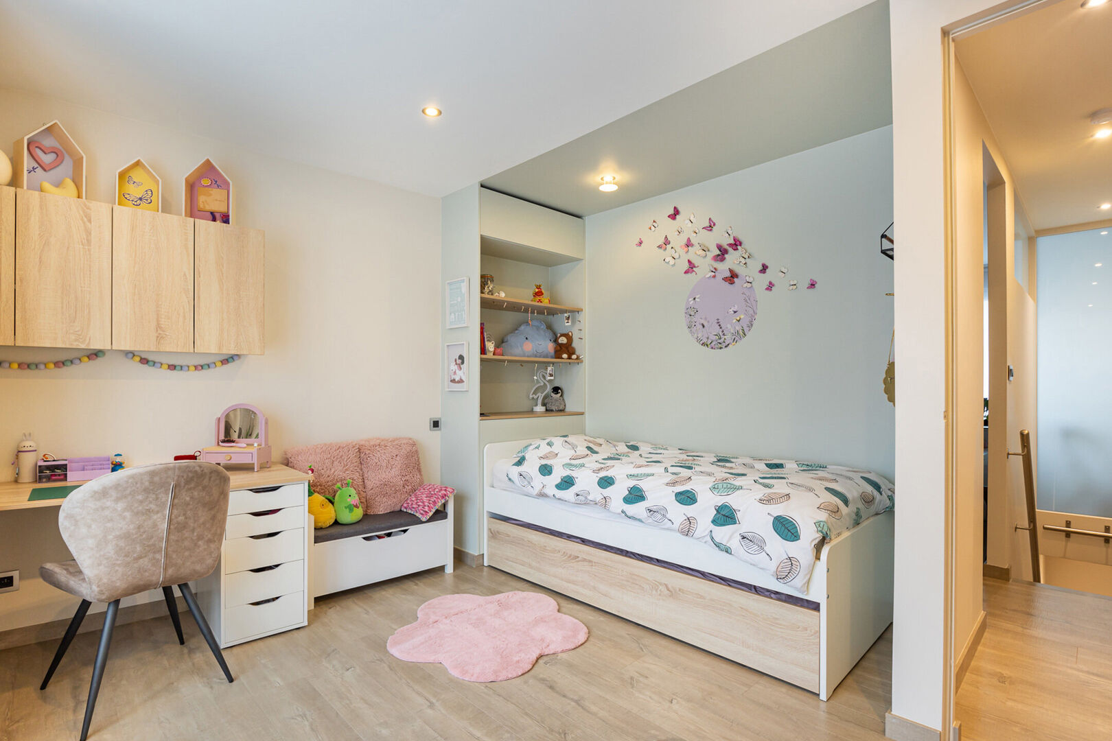 Op de bovenverdieping bevinden zich vier ruime slaapkamers, waarvan één momenteel is ingericht als bureauruimte. De grote badkamer is uitgerust met een dubbele lavabo, douche, ligbad en toilet. Daarnaast is er een aparte, ruime dressing die voor extra opbergruimte zorgt.
