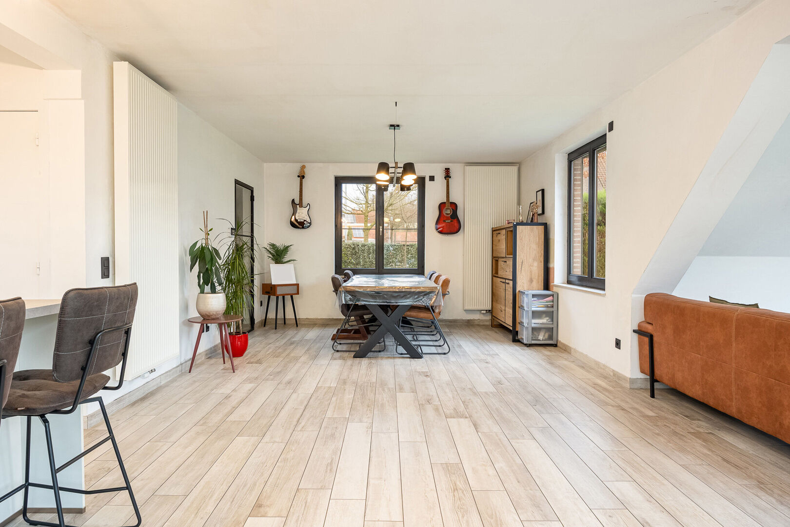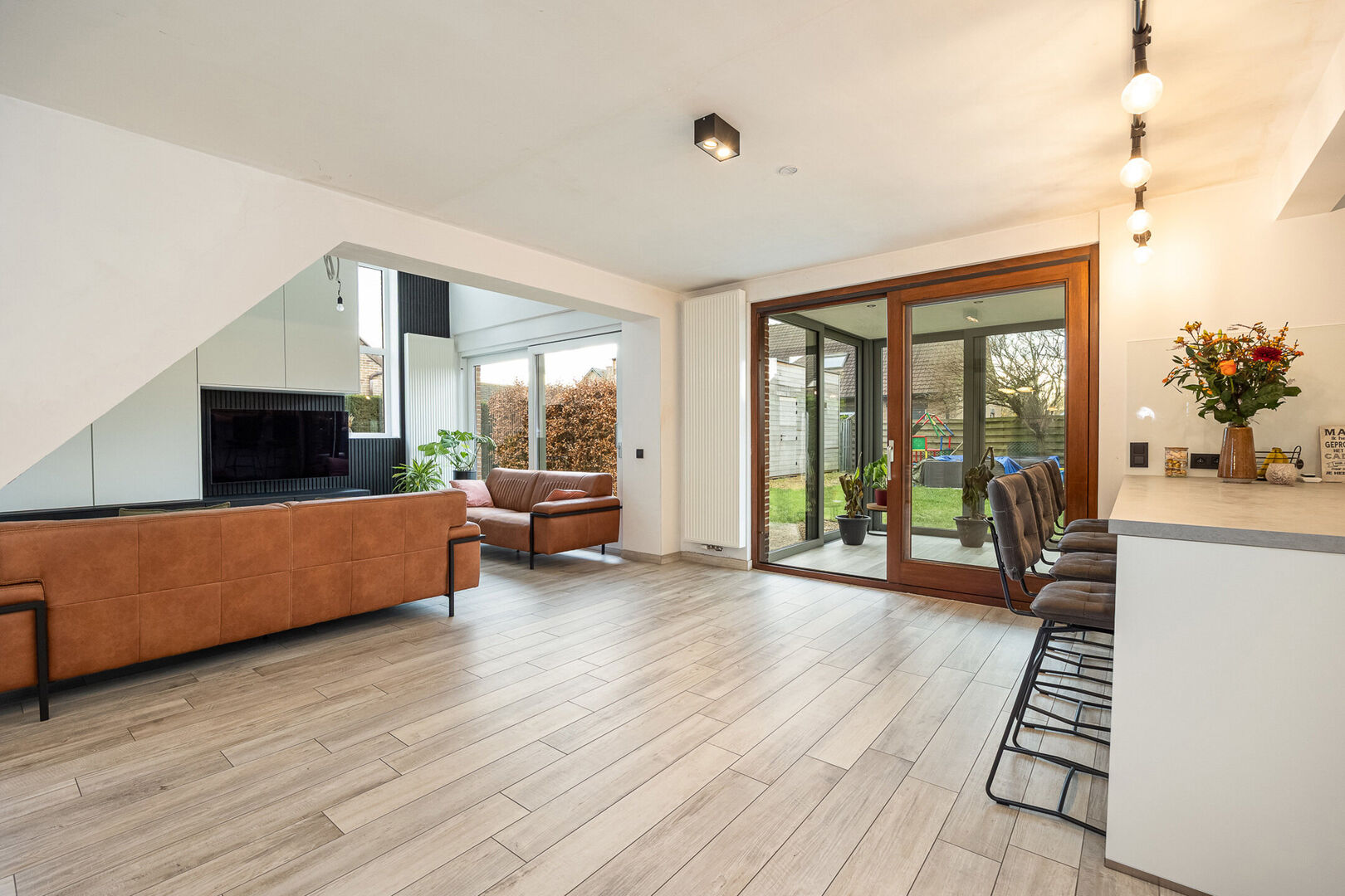 De open keuken is volledig uitgerust en beschikt over een praktisch keukeneiland. Aansluitend vind je de grote leefruimte, met voldoende plaats voor zowel een zithoek als een eetgedeelte. De nieuwe veranda vormt een mooie uitbreiding en kan perfect dienen als speelruimte, tweede zithoek of hobbyruimte.