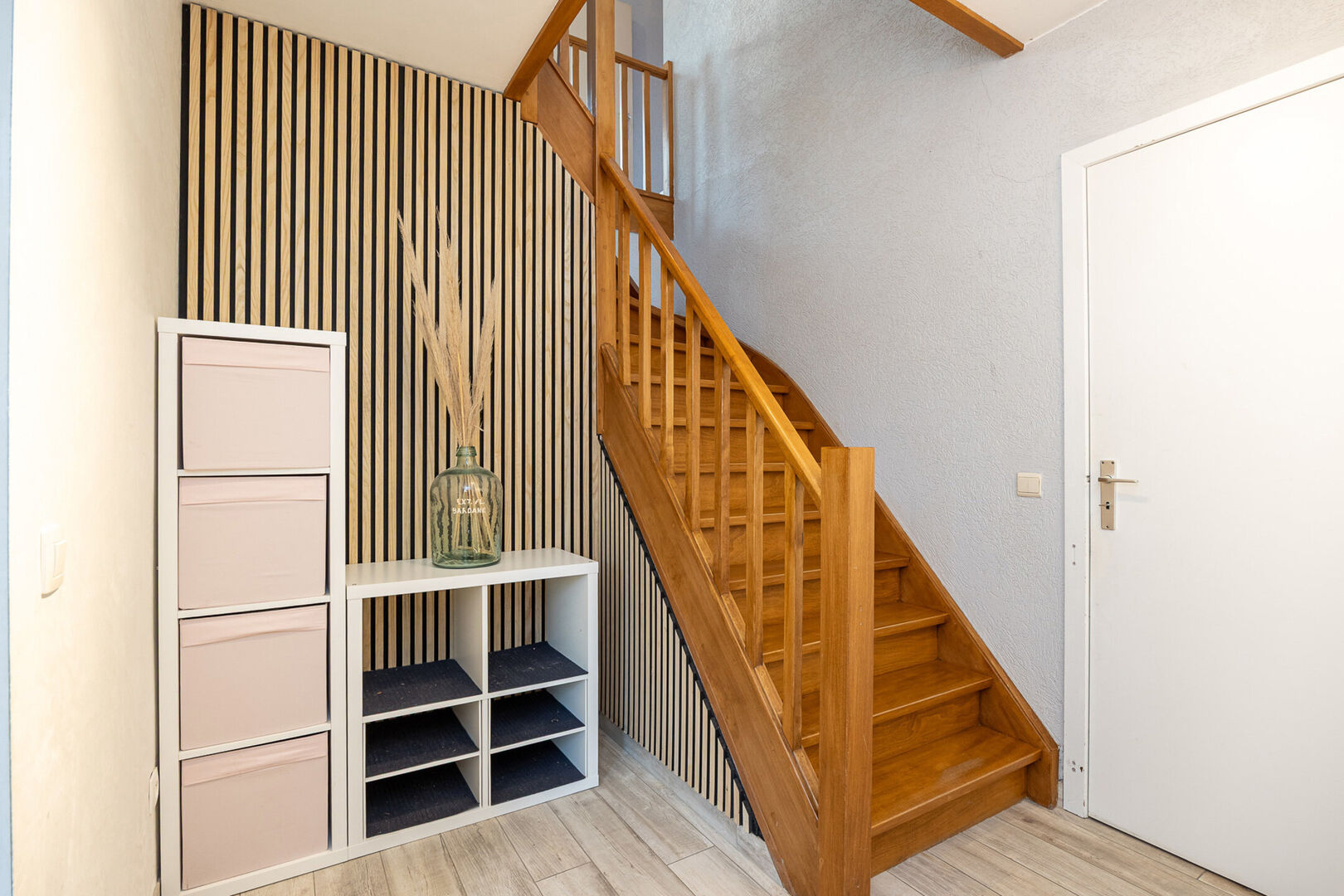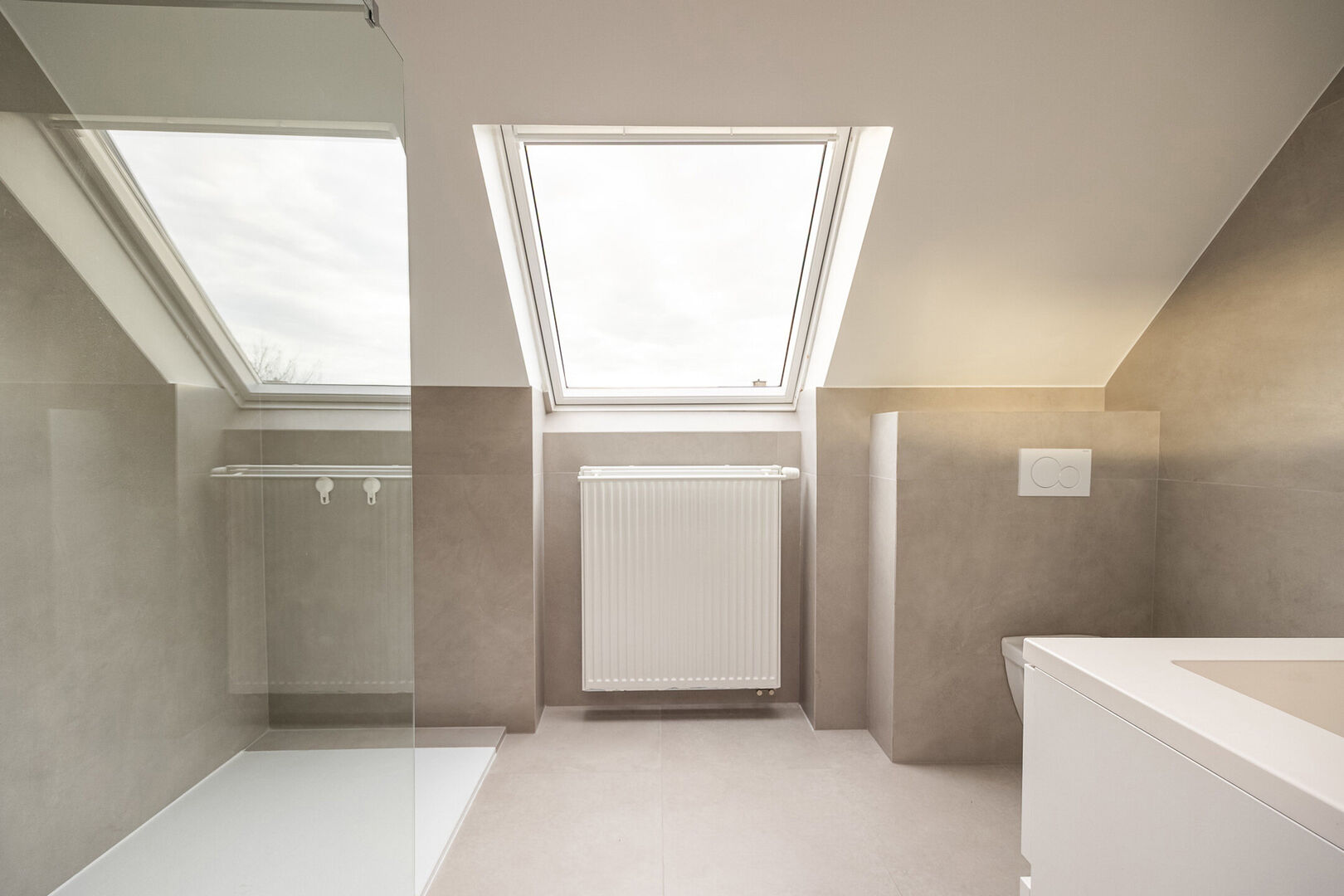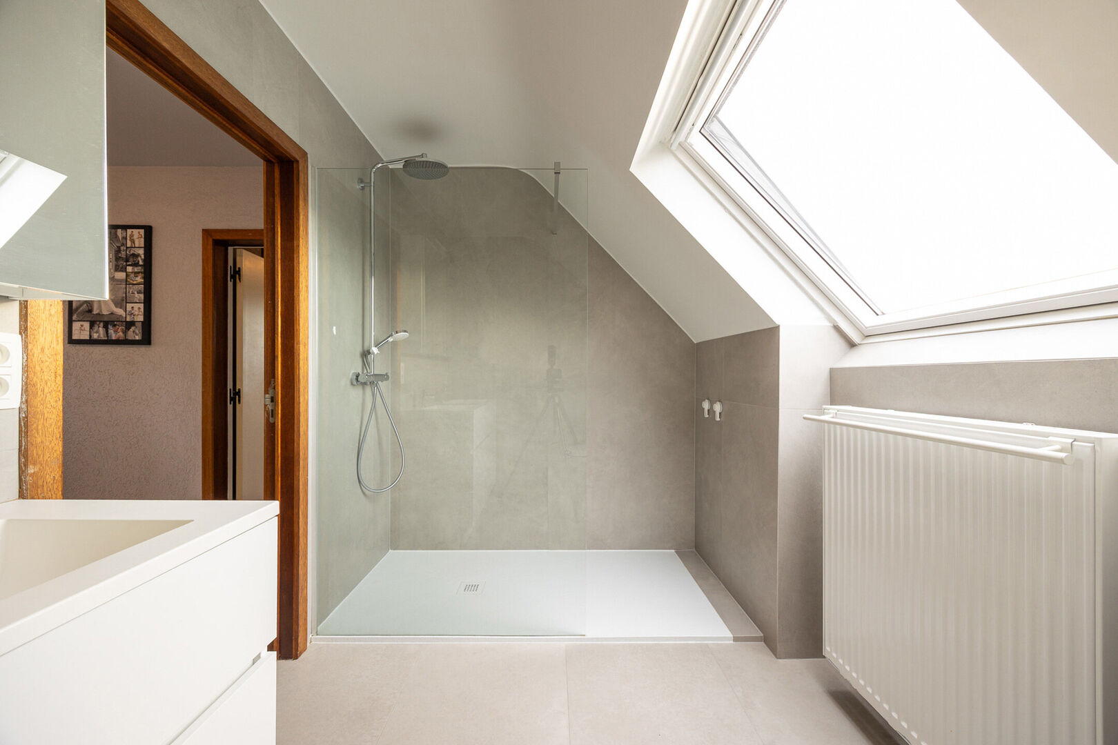Op de eerste verdieping ontdek je drie volwaardige slaapkamers en een volledig gerenoveerde badkamer met moderne inloopdouche. De 4e kamer is compacter en wordt momenteel gebruikt als thuisbureel.