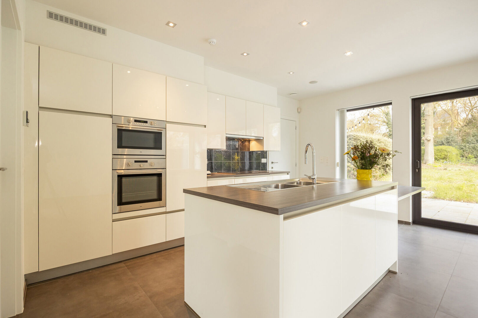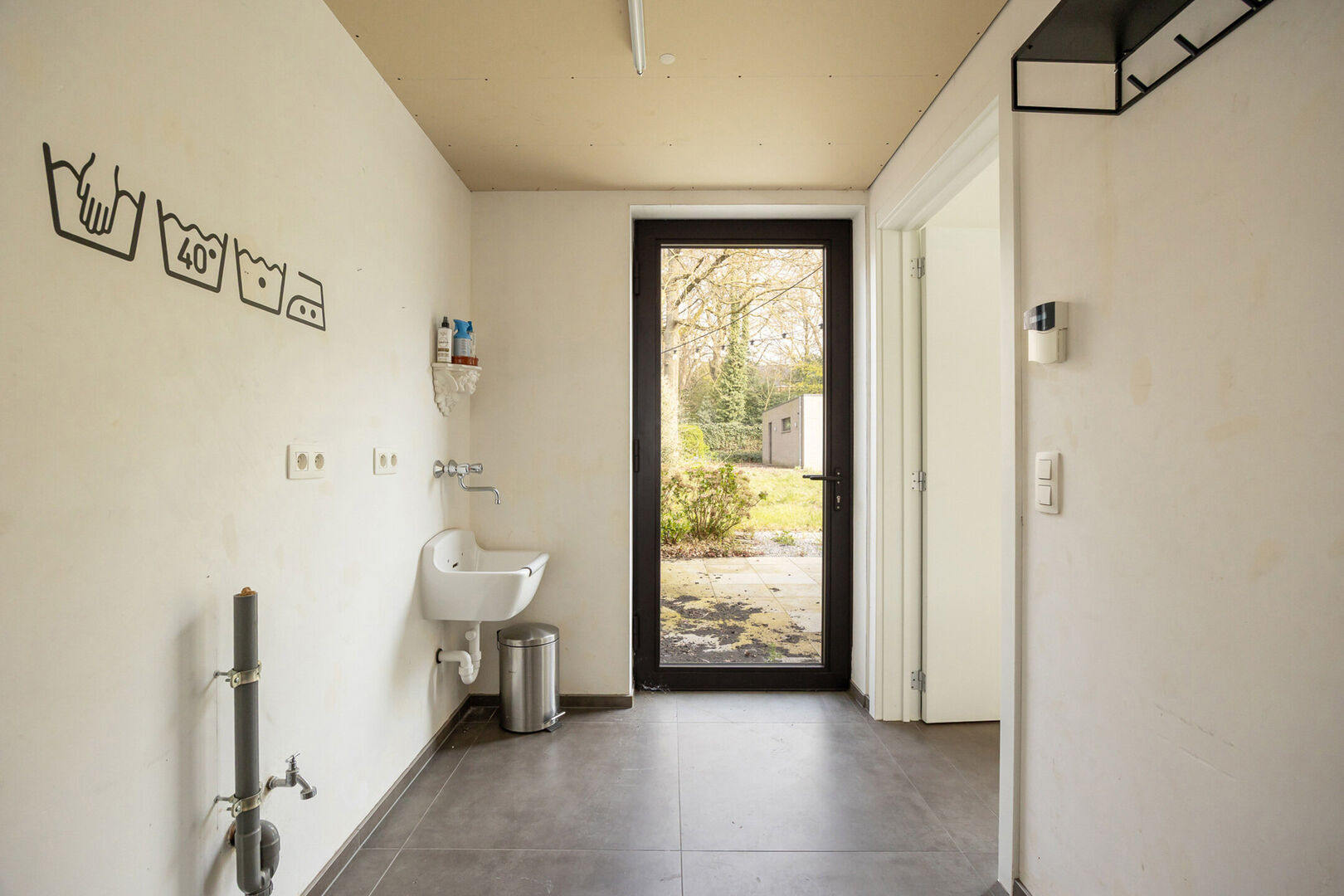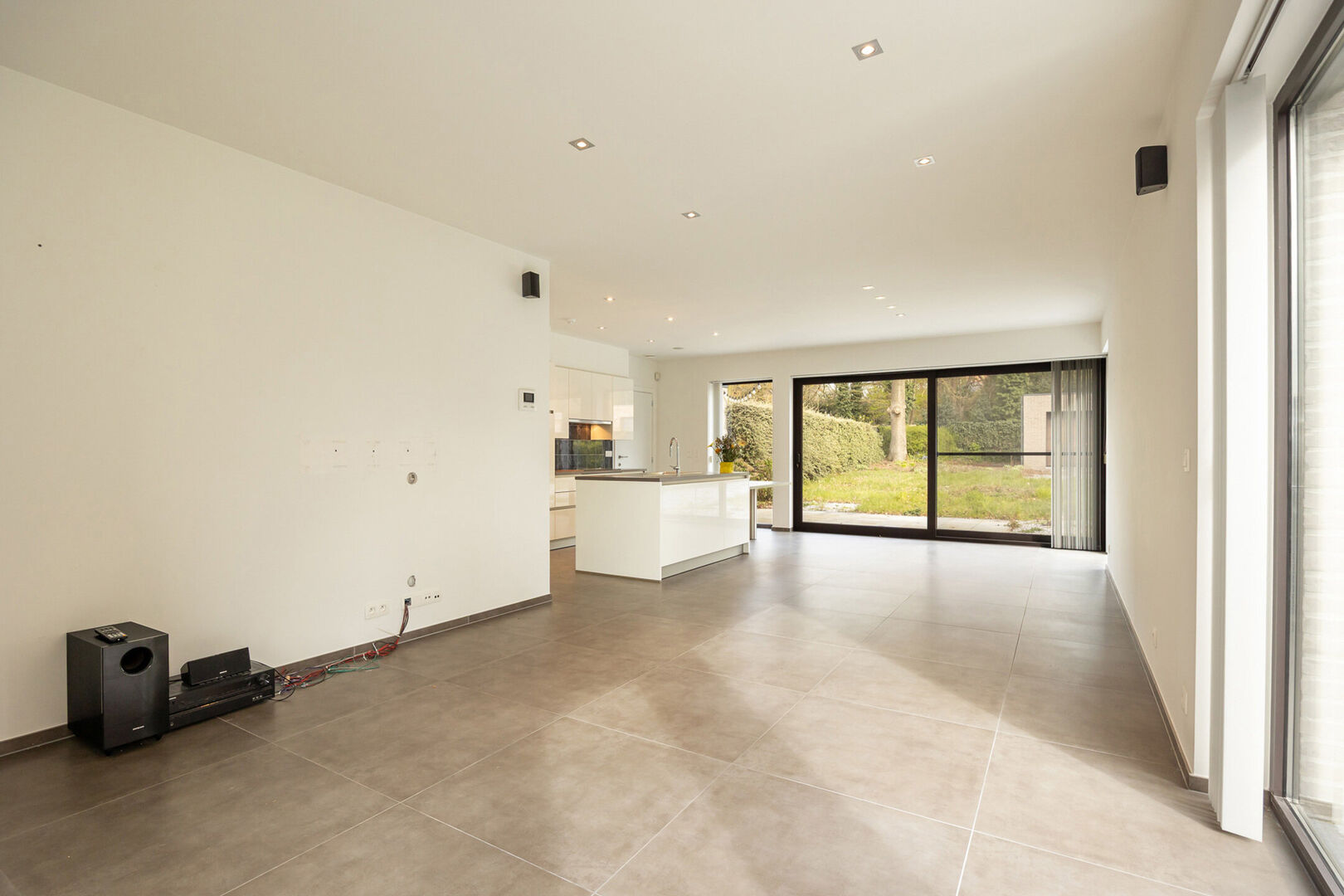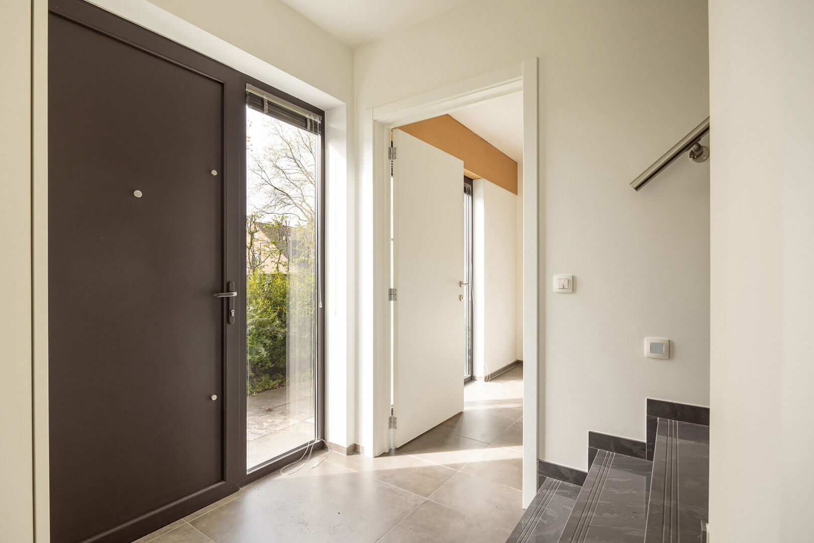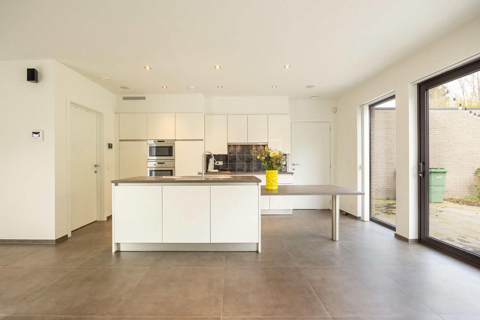Bij het betreden van de woning komt u terecht in de ruime inkomhal met gastentoilet. Van hieruit heeft u toegang tot de leefruimte, eetkamer en kwalitatieve open keuken. Deze ruimte wordt gekenmerkt door een groot schuifraam wat zorgt voor een mooi zicht op de prachtige groene tuin alsook voor een aangename lichtinval.