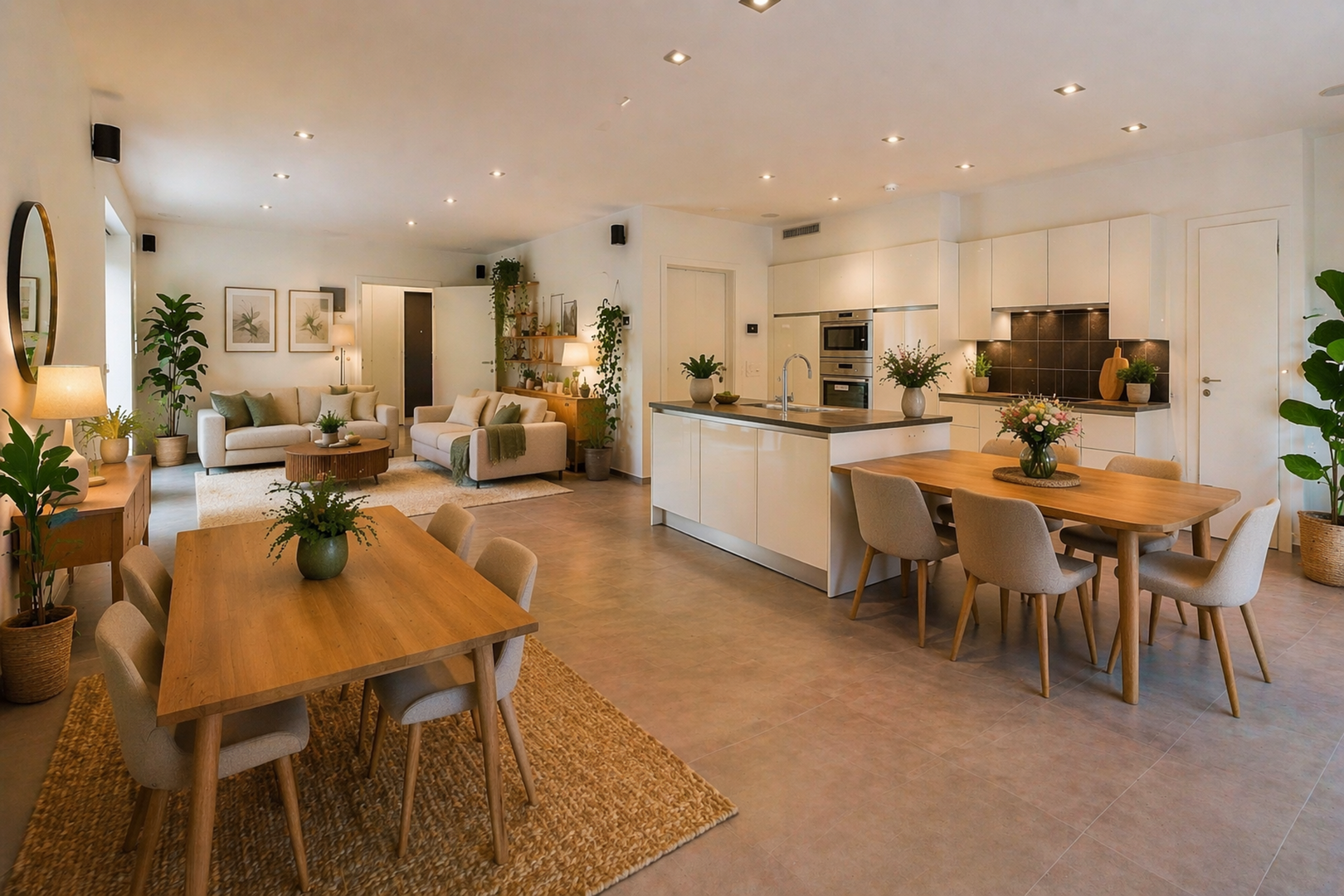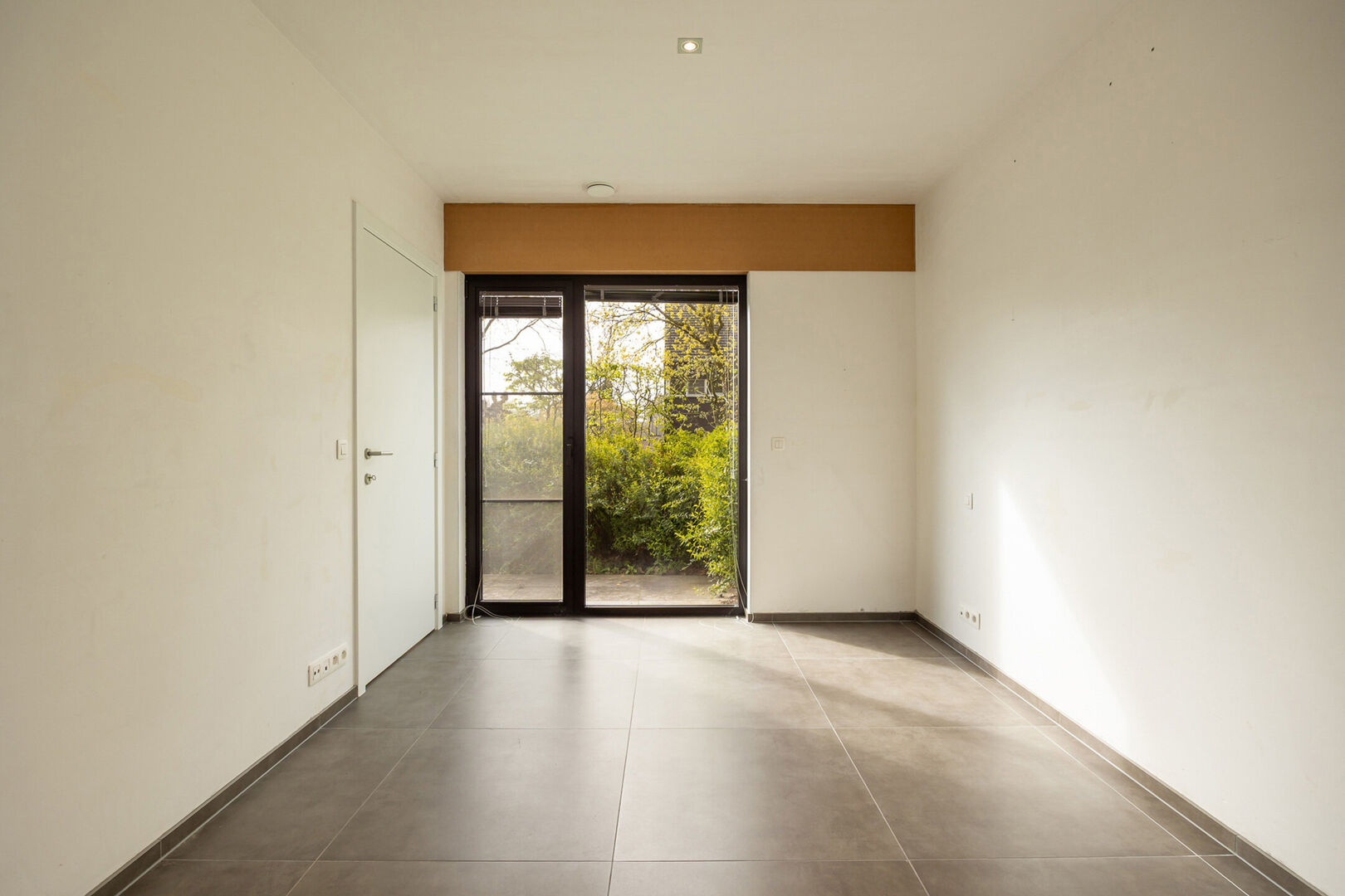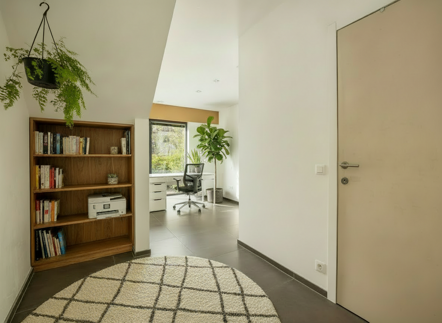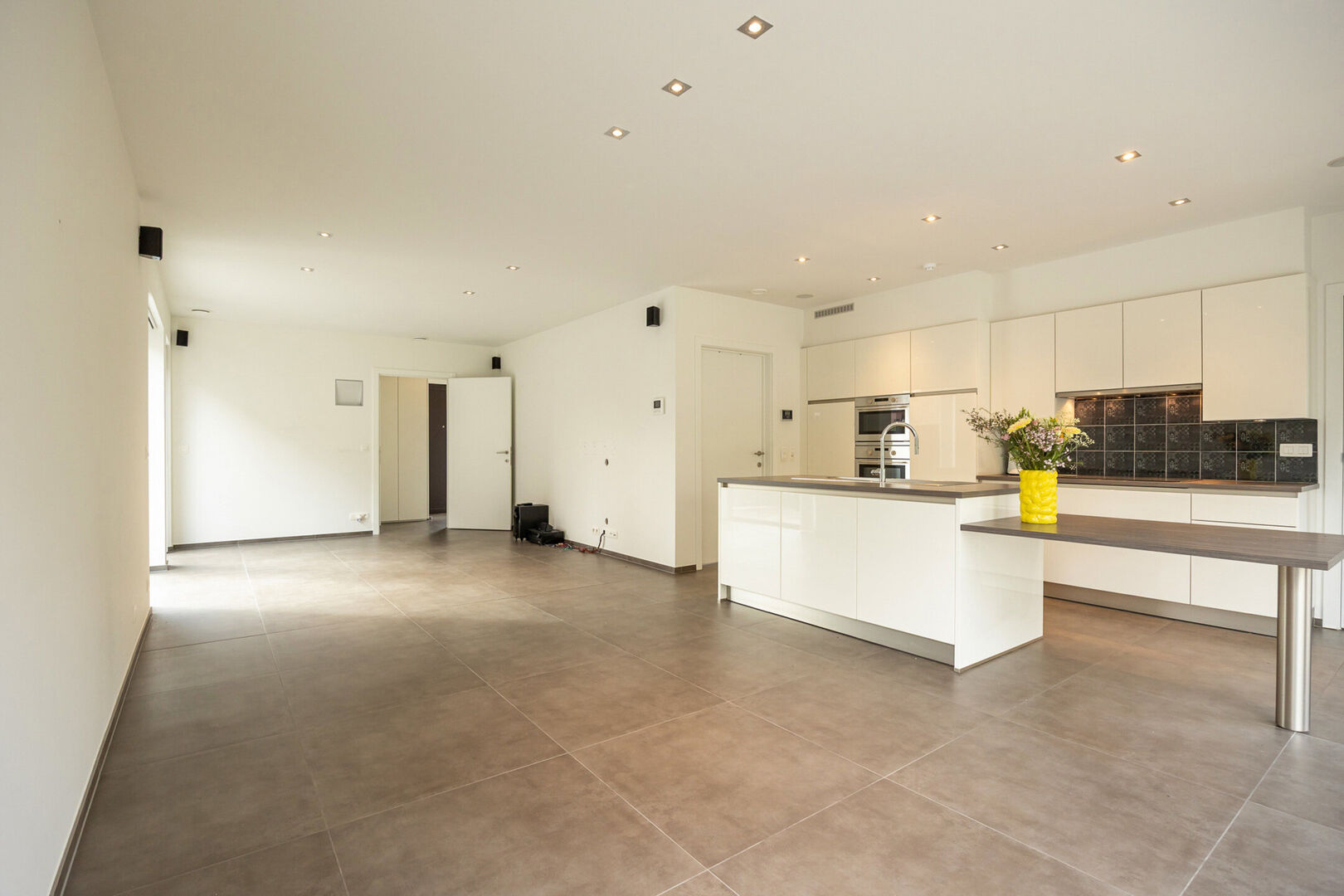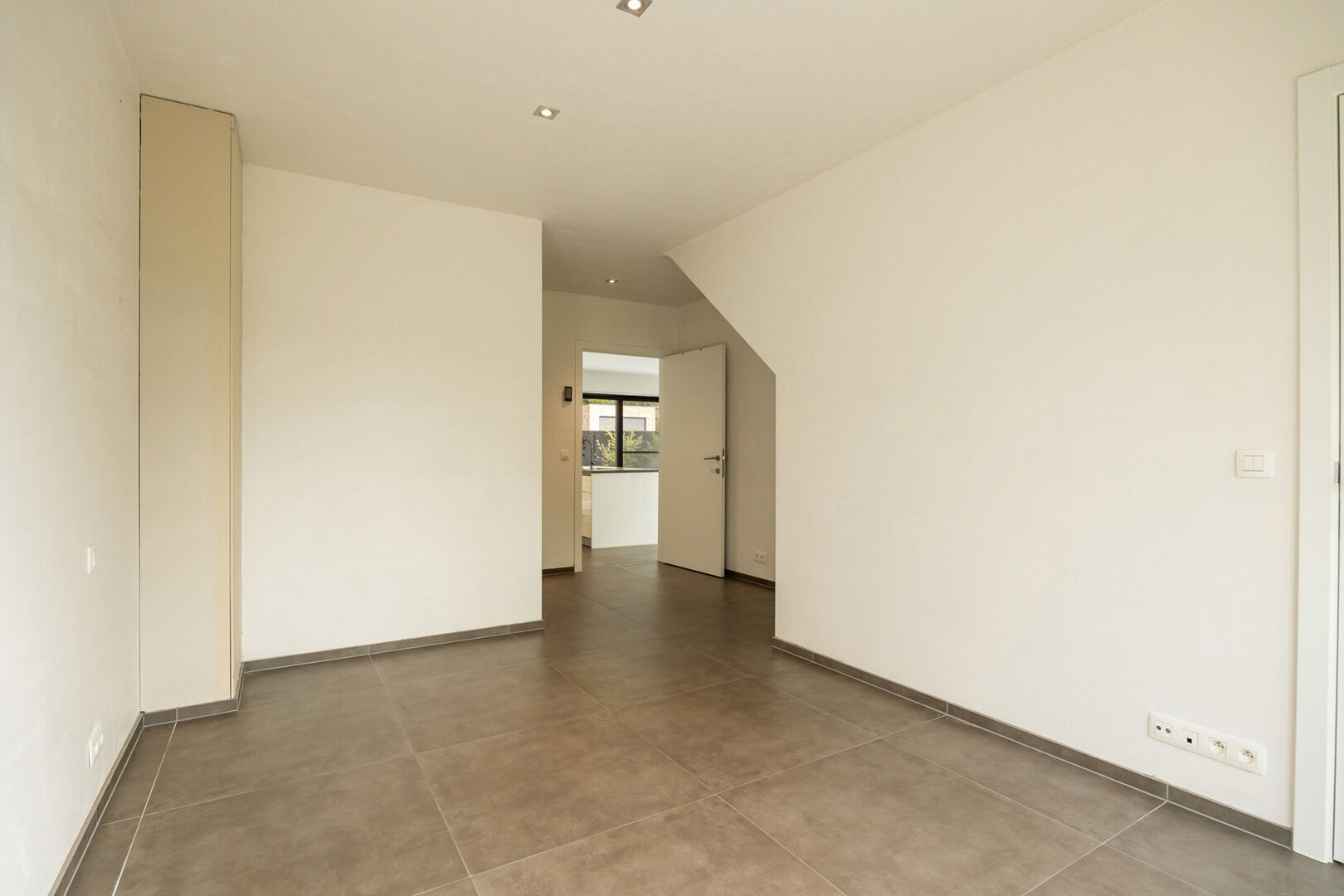 Bij het betreden van de woning komt u terecht in de ruime inkomhal met gastentoilet. Van hieruit heeft u toegang tot de leefruimte, eetkamer en kwalitatieve open keuken. Deze ruimte wordt gekenmerkt door een groot schuifraam wat zorgt voor een mooi zicht op de prachtige groene tuin alsook voor een aangename lichtinval.