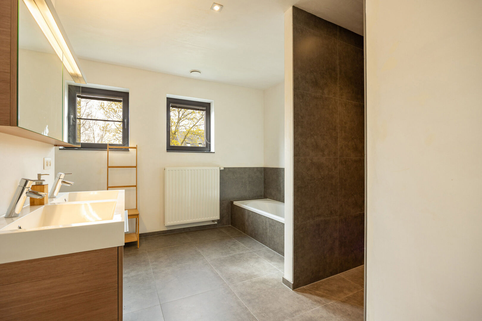 Op de verdieping treffen we drie zeer ruime slaapkamers waarvan één beschikt over extra bergruimte. De badkamer is ingericht met inloopdouche, ligbad en dubbele lavabo.