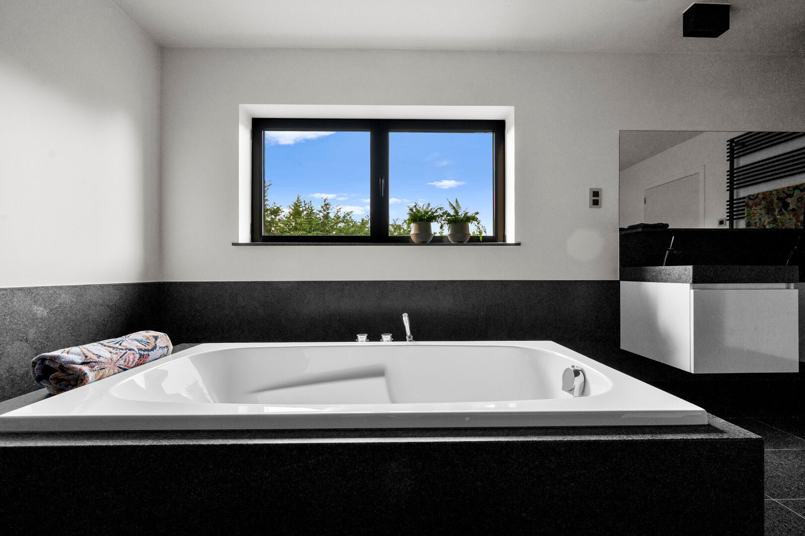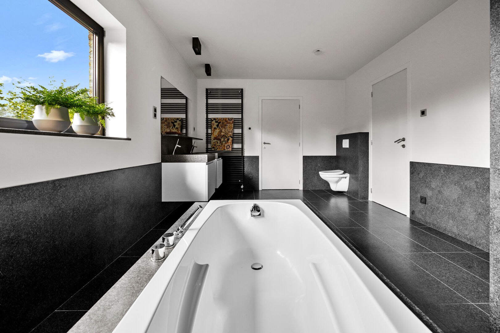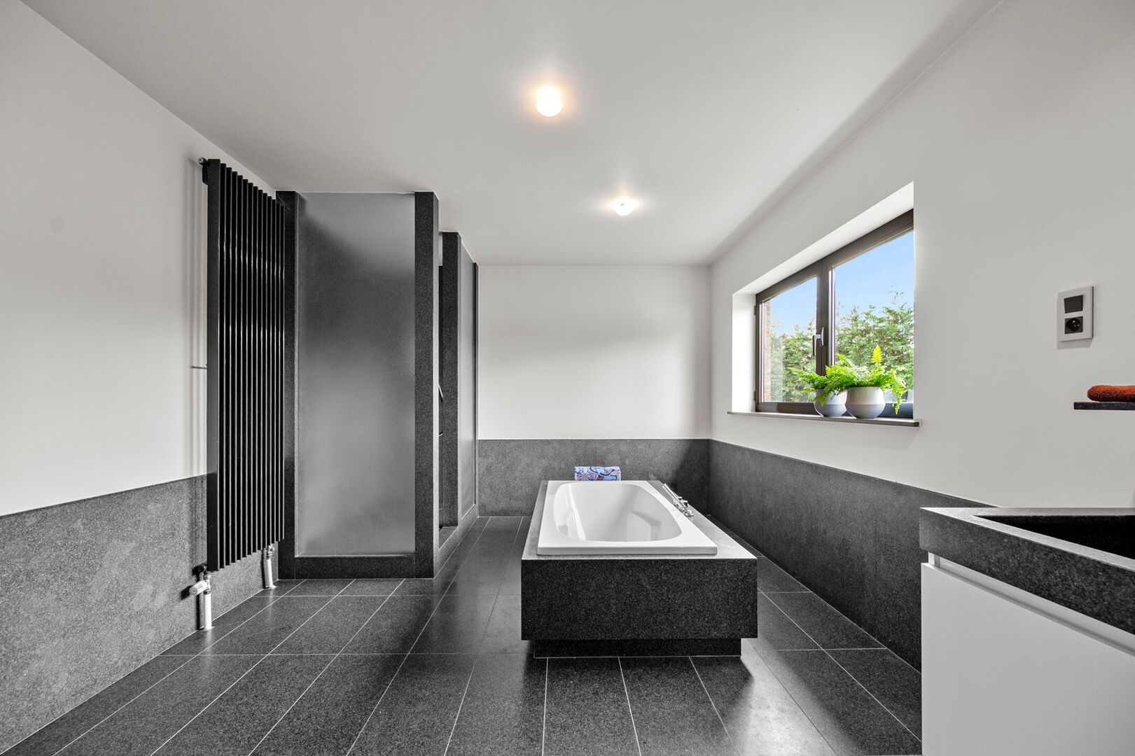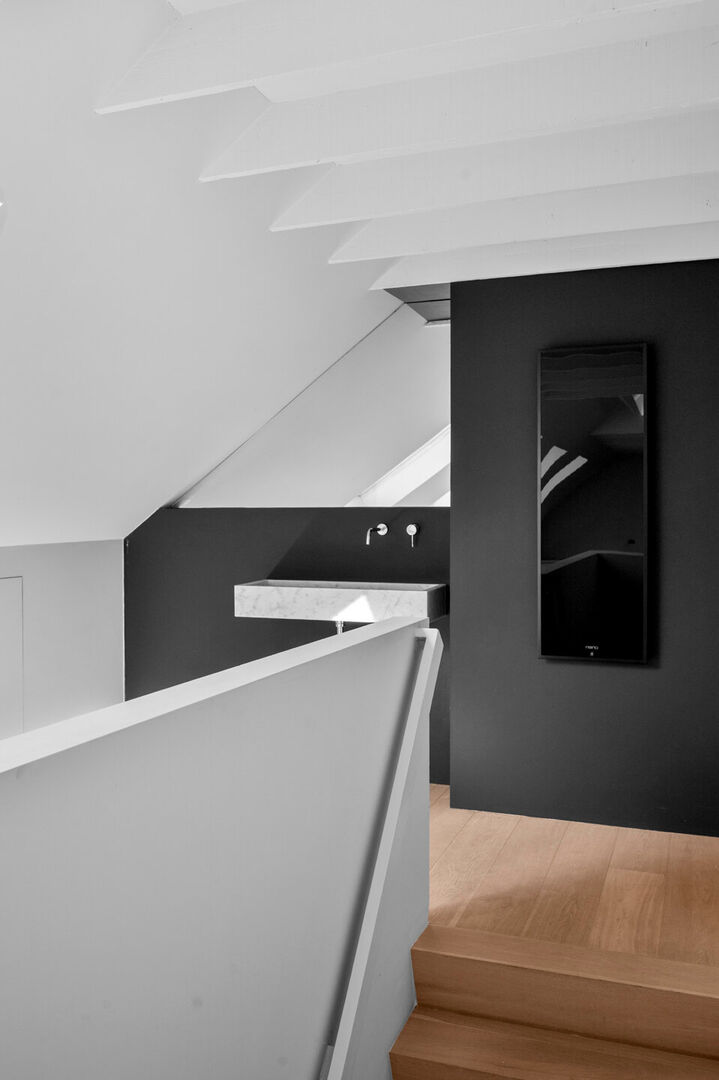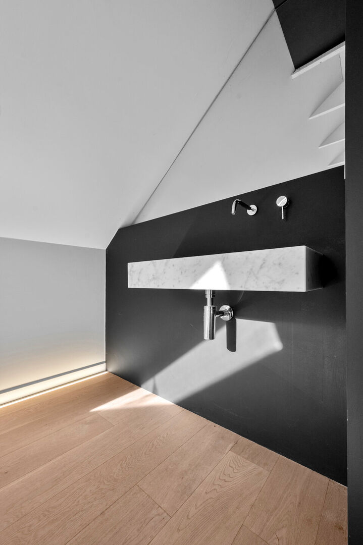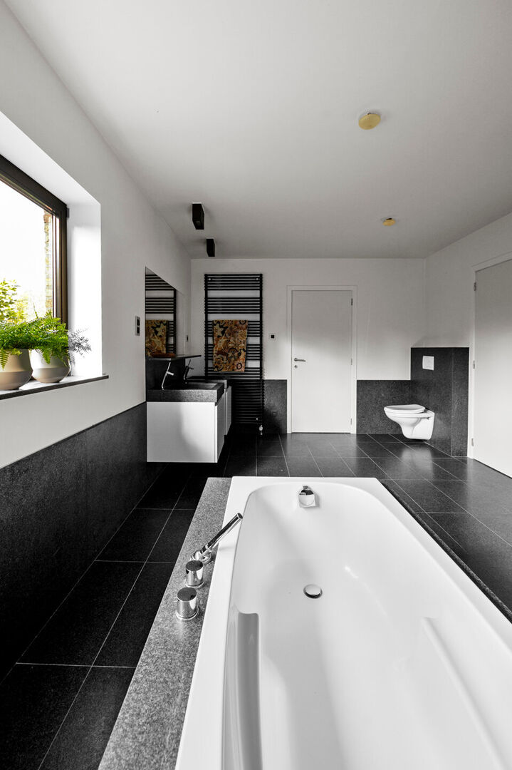 Op de eerste verdieping bevinden zich drie royale slaapkamers. De masterbedroom beschikt tevens over een dressing. De badkamer, fraai in natuursteen, biedt zowel een instapdouche als een vrijstaand bad voor een ultiem wellnessgevoel.