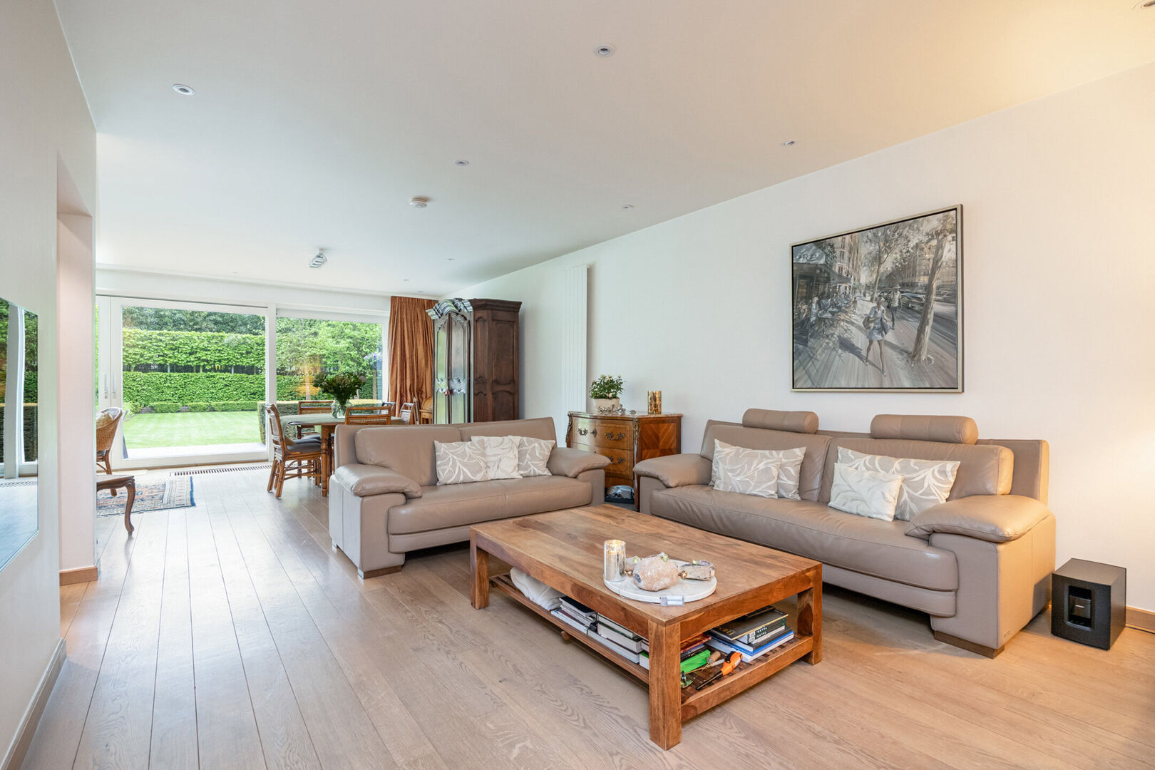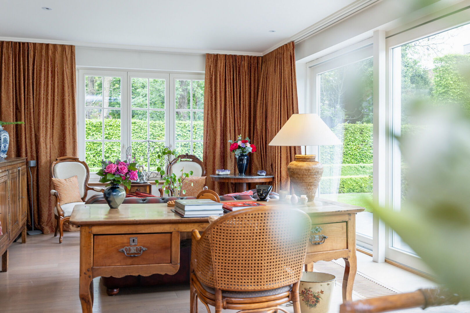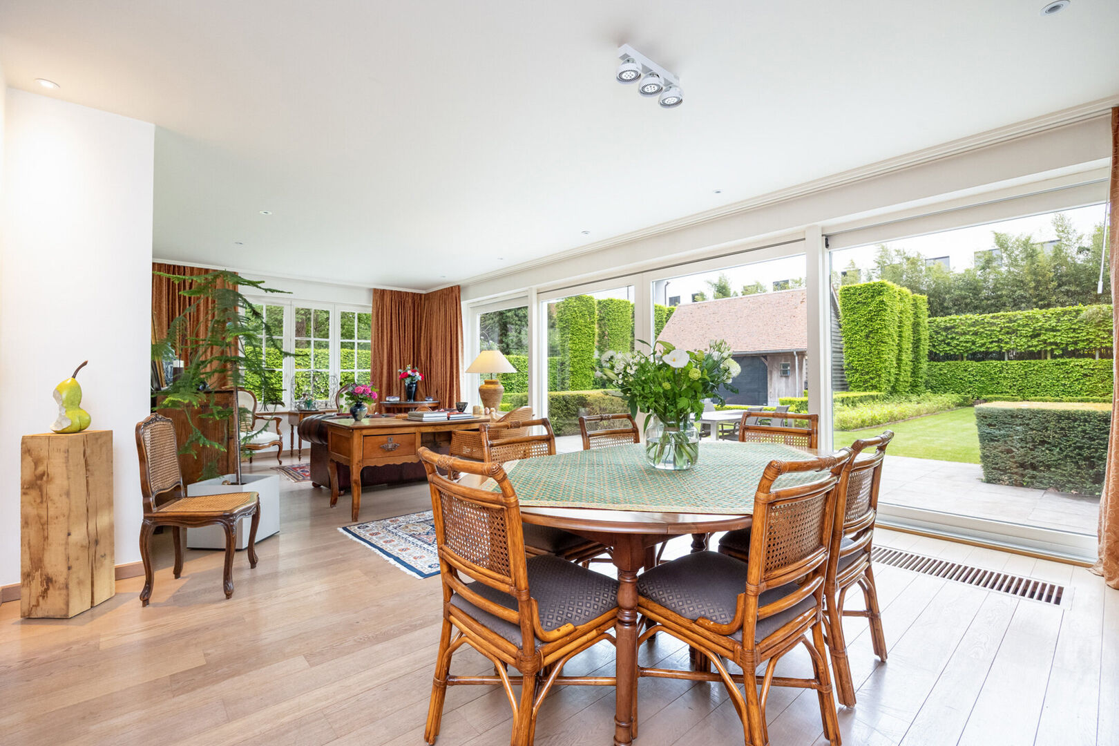 In de ruime eetkamer zorgen de grote raampartijen voor een overvloed aan natuurlijk licht en een panoramisch uitzicht op de fraai aangelegde tuin, met directe toegang tot het terras voor een naadloze verbinding tussen binnen en buiten.