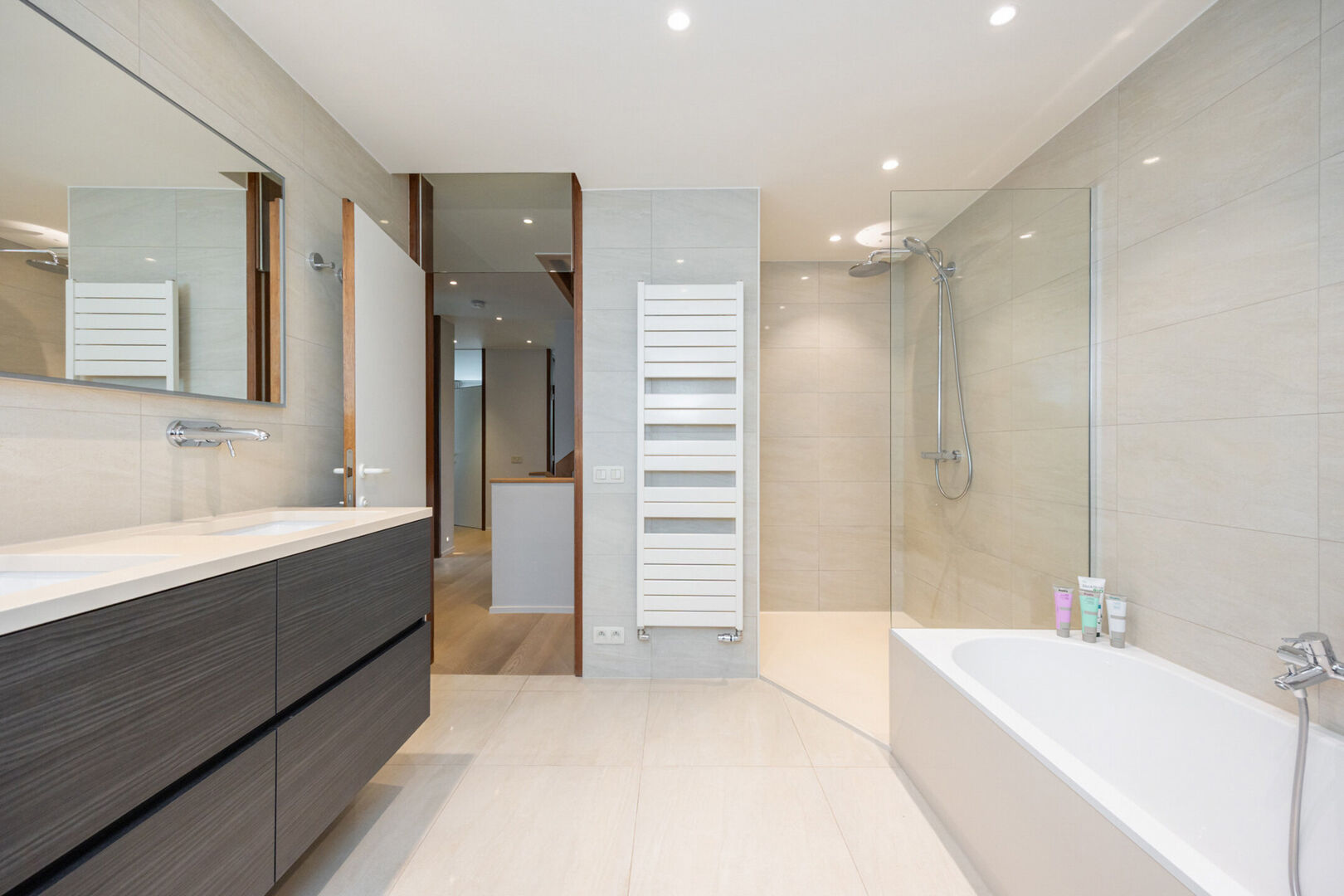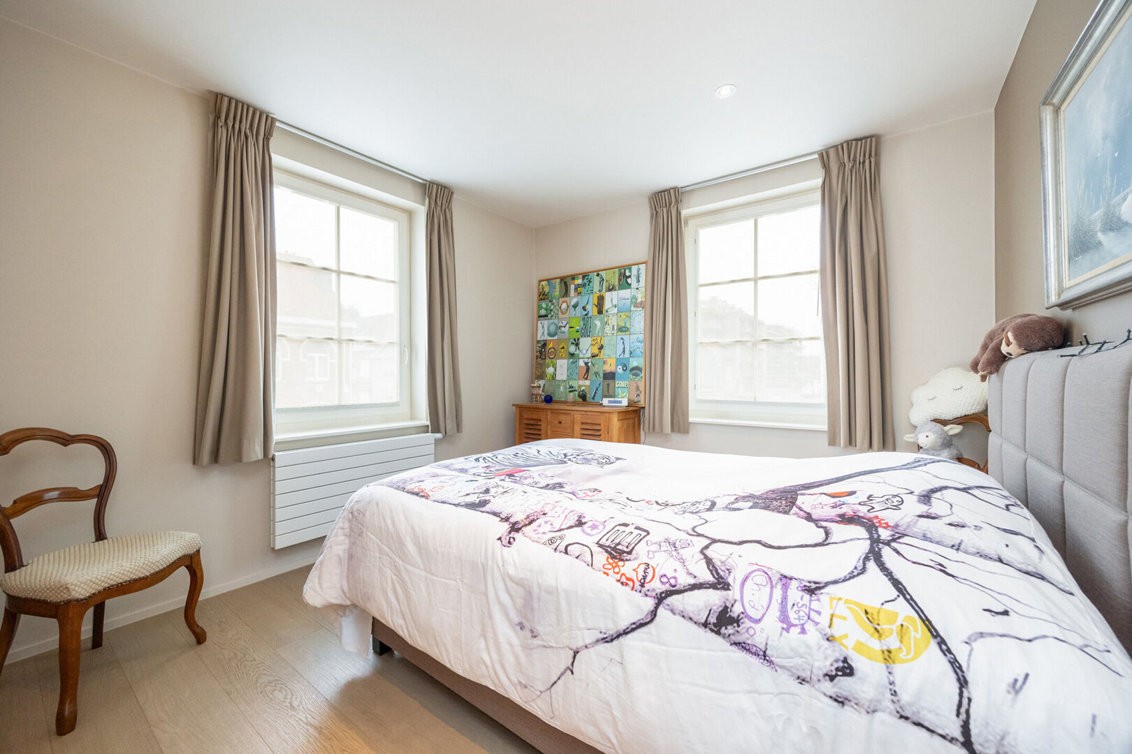 De prachtige eiken trap leidt u naar de eerste verdieping, waar de klasse van deze woning zich ten volle onthult. Hier bevinden zich vier ruime en lichtrijke slaapkamers, afgewerkt met een elegante parketvloer, waarvan drie uitgerust met ingemaakte kasten. De masterbedroom is uitgerust met een eigen badkamer, waar een composiet badkamerblad, de inloopdouche en lavabo de ruimte een verfijnde, luxueuze uitstraling geven. De tweede badkamer, in dezelfde stijl, is voorzien van een inloopdouche, ligbad, dubbele lavabo en toilet. Er is ook een bijkomend toilet op het verdiep aanwezig eveneens afgewerkt in composiet.