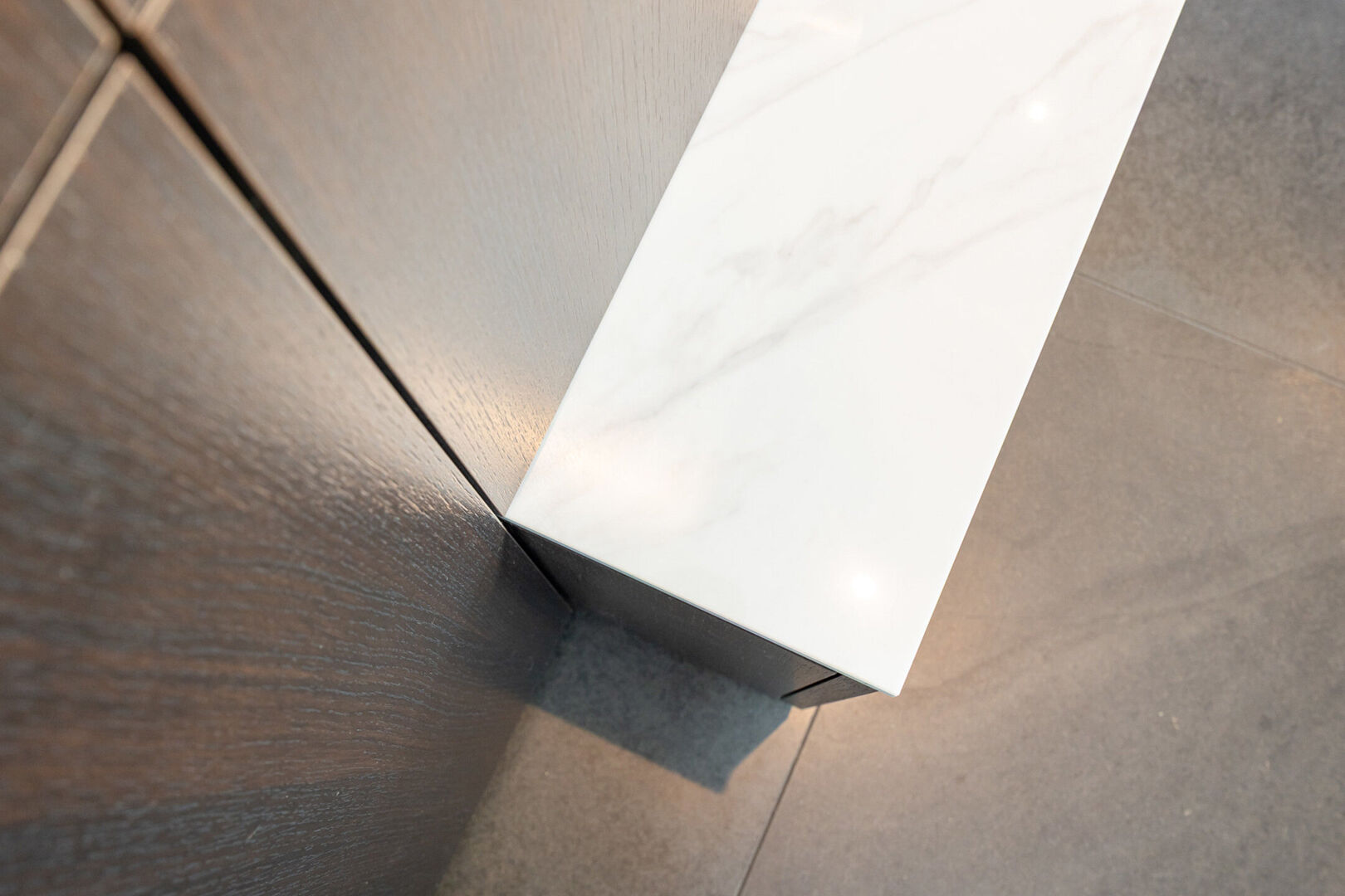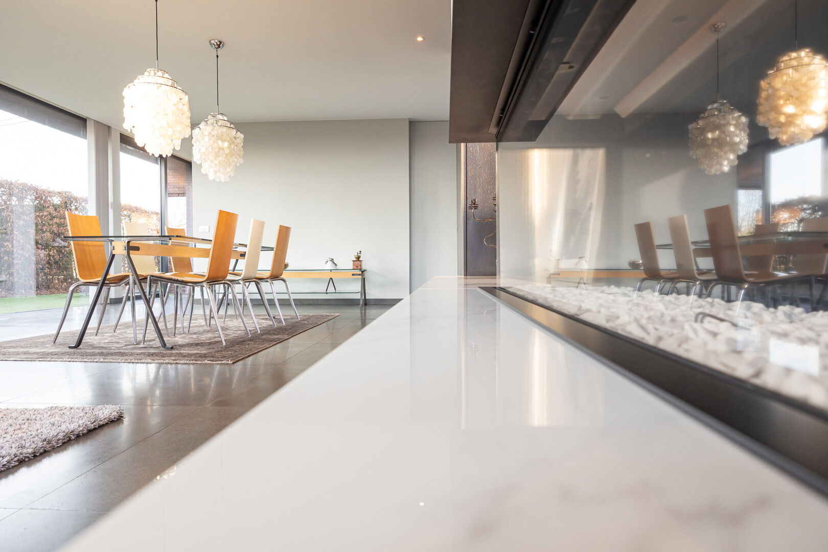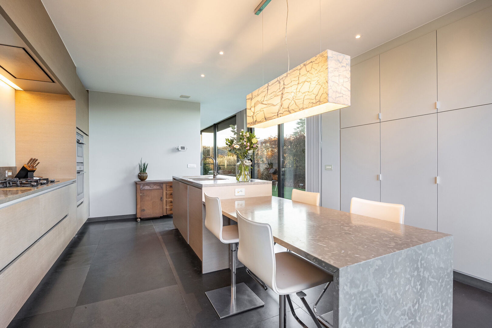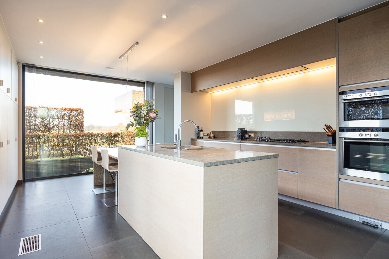 Rechtsom bereik je de keuken, deze is super praktisch met ruime werkbladen in natuursteen en voorzien van alle moderne apparatuur. Er zijn grote raampartijen, zeer veel kastruimte en een gezellige eettafel.