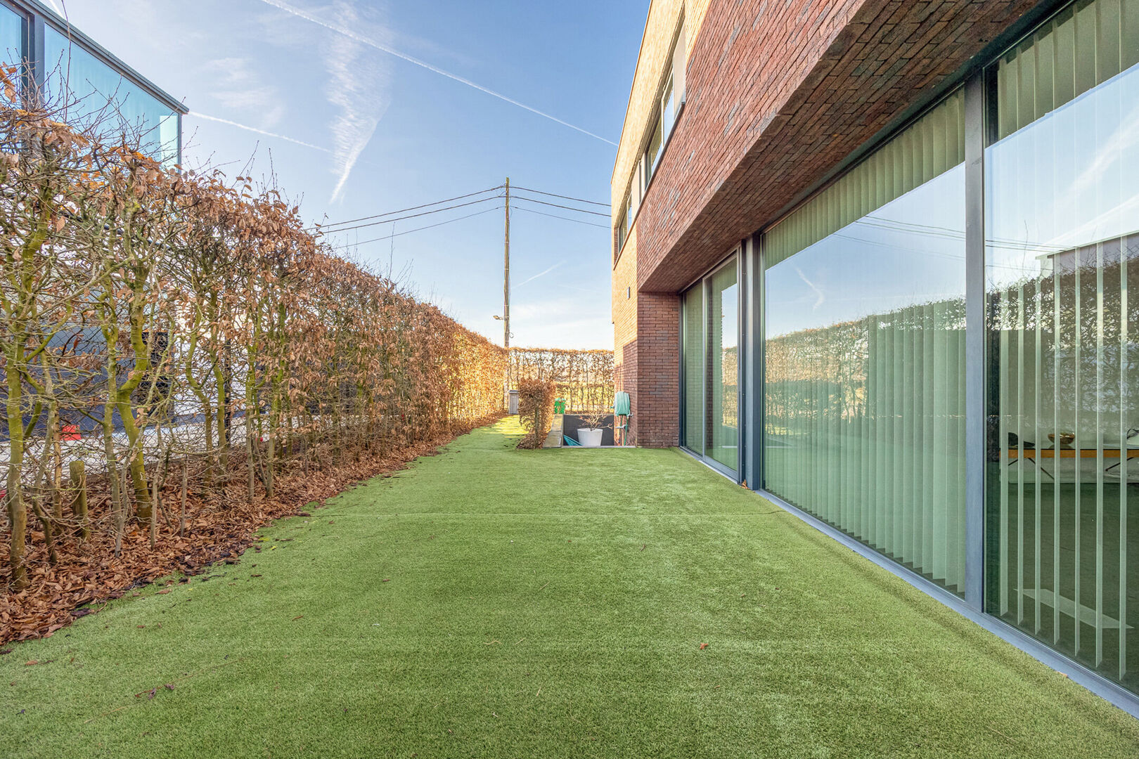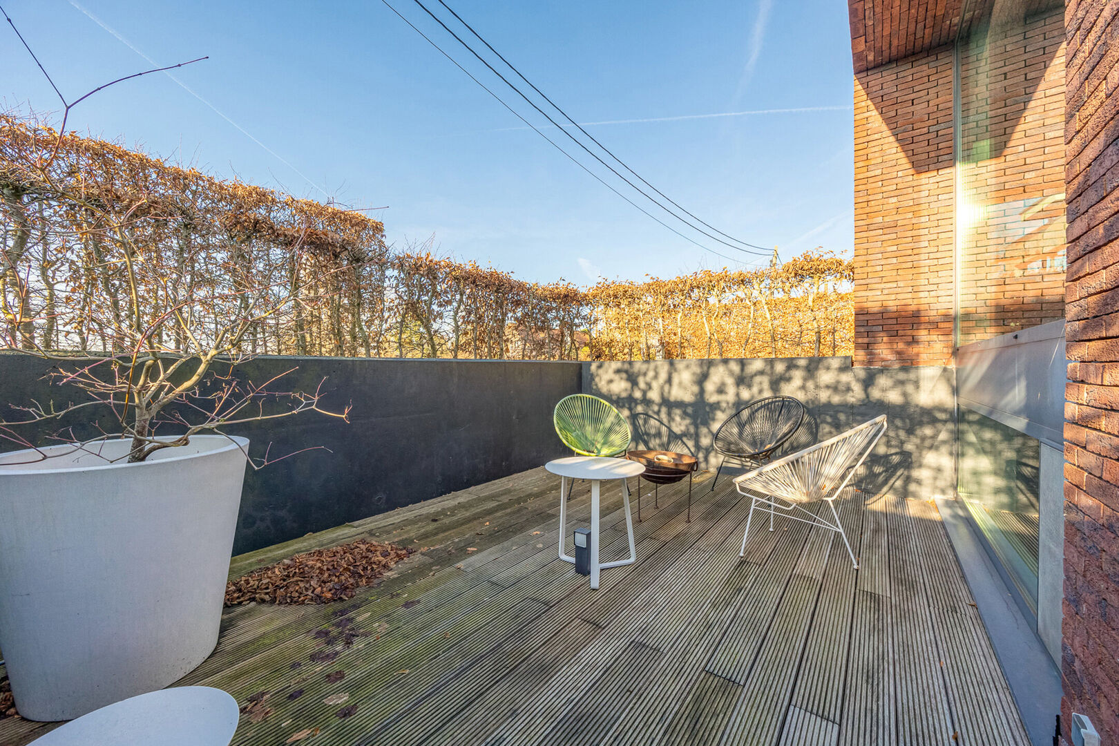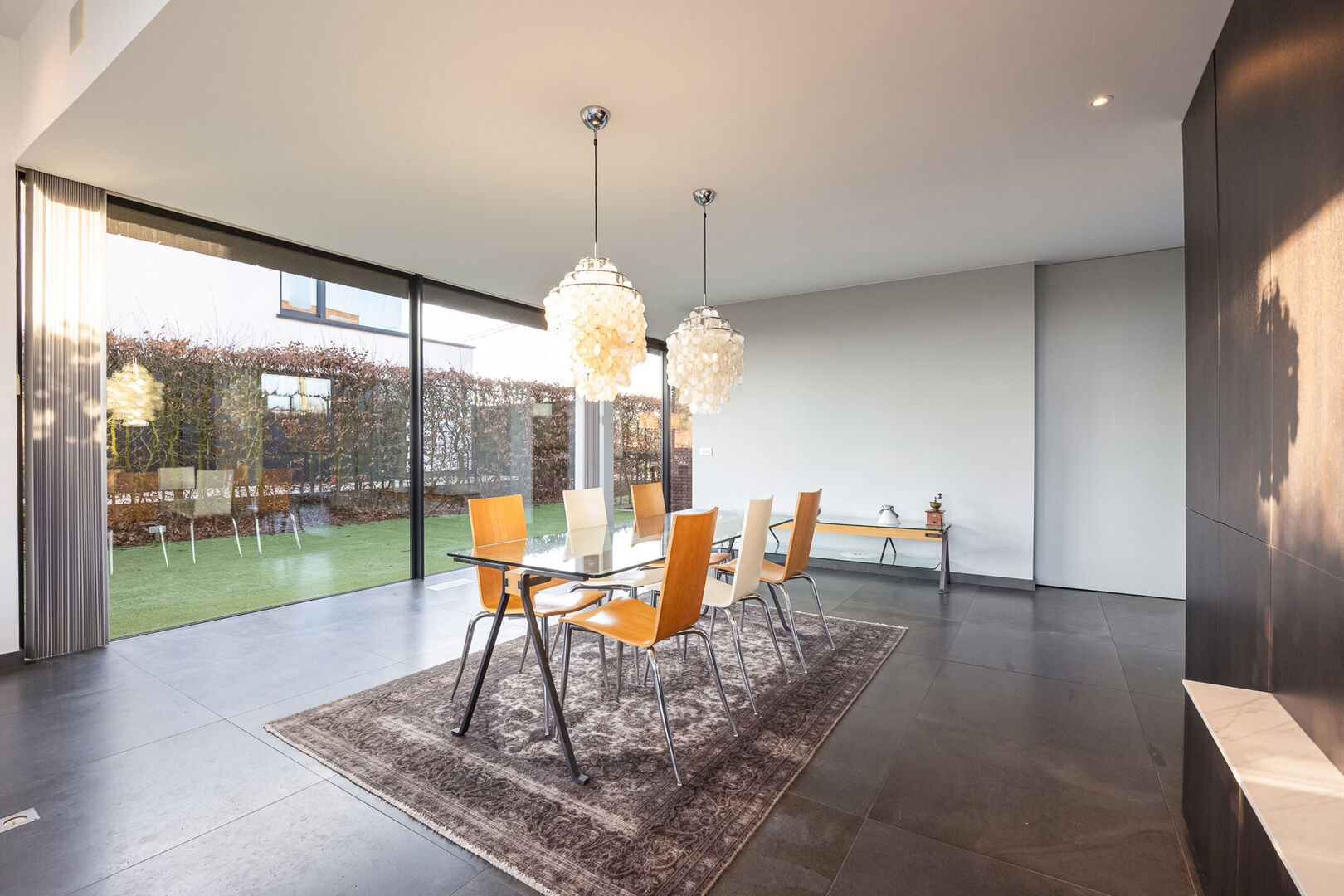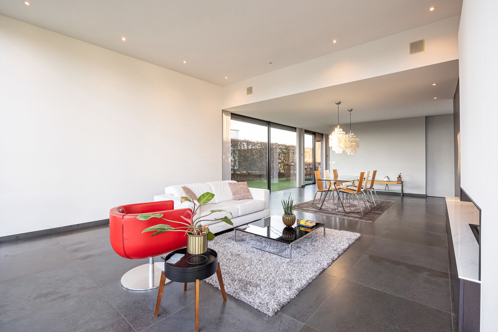 Langs de linkerzijde treffen we de grote leefruimte met plaats voor een eet-en zitgedeelte. De gashaard zorgt voor extra sfeer. Ook hier zorgen de vele grote ramen voor een open gevoel.