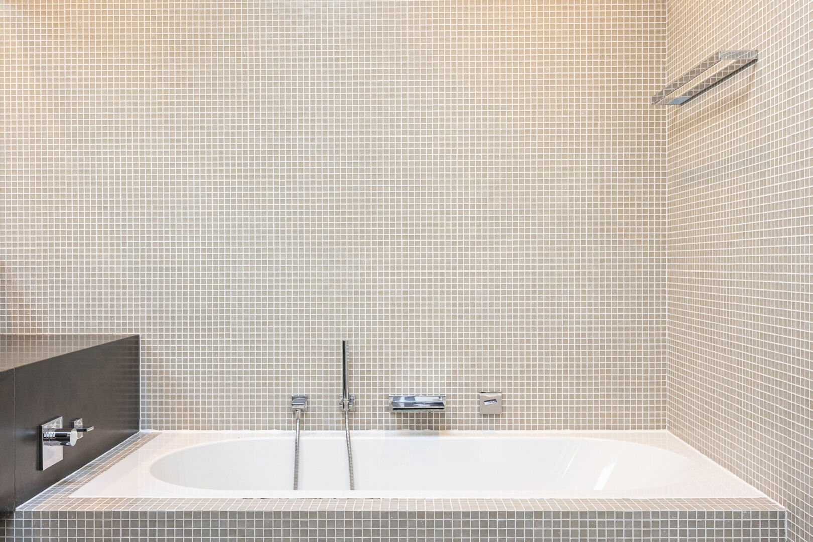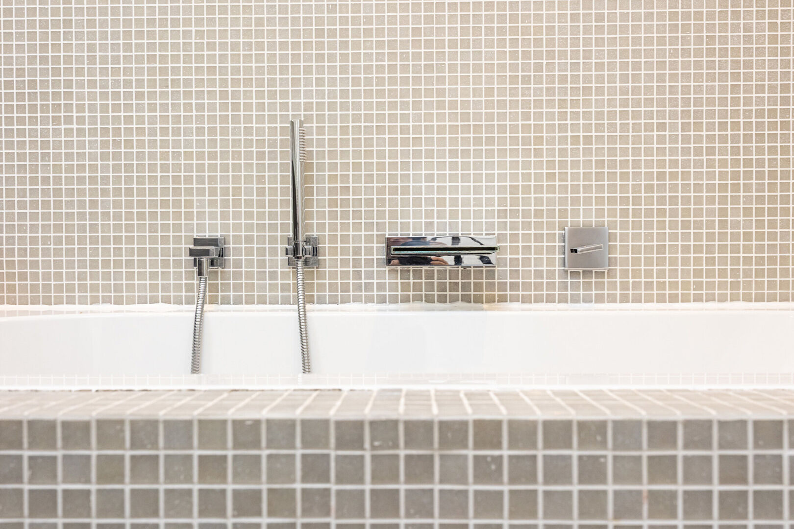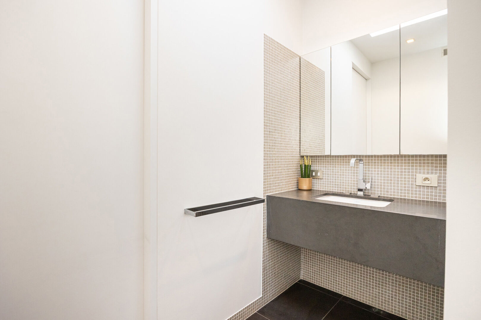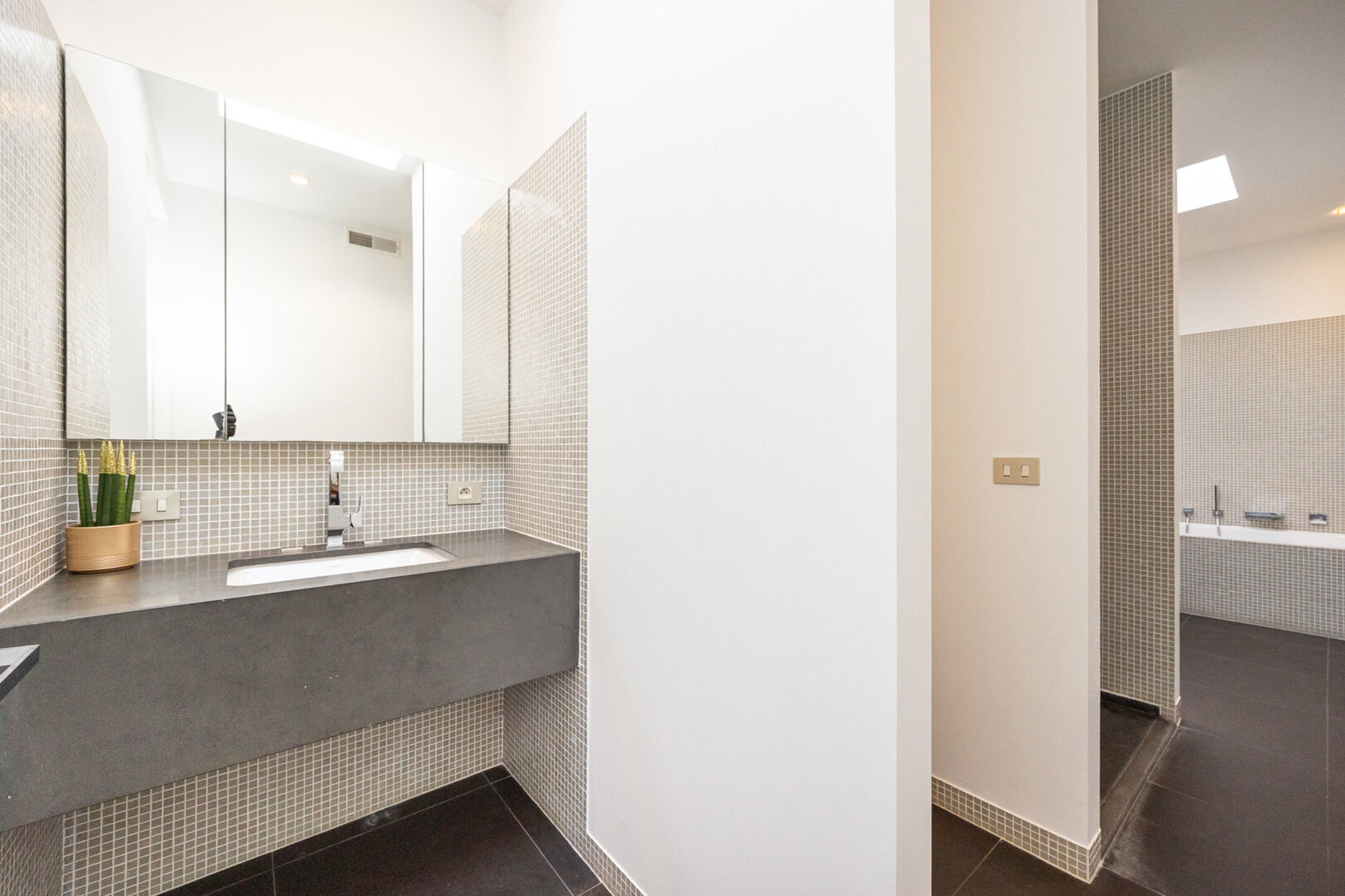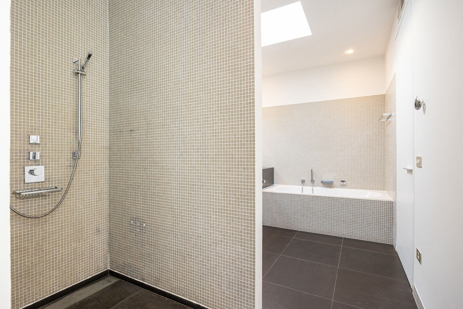De badkamer kan langs 2 zijden betreden worden en beschikt over een bad, een dubbele lavabo, een toilet, een grote inloopdouche en een 3e aparte lavabo.
