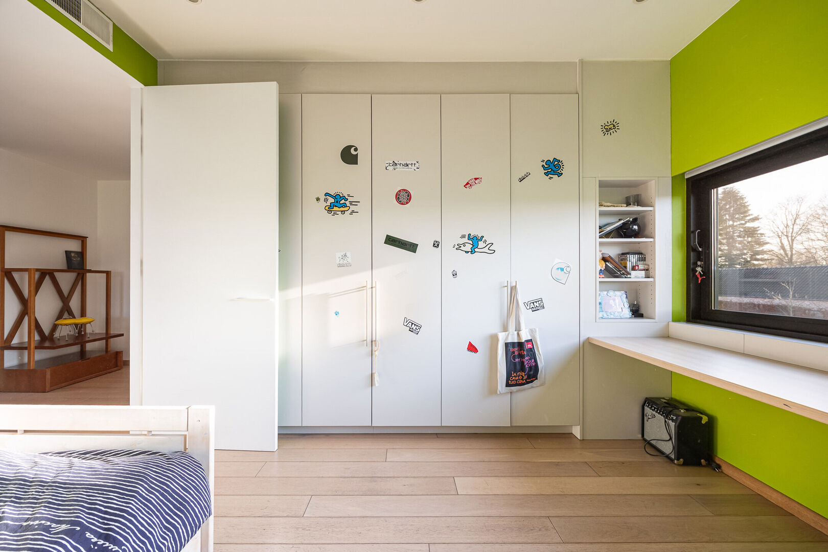 Je komt de woning binnen via een ruime inkomhal met heel wat ingemakte kasten, deze vormt de circulatiespil van het huis.