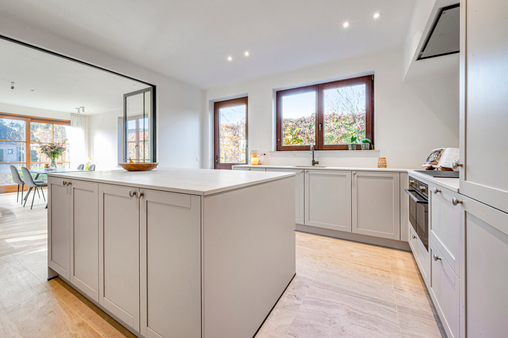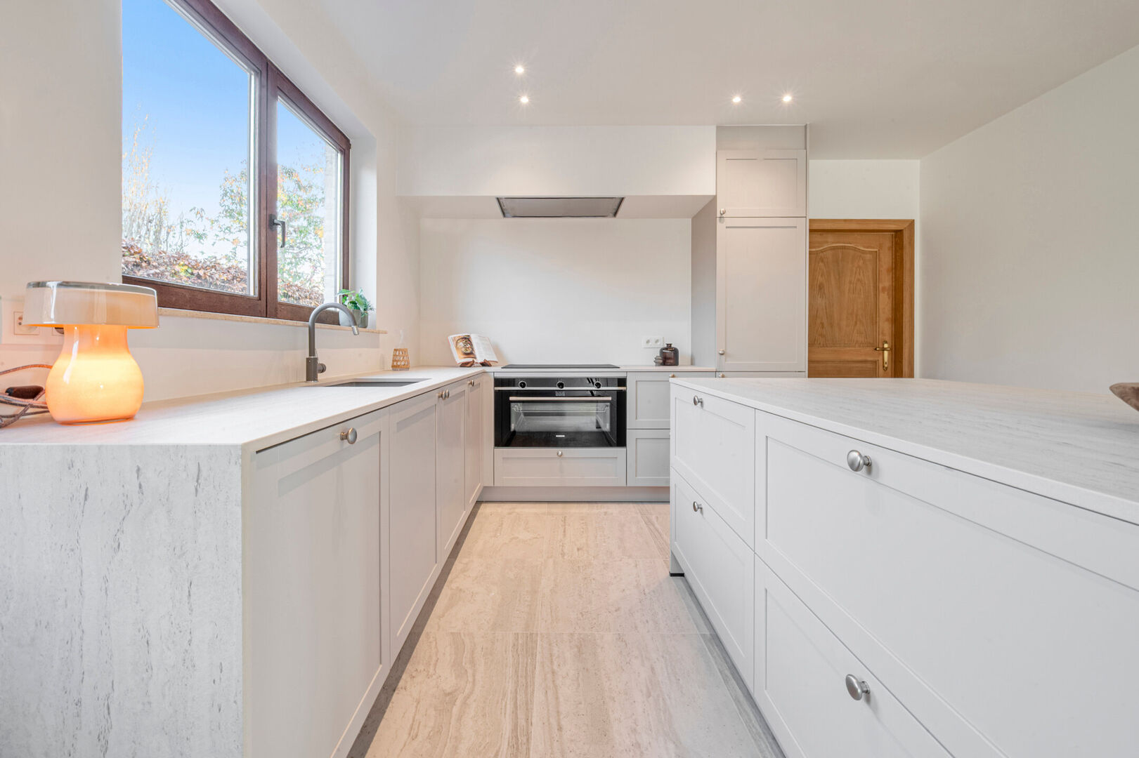 Via de stijlvolle stalen deuren komt men terecht in de keuken. Deze is voorzien van heel veel kastruimte en een eiland. De bouwheer koos voor een inductiekookplaat, een heel grote oven, vaatwas en ijskast van hoogstaande kwaliteit. De vloer in travertinlook is mooi, tijdloos en gemakkelijk in onderhoud.