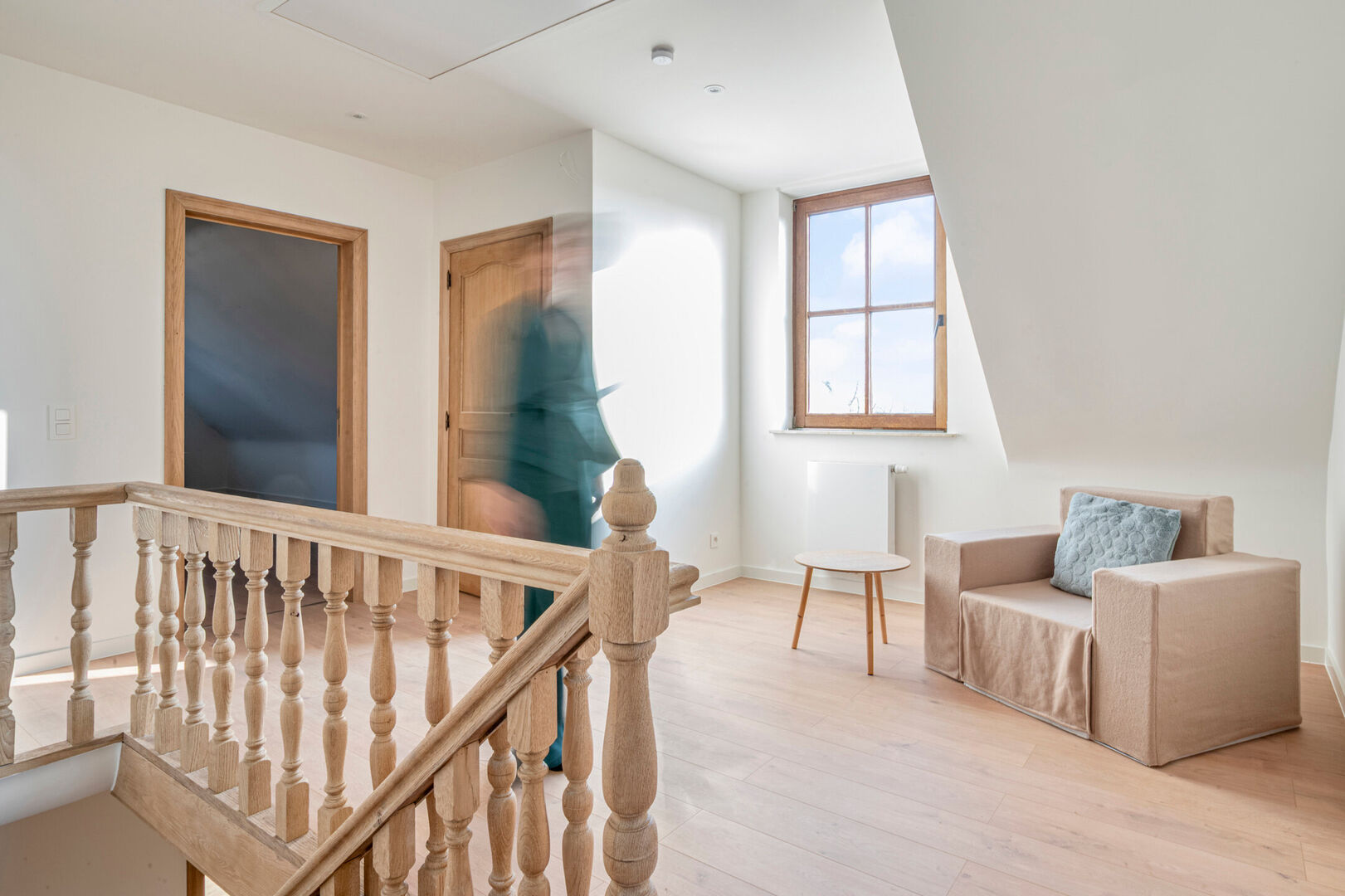 Via de gezandstraalde trap in eik bereikt men de overloop op de verdieping.